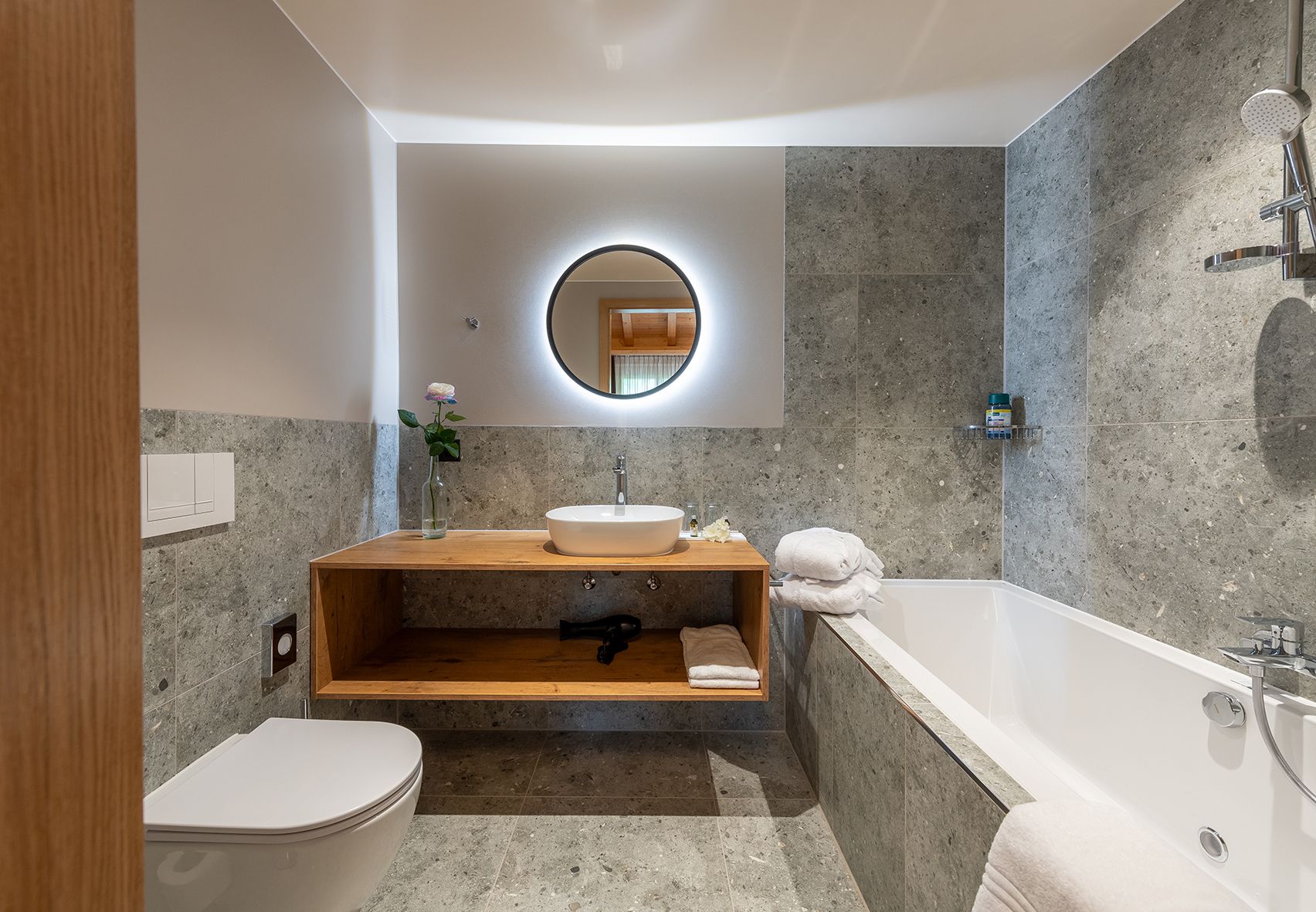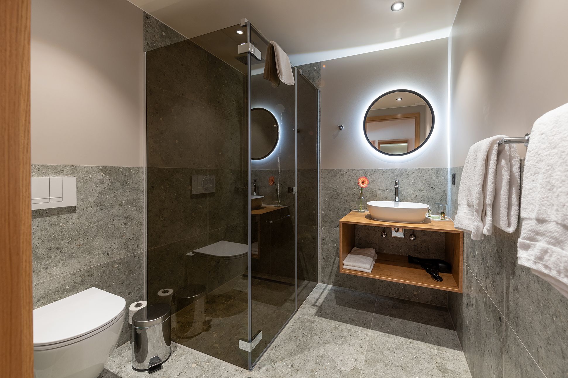 Ein stilvolles grosses Bad mit beleuchteter Sprudel-Badewanne, Waschbecken und WC. Ein zweites Bad-Zimmer mit eleganter Glaswand-Dusche, Waschbecken und WC. 2 Haartrockner.