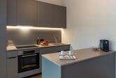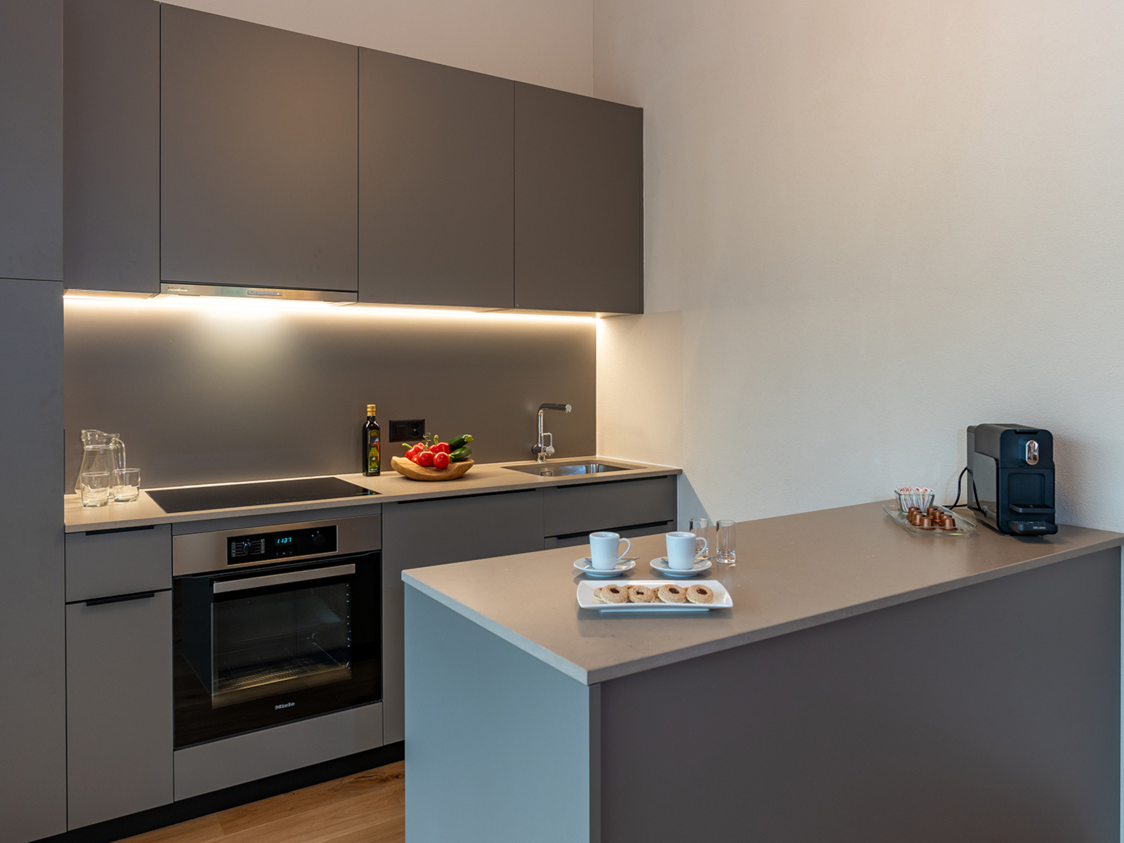 Spülmaschine, Induktions-Herd mit 4 Platten und Dampfabzug, Backofen, Kühlschrank mit Gefrierfach - alles Miele-Geräte -, Kaffee-Kapselmaschine, Toaster, Wasserkocher, Geschirr/Gläser/Küchenzubehör für 6 Personen.