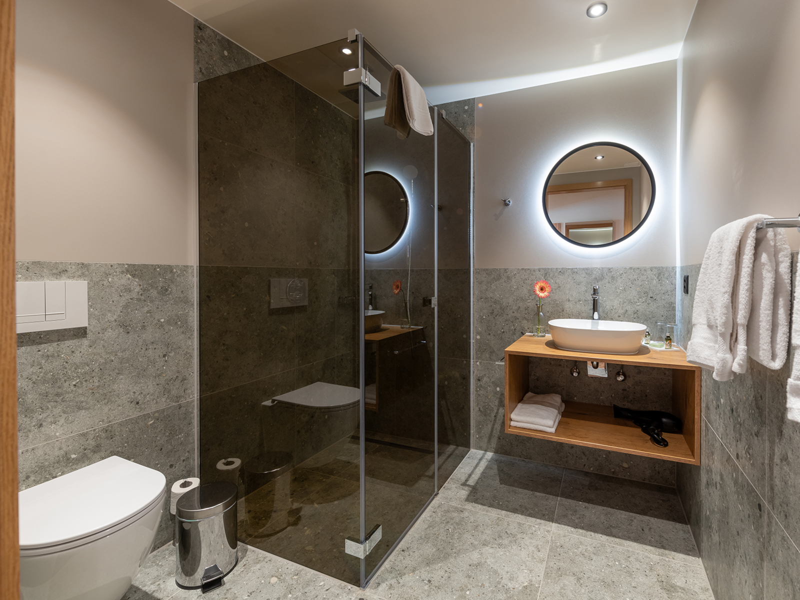 Ein stilvolles grosses Bad mit beleuchteter Sprudel-Badewanne, Waschbecken und WC. Ein zweites Bad-Zimmer mit eleganter Glaswand-Dusche, Waschbecken und WC. 2 Haartrockner.