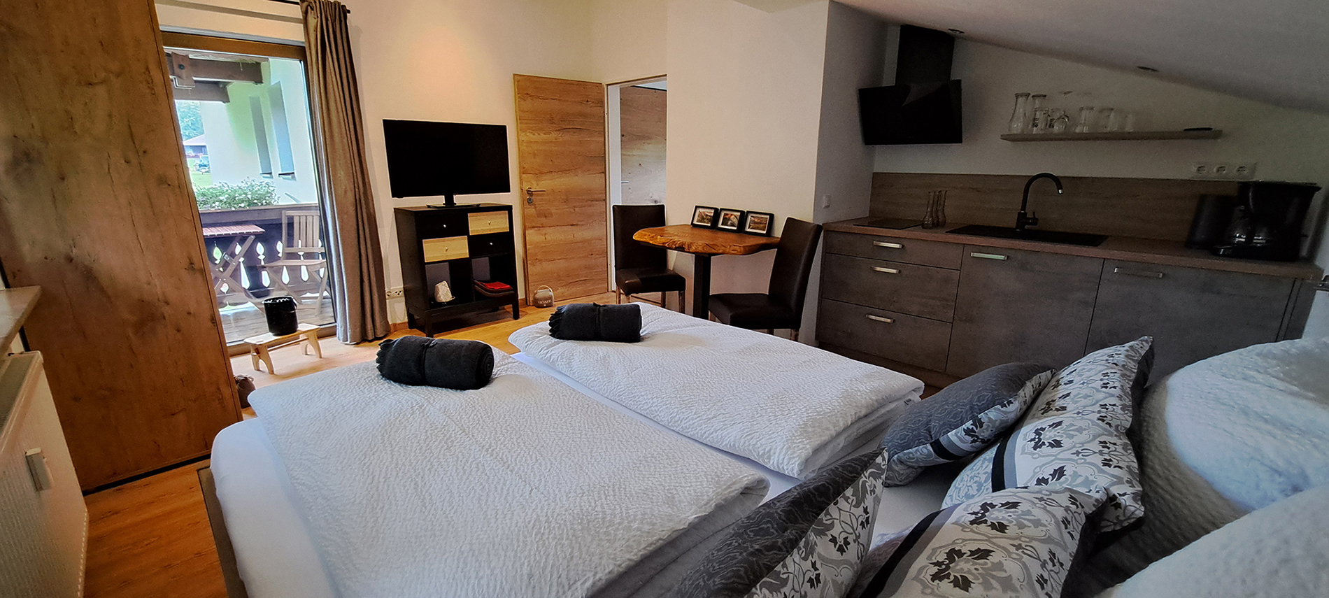 Unser Haus liegt inmitten von saftigen Wiesen, Wäldern und Bergen. Das neu renovierte Apartment verfügt für bis zu 2 Personen über ein massives Holzbett (160 x 200 cm) im Wohn/Schlafbereich- Flachbildfernseher- kostenloser WLAN/Nutzung - einer gut ausgestatteten Küchenzeile mit Kühl/Gefrierkombi, Induktionskochfeld, Kaffeemaschine, Wasserkocher und Toaster - ein modern ausgestattetes Badezimmer mit Fußbodenheizung, Regendusche und Haartrockner- Handtücher/Geschirrtücher sowie Bettwäsche-, einem Balkon mit herrlichem Bergblick-, Zusatzangebot ist eine kleine Getränkeauswahl (kostenpflichtig).