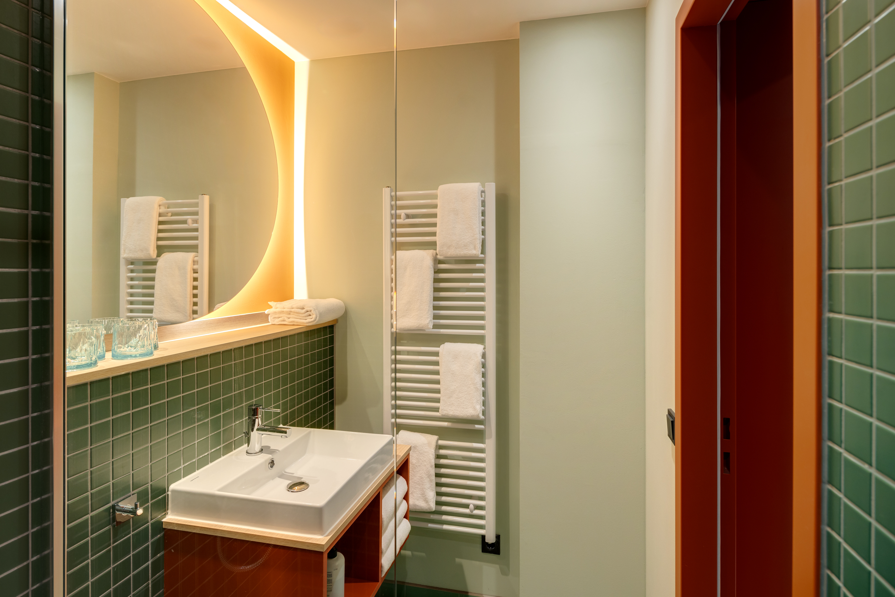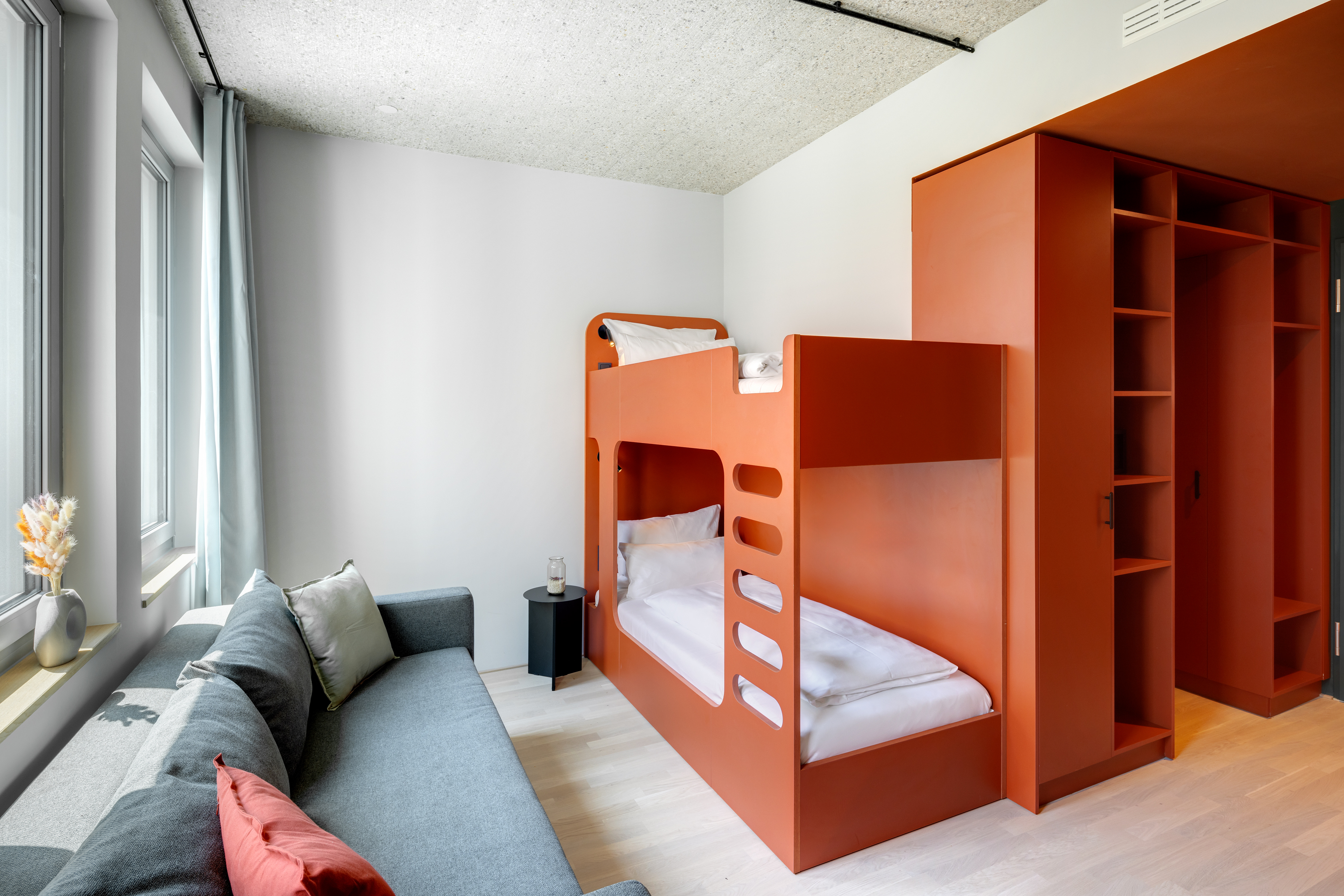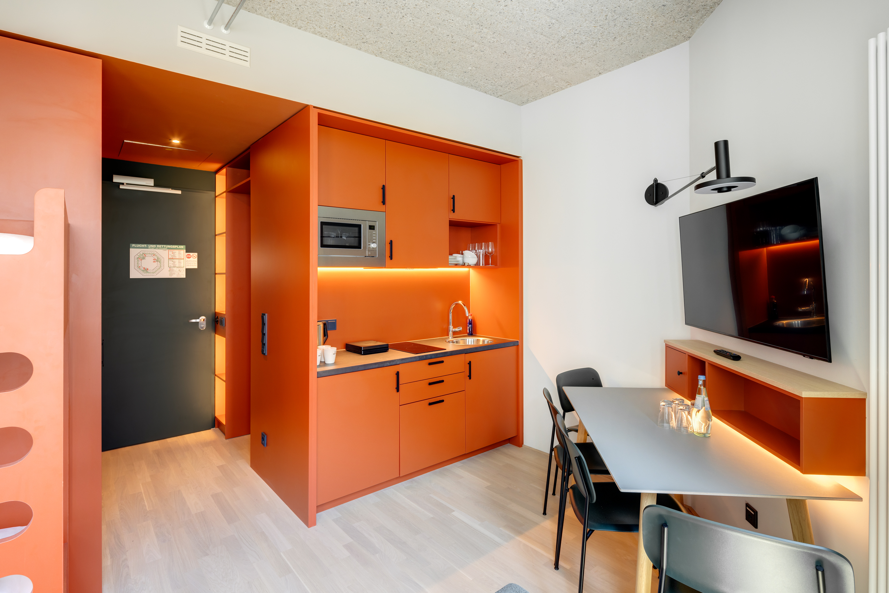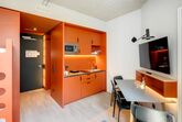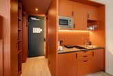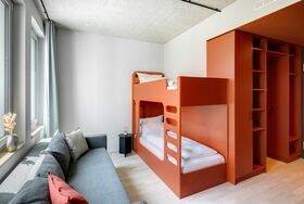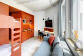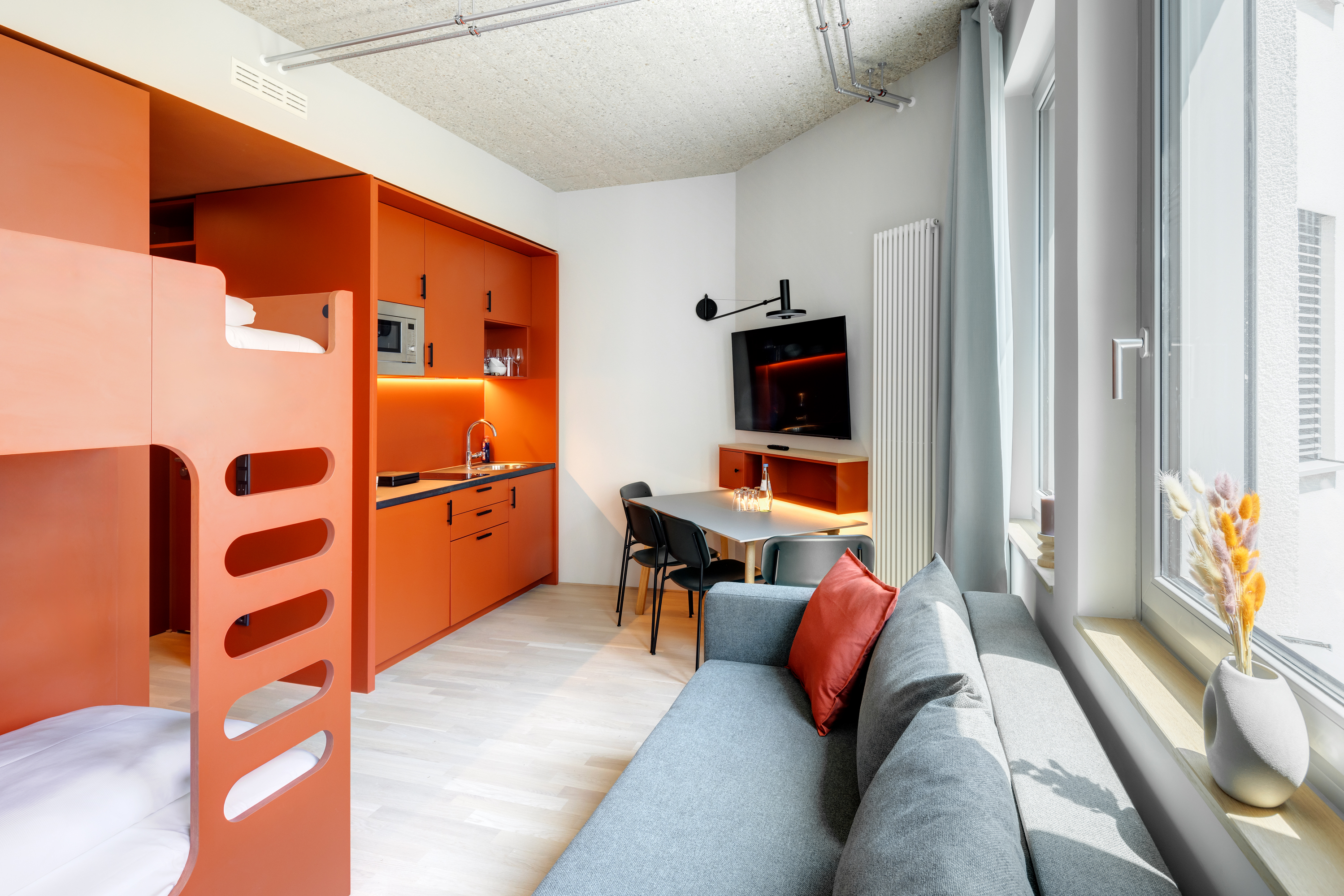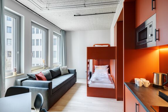 Gemeinsam reisen, Gemeinsam wohnen: Das Studio Stockbetten bietet eine praktische und komfortabel Wohnlösung ideal für Freunde, die gemeinsam wohnen möchten. Ein Stockbett sowie ein Stockbettsofa bieten Ihnen gleichzeitig Komfort und Privatsphäre für bis zu vier Personen. Die geschmackvolle Einrichtung und das zeitgemäße Design schaffen eine angenehme Atmosphäre. Die Küchenzeile ist mit modernen Geräten wie Herd, Kühlschrank, eine Mikrowelle und Spülmaschine ausgestattet und bietet Ihnen die Möglichkeit gemeinsam zu kochen und zusammen zu sein. Im Badezimmer gibt es eine stilvolle begehbare Dusche, einen großen Handtuchheizkörper sowie einen großen Spiegel mit umlaufender LED-Beleuchtung über dem Waschbecken, der dem Raum Helligkeit und Weite verleiht. Für Longstay Aufenthalte