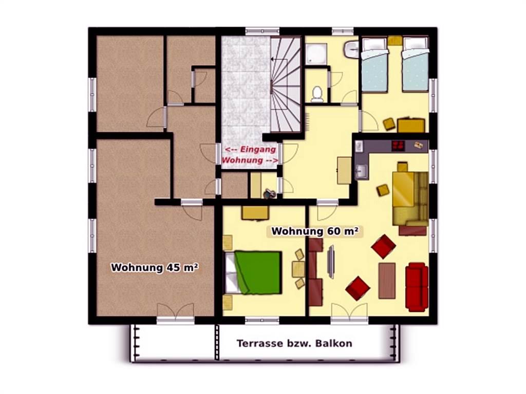 Die Ferienwohnungen sind jeweils 45 m² groß und bestehen aus einem großen Wohn(schlaf)raum mit LCD-TV, Ausziehsofa, komplett eingerichteter Wohnküche mit gemütlicher Eckbank, einem Schlafzimmer, Bad mit WC, sowie einem Vorraum mit Abstellraum - traumhafte Bergblicke vom Balkon.