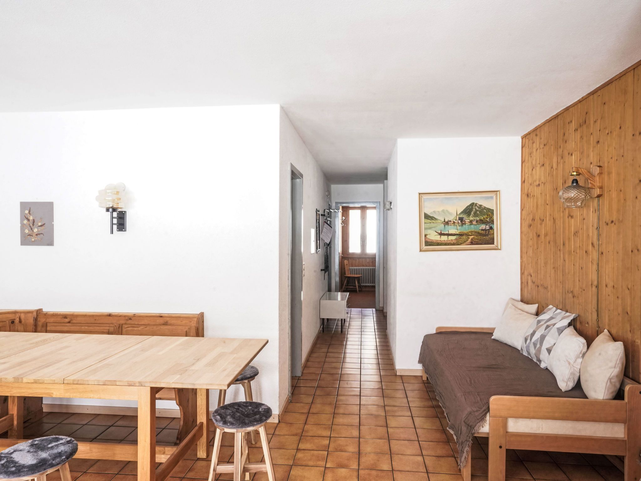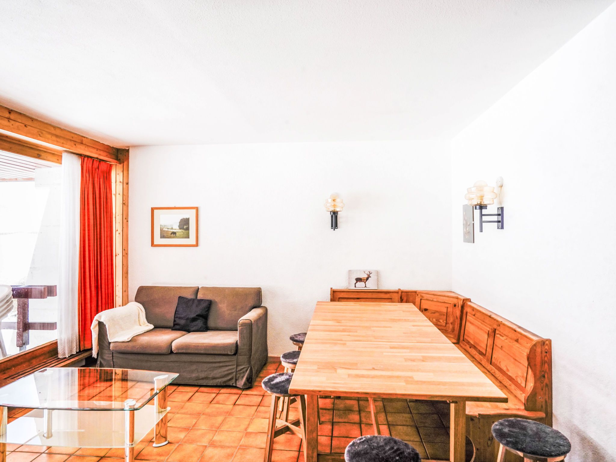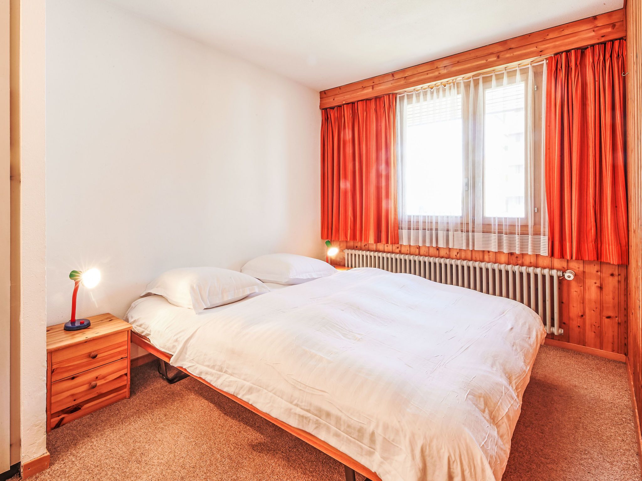 Arzinol 108, 4-Zimmer-Wohnung im 1. Stock. Komfortabel und geschmackvoll eingerichtet: Wohn-/Esszimmer mit 1 Bett (95 cm, Länge 190 cm), TV. Ausgang zum Balkon. 1 Zimmer mit 2 Betten (90 cm, Länge 200 cm). 1 Zimmer mit (90 cm, Länge 190 cm), 1 x 2 Etagenbetten mit 1 Bett (80 cm, Länge 190 cm). Küche (3 Kochplatten, Backofen). 2 Bäder/WC, sep. WC. Teppichboden. Balkon, Südlage. Balkonmöbel. Sehr schöne Sicht auf die Berge und die Landschaft. Maximal 1 Haustier/Hund erlaubt.
