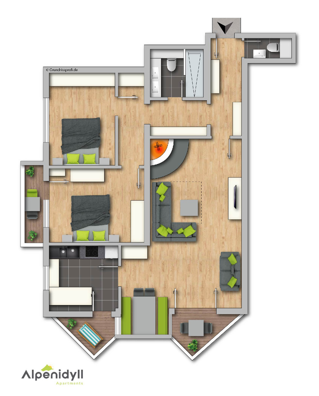 Ein ca. 40 m² großer Wohnraum, separate Küche, 2 Schlafzimmer mit je einem Doppelbett und 2 Einzelbetten