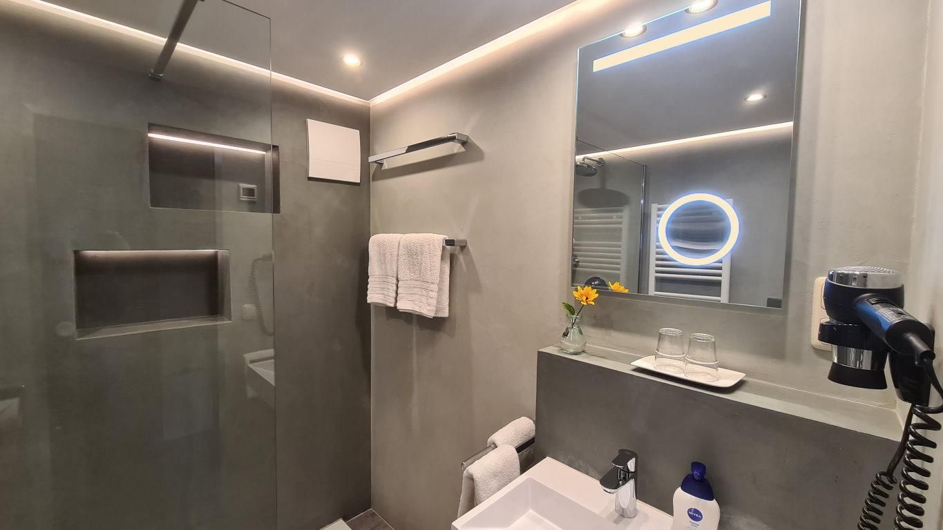 Die Küchenzeile ist ausgestattet mit einer Senseo Kaffeepadmaschine, Spülmaschine, einem 4-Platten-Cerankochfeld, Wasserkocher, Toaster, Mikrowelle sowie Ess- und Kochgeschirr.