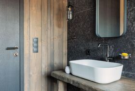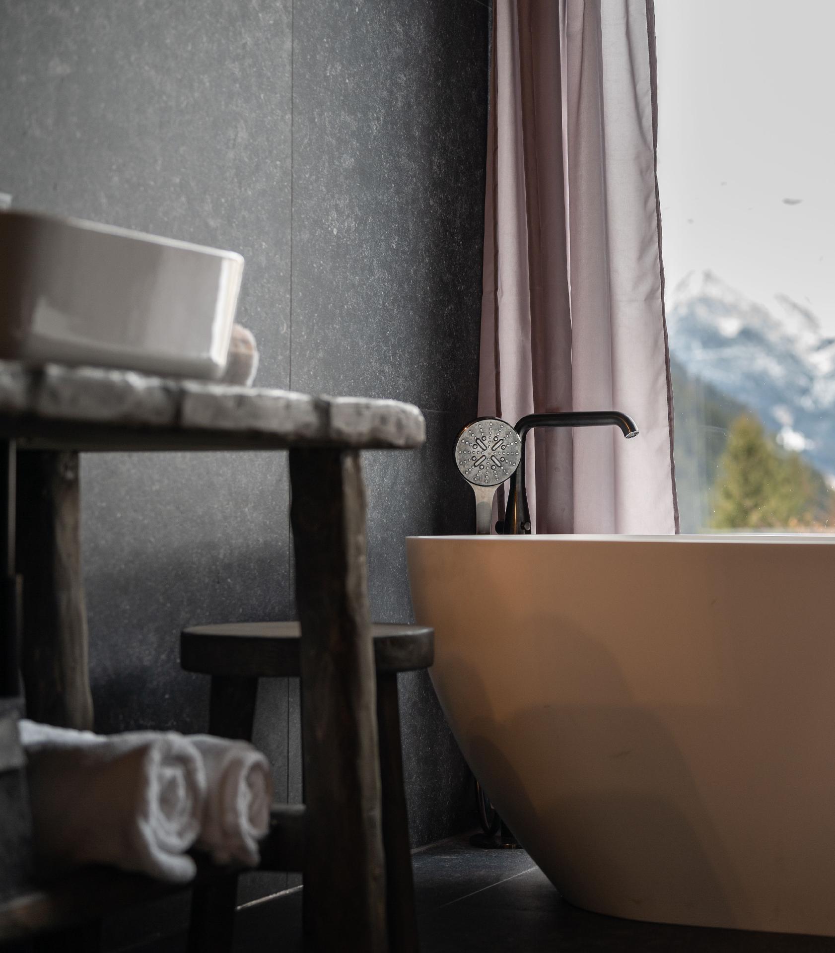 Die herrliche Aussicht kann auch vom Badezimmer aus genossenwerden, welches mit einer freistehenden Badewanne ausgestattetist und direkt auf die Alpengipfel blickt.