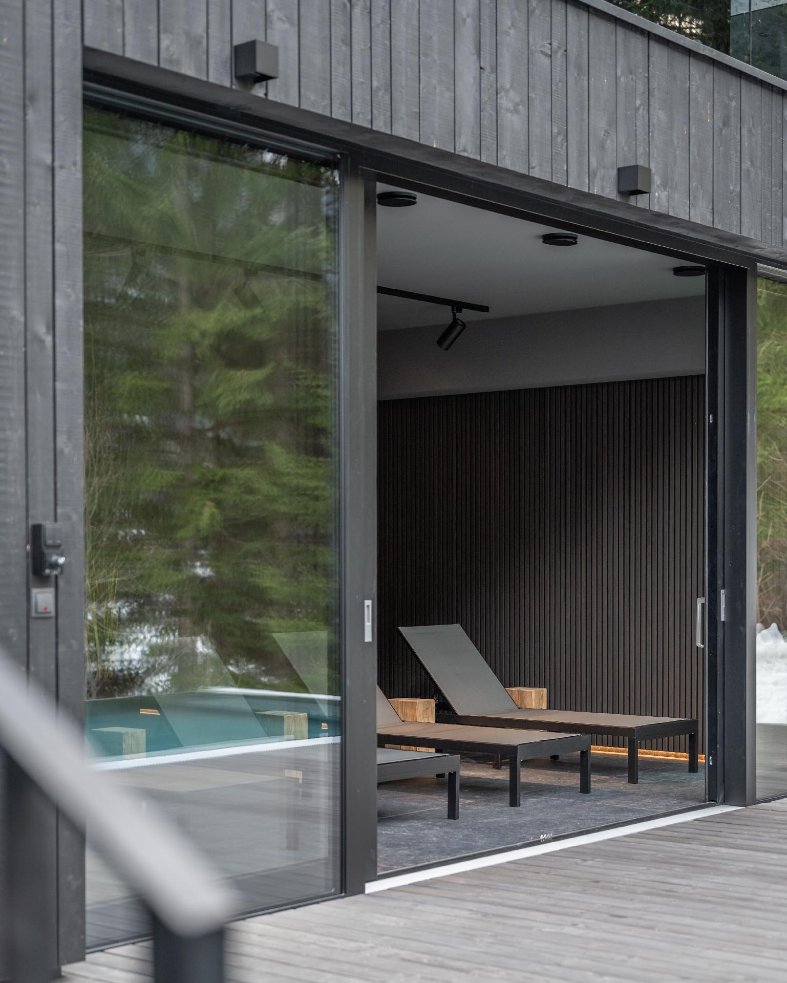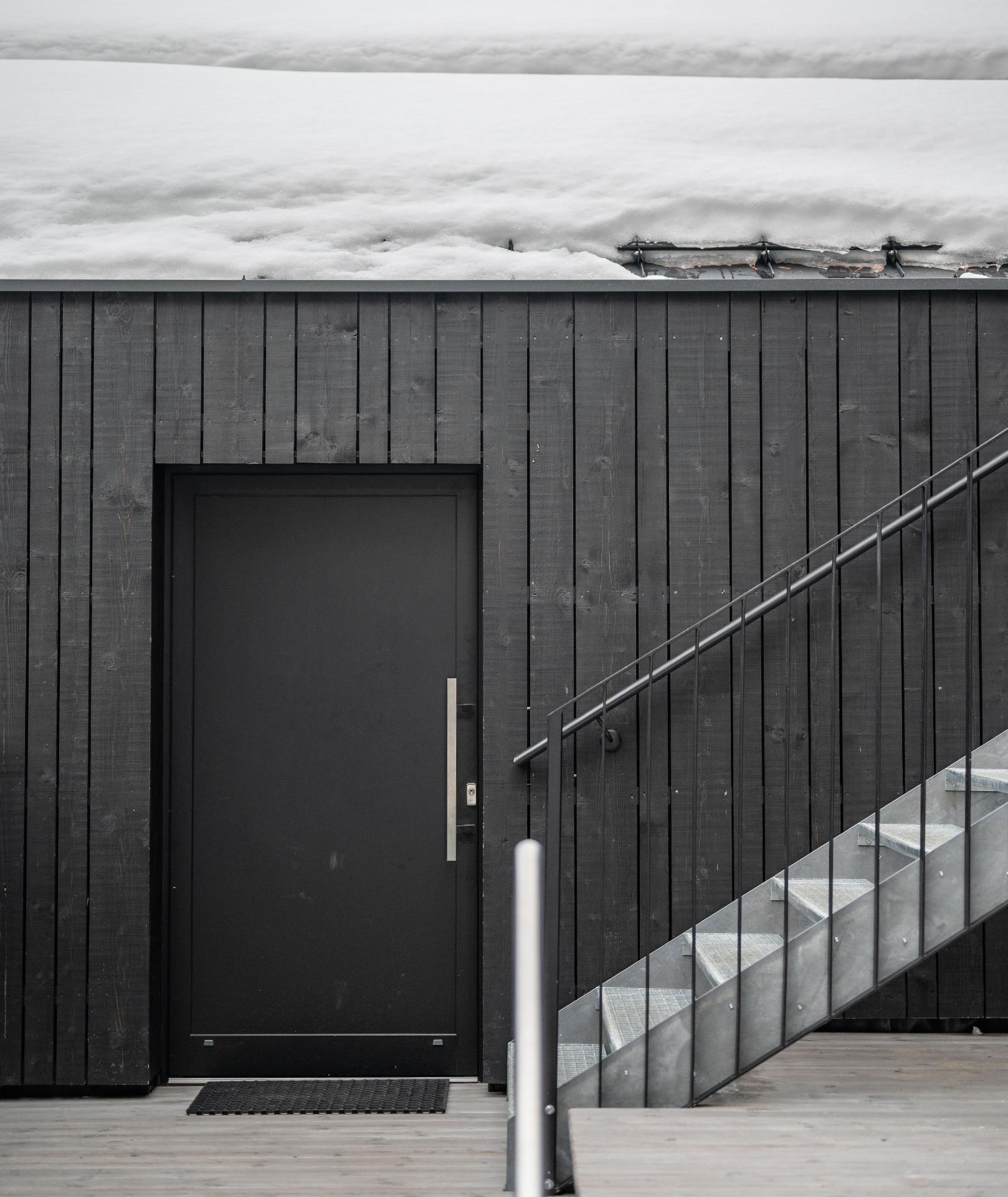 Die Kombination aus modernster Bautechnik und der traditionellenDachform der alten Chalets mit ihrem dunklen Holzdesign machtdie Paznauner Villen zu einer fantastischen, kontemporärenErinnerung an das Aussehen der alten Tiroler Chalets.Die Dächer imitieren die Bergsilhouette der anderen Talseite. Dasschwarze Holz integriert sich ganz natürlich in den tiefen Wald unddie Struktur der Gebäude steht in einem idealen Gleichgewicht mitihrer natürlichen Umgebung.