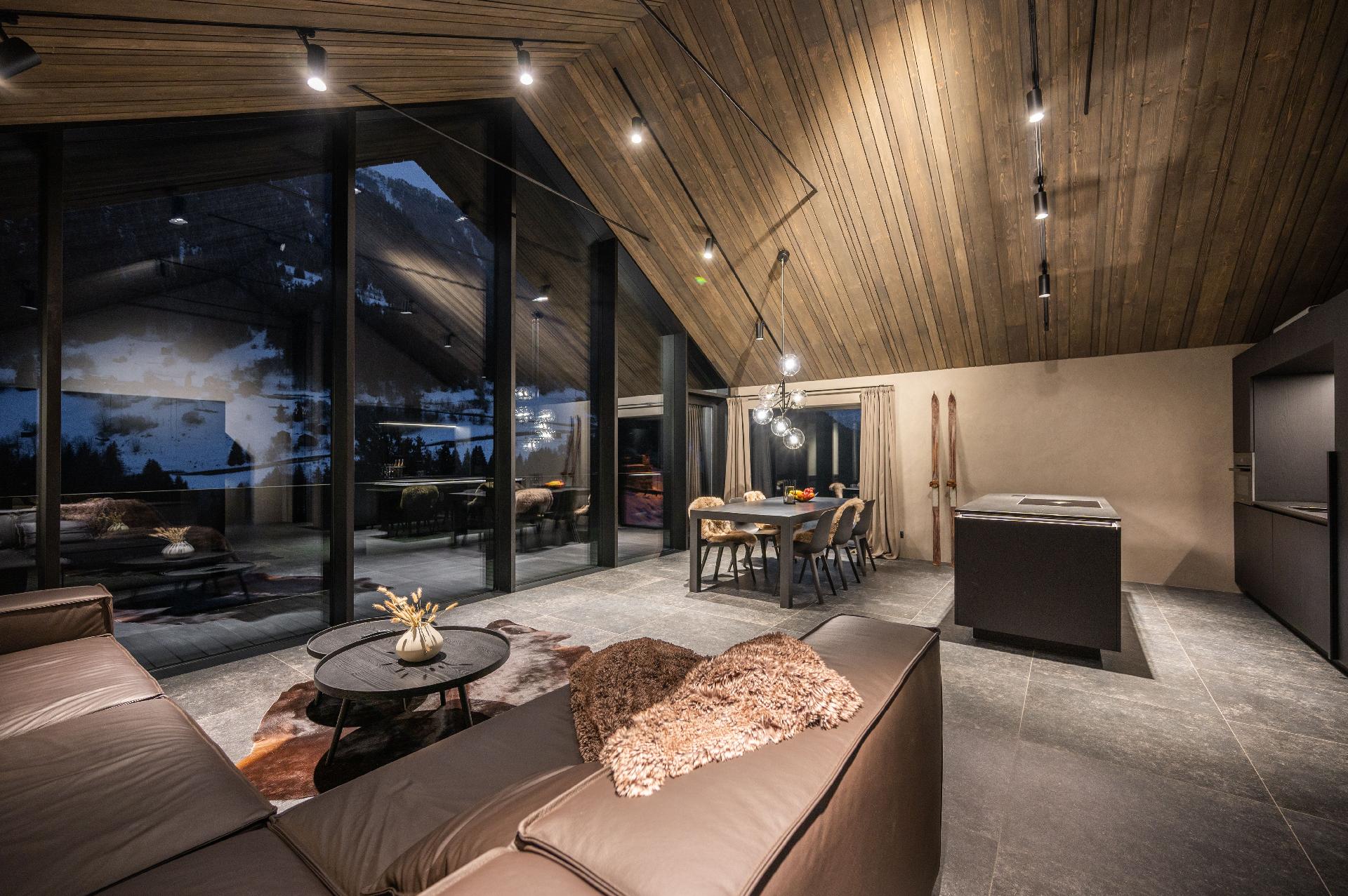 Die Bergvilla bietet ein Wohnzimmer und einen Essbereich, die sehrkomfortabel und geräumig sind. Der Essbereich befindet sich imobersten Teil des Chalets und ist mit hohen Holzdeckenausgestattet. Die Glaswände öffnen sich auf dem großen Balkon,wo Sie ein atemberaubendes Panorama über die Berge genießenkönnen und sich mit der alpinen Natur verbunden fühlen. Sitzmöbelim Freien machen den Balkon zu einem attraktiven Ort für einen«Sundowner». Auch im Wohnbereich können Sie es sich auf einembequemen Sofa gemütlich machen. Gegenüber dem Wohnzimmerbefindet sich die offene Küche mit hochwertigen Miele-Geräten.