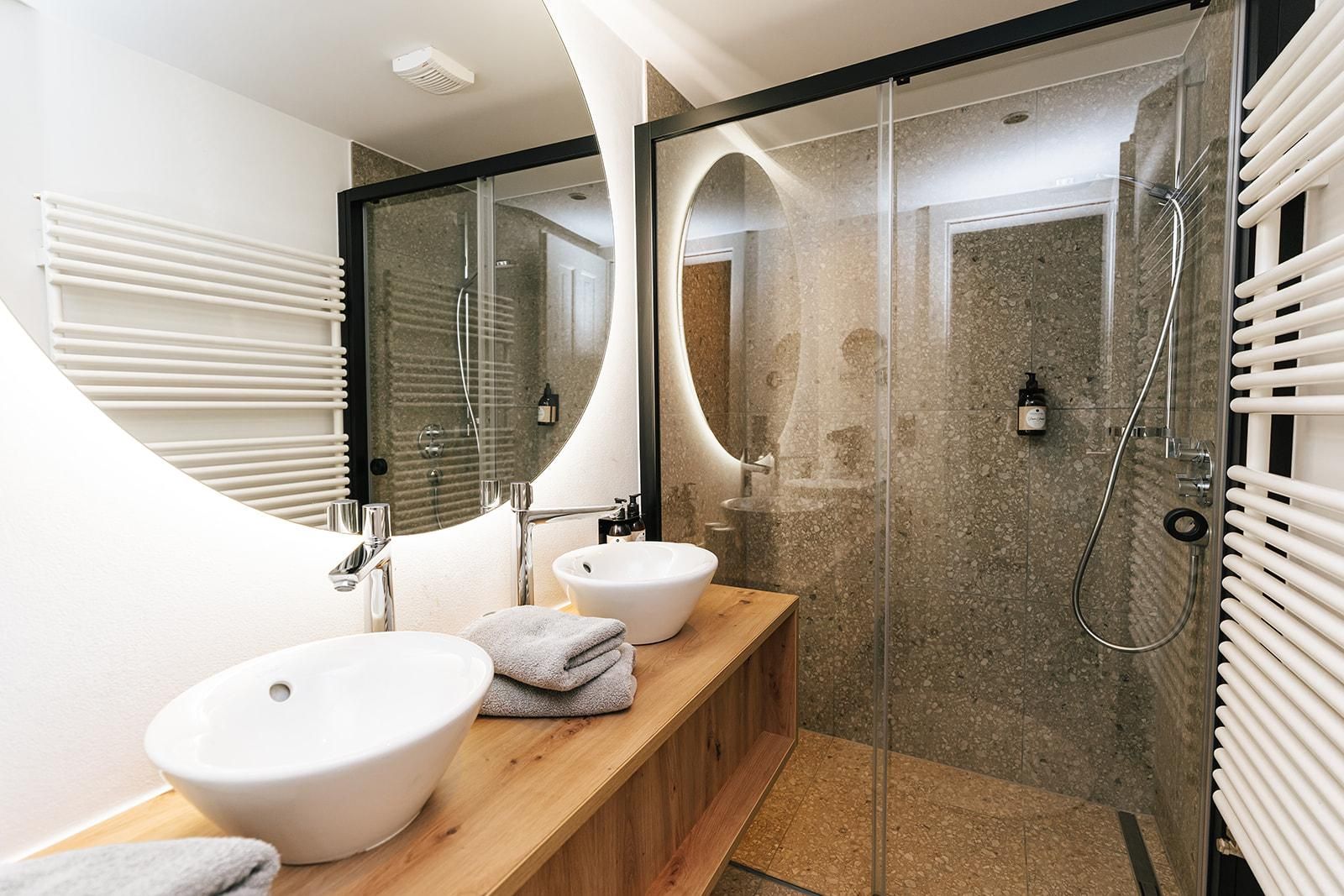 Das Badezimmer verfügt über eine Dusche und zwei Waschbecken. Das WC ist separat.