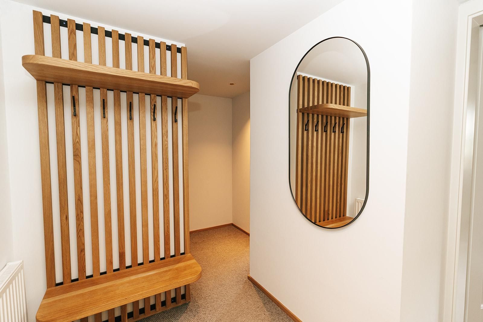 Das Apartment besteht aus einem Eingangsbereich mit Stauraum, einem Schlafzimmer mit Doppelbett und Flachbildfernseher (32), einem Wohnzimmer mit einem ausziehbaren Sofa, einem weiteren TV (43) auf einem Schwenkarm , eine vollausgestattete Küchennische mit Induktionskochfeld und Geschirrspüler, einem Tisch und einem gemütlichen Platz zum Sitzen.