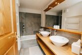Das Badezimmer verfügt über eine Badewanne mit Duschwand und zwei Waschbecken. Das WC ist separat.