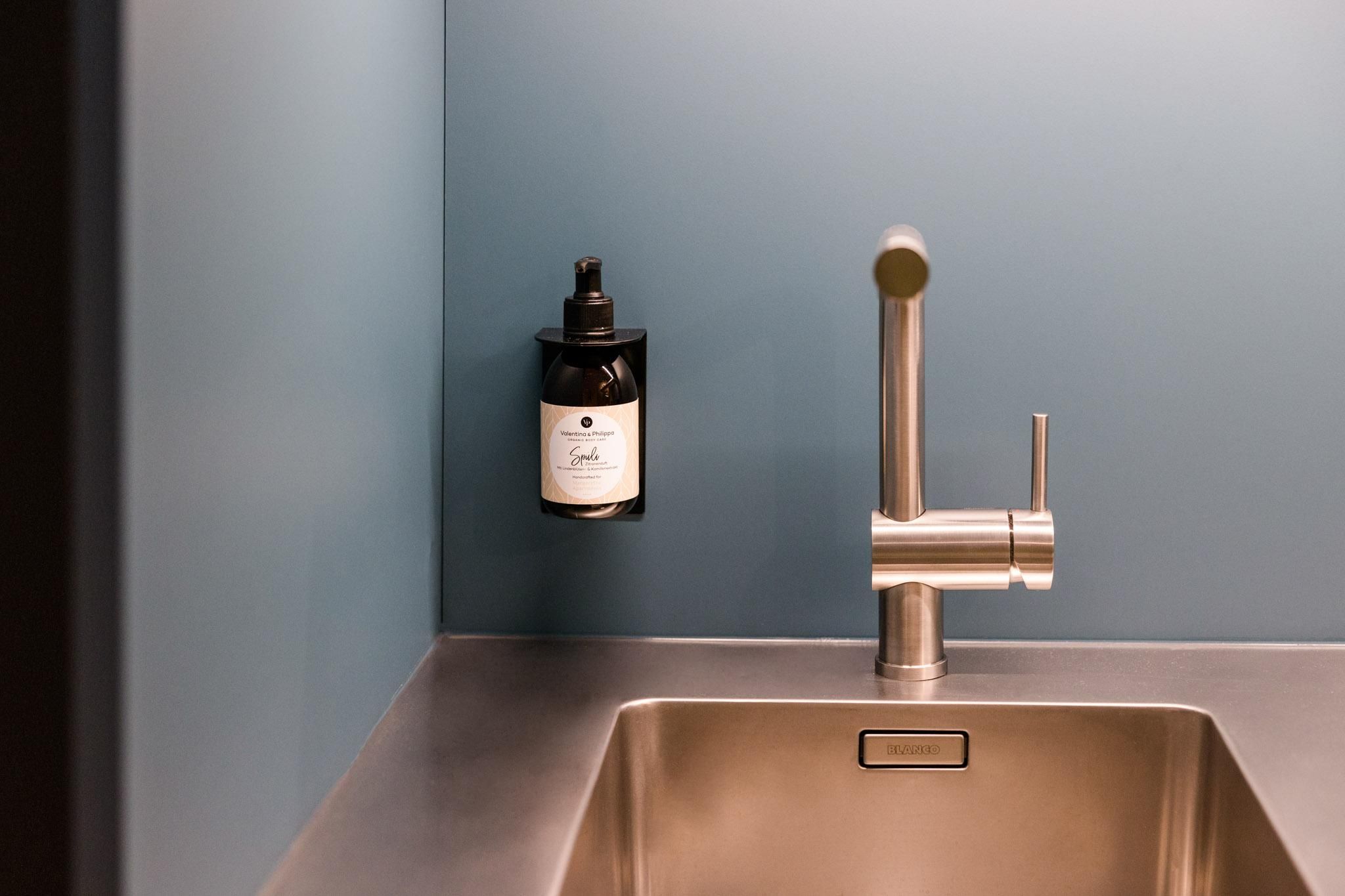 Das Badezimmer ist mit regionalen Pflegeprodukten aus Vorarlberg wie Seife, Shampoo und Körperlotion ausgestattet.