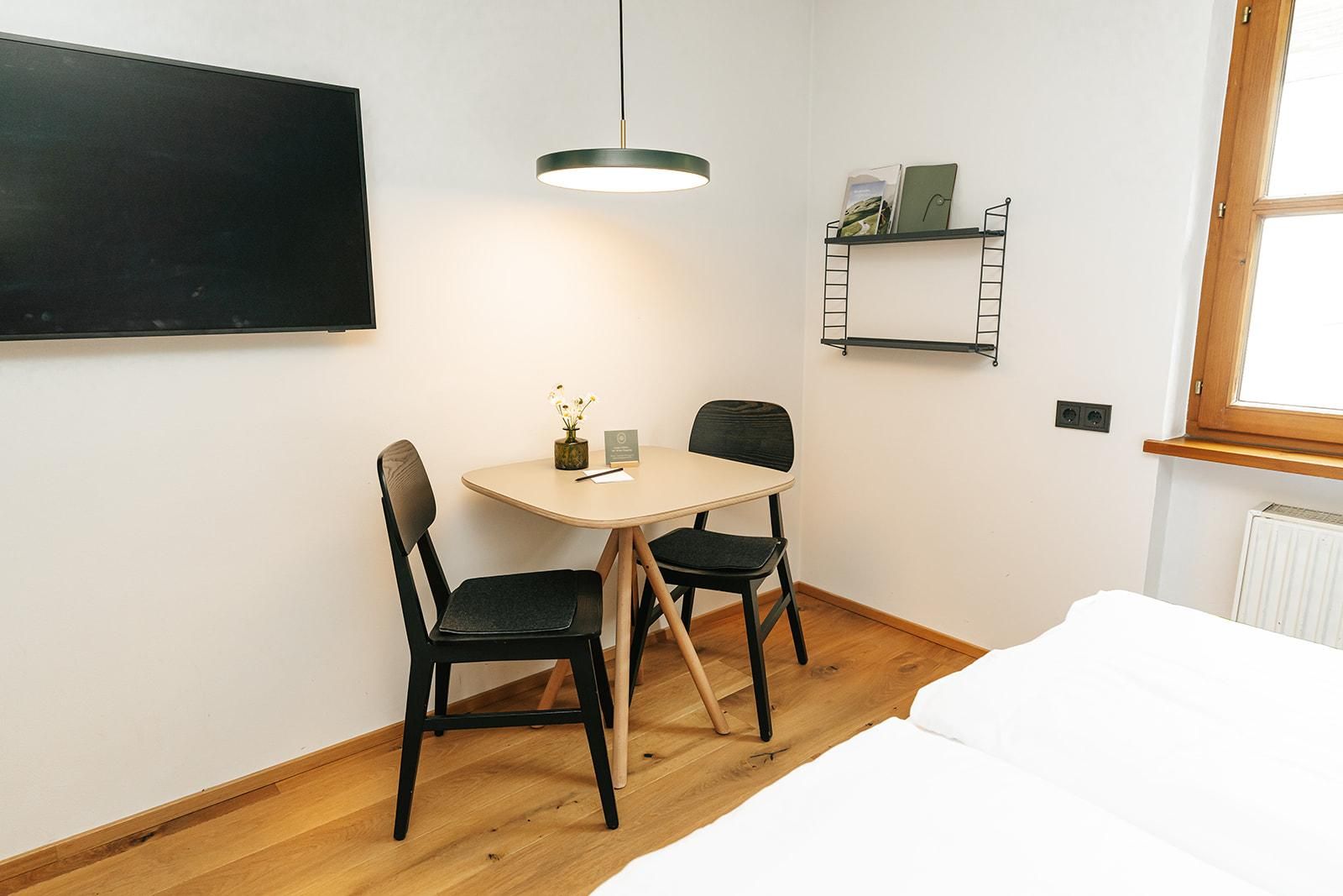 Das Roggal hält für Sie ein Doppelbett bereit, ebenso eine kleine Kochnische mit 2 Platten und einem Kühlschrank, einen Flachbildfernseher (43'') und eine Essgelegenheit für zwei Personen.