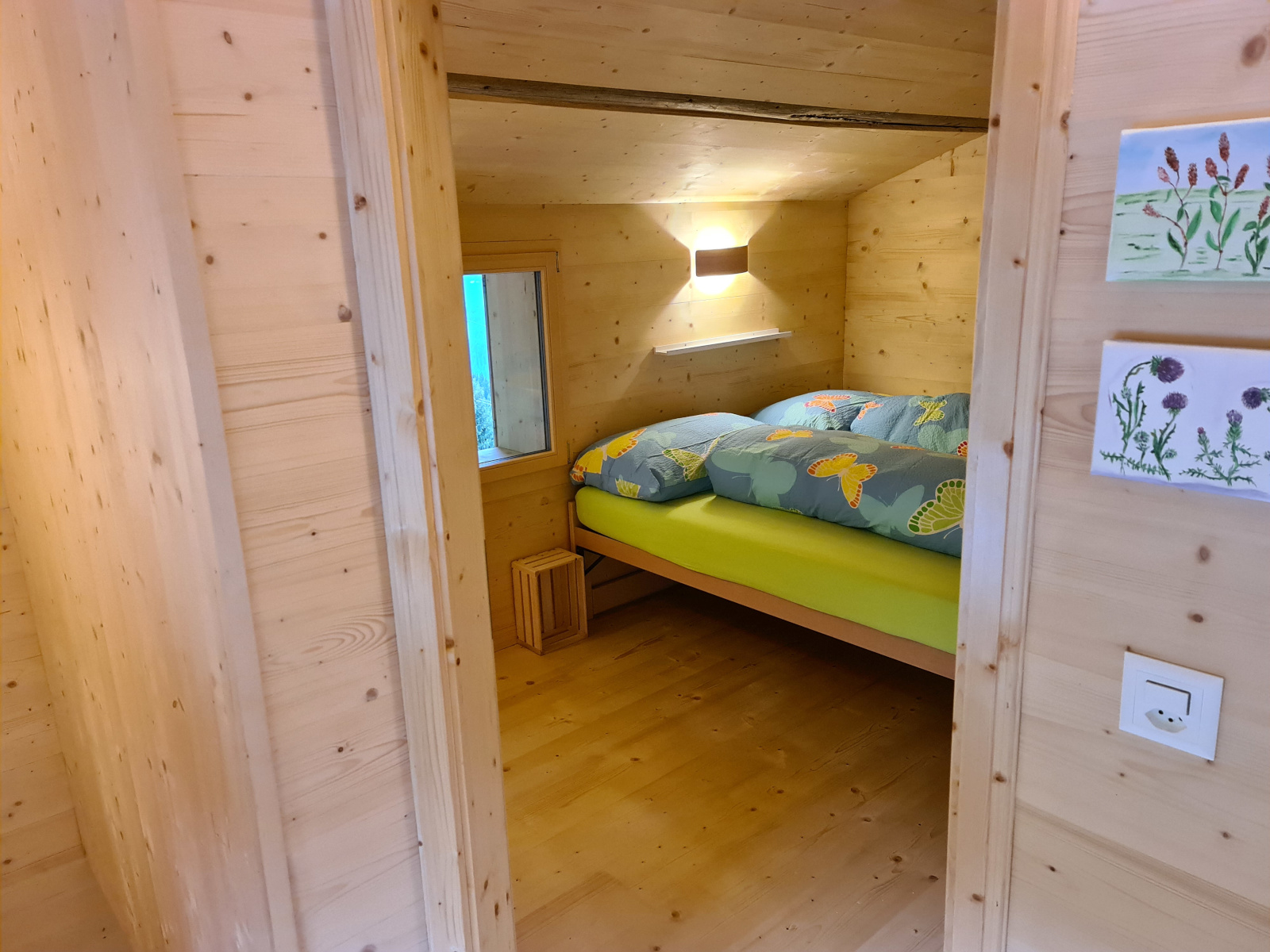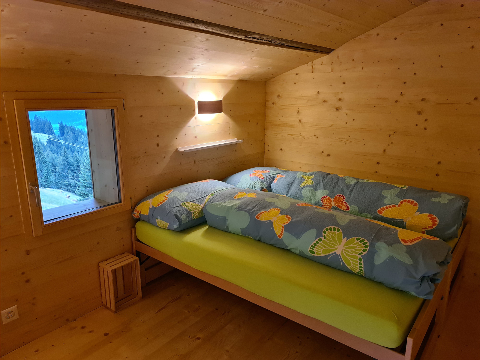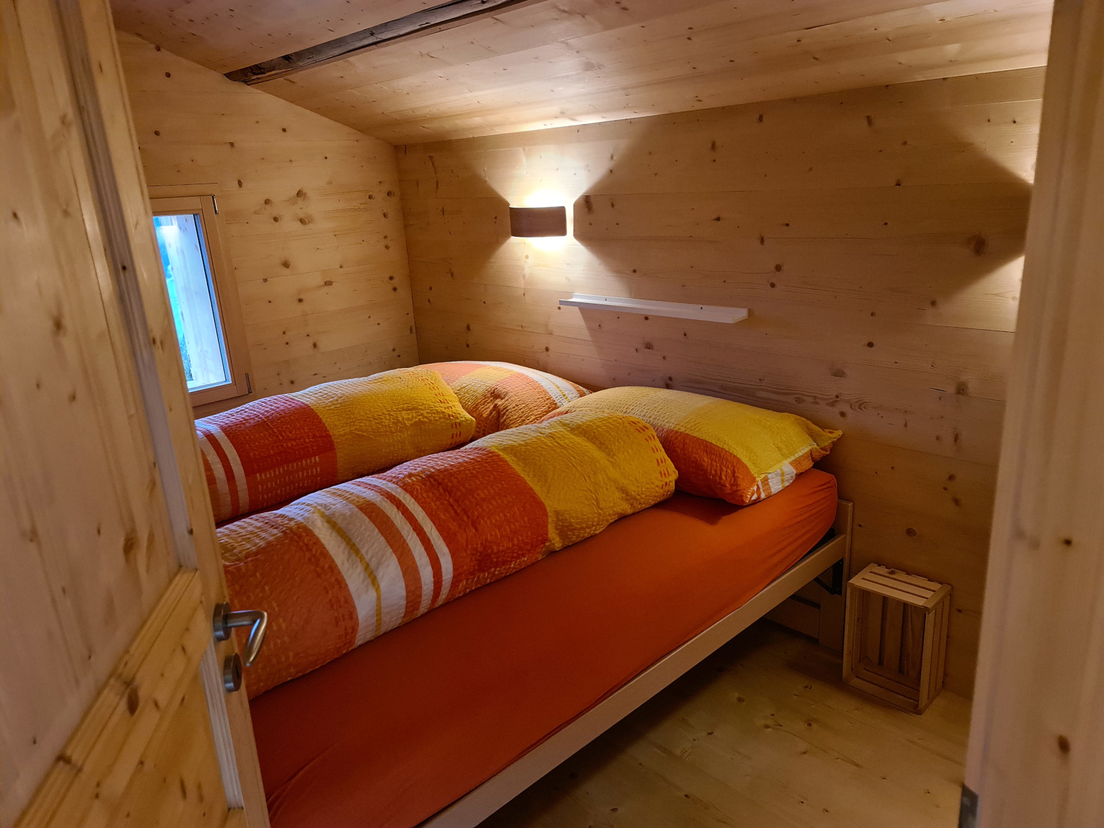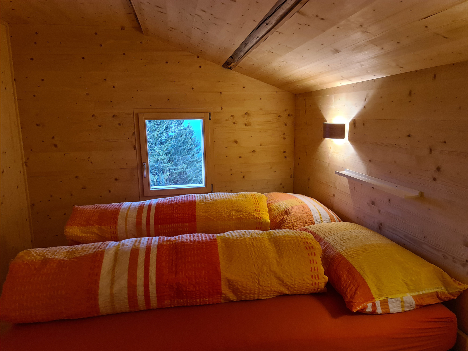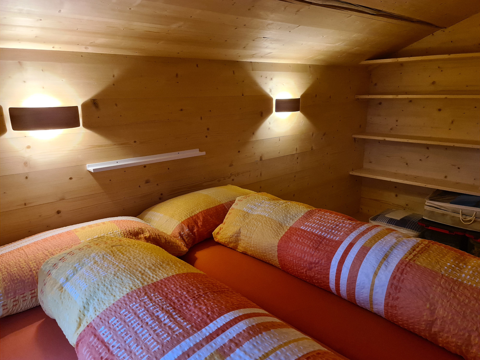 2 Schlafzimmer im OG: Gemütliche Schlafzimmer mit je zwei Einzelbetten und einmaliger Aussicht. Je ein Bett ist klappbar und kann unter das andere Bett versorgt werden. Die Schlafzimmer verfügen über ein grosses Regal für Kleider und Ablage. Zusätzlich ist ein Kinderbett vorhanden (Reisebett klappbar). Bettwäsche vorhanden und im Preis inklusive. Im Wohnzimmer EG ist das Sofa zu einem französischen Bett für weitere zwei Personen ausziehbar. Wohnraum: