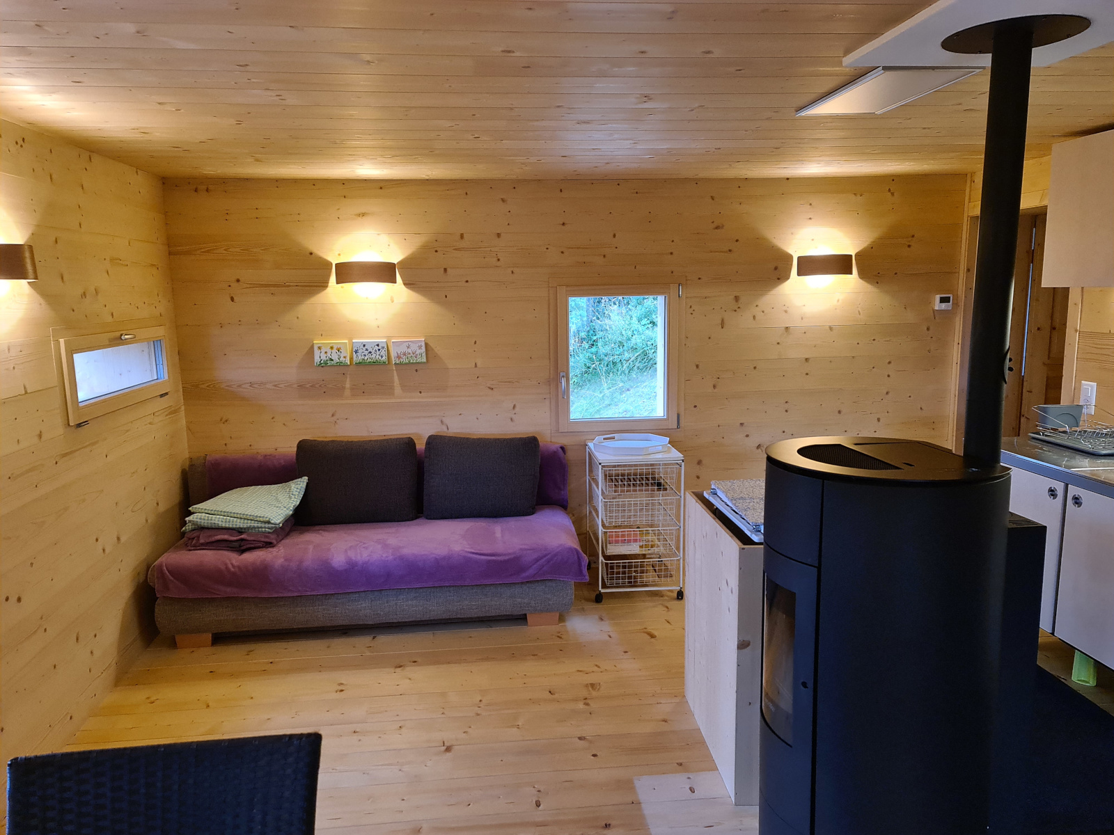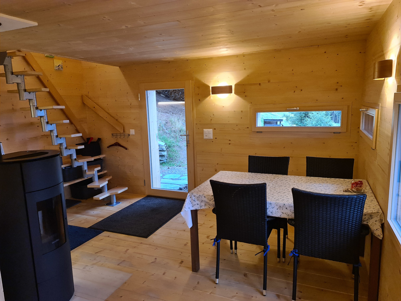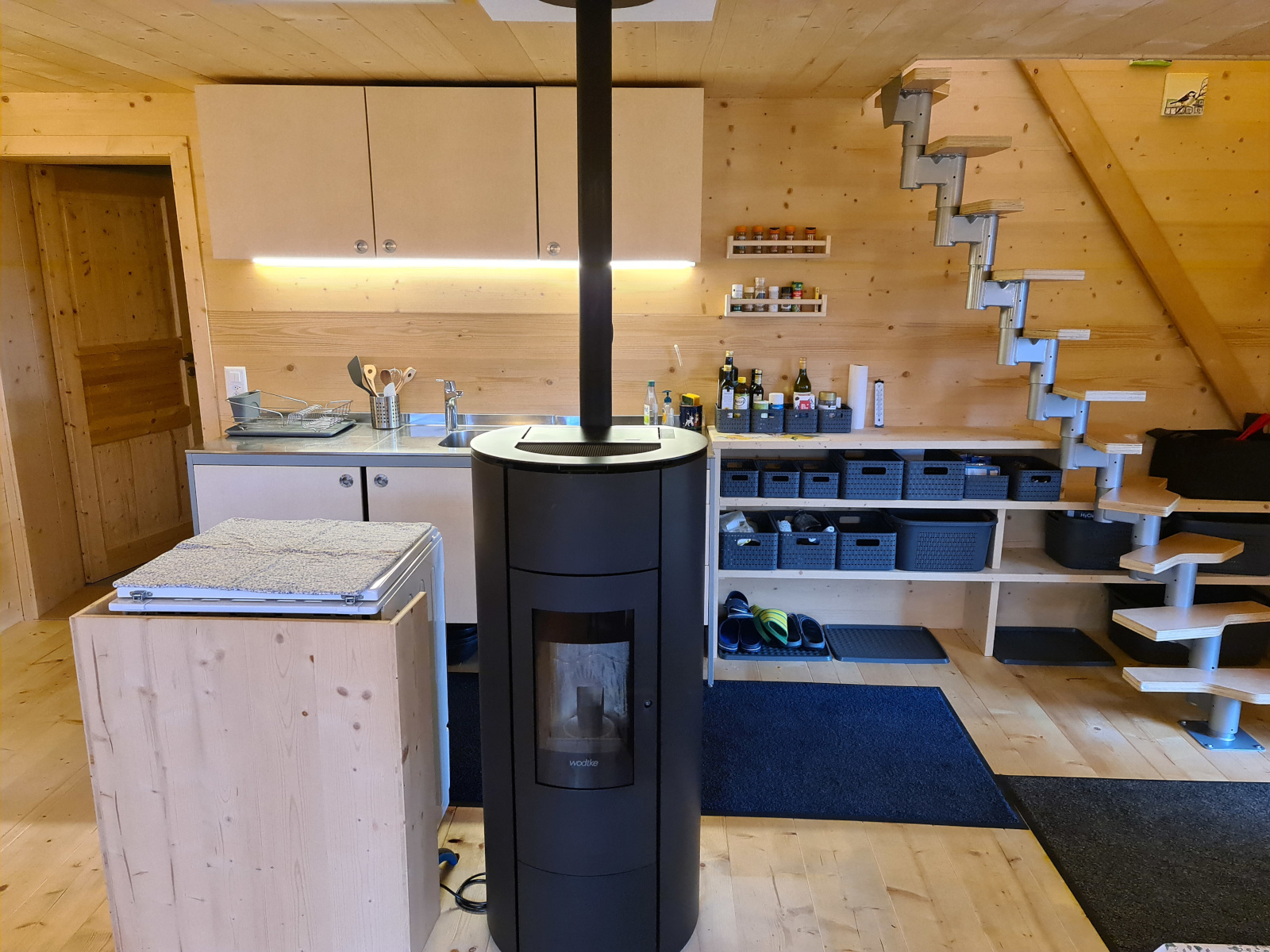 Ein offener Wohnraum mit Küchen-/Ess-/Wohnbereich. Im Wohnzimmer befindet sich in der Mitte der Ofen und die Kochinsel, ein Esstisch mit 4-6 Stühlen, ein Bettsofa, ein Gestell. WLAN in der ganzen Wohnung (kostenlos) verfügbar. Die PV-Anlage liefert Strom für die Beleuchtung sowie für das Aufladen von Notebooks und Mobilephones oder E-Bikes. Für den richtigen Komfort sorgt ein vollautomatischer Pelletofen und ein Batteriesystem mit Solarboiler für Warmwasser. Küche: