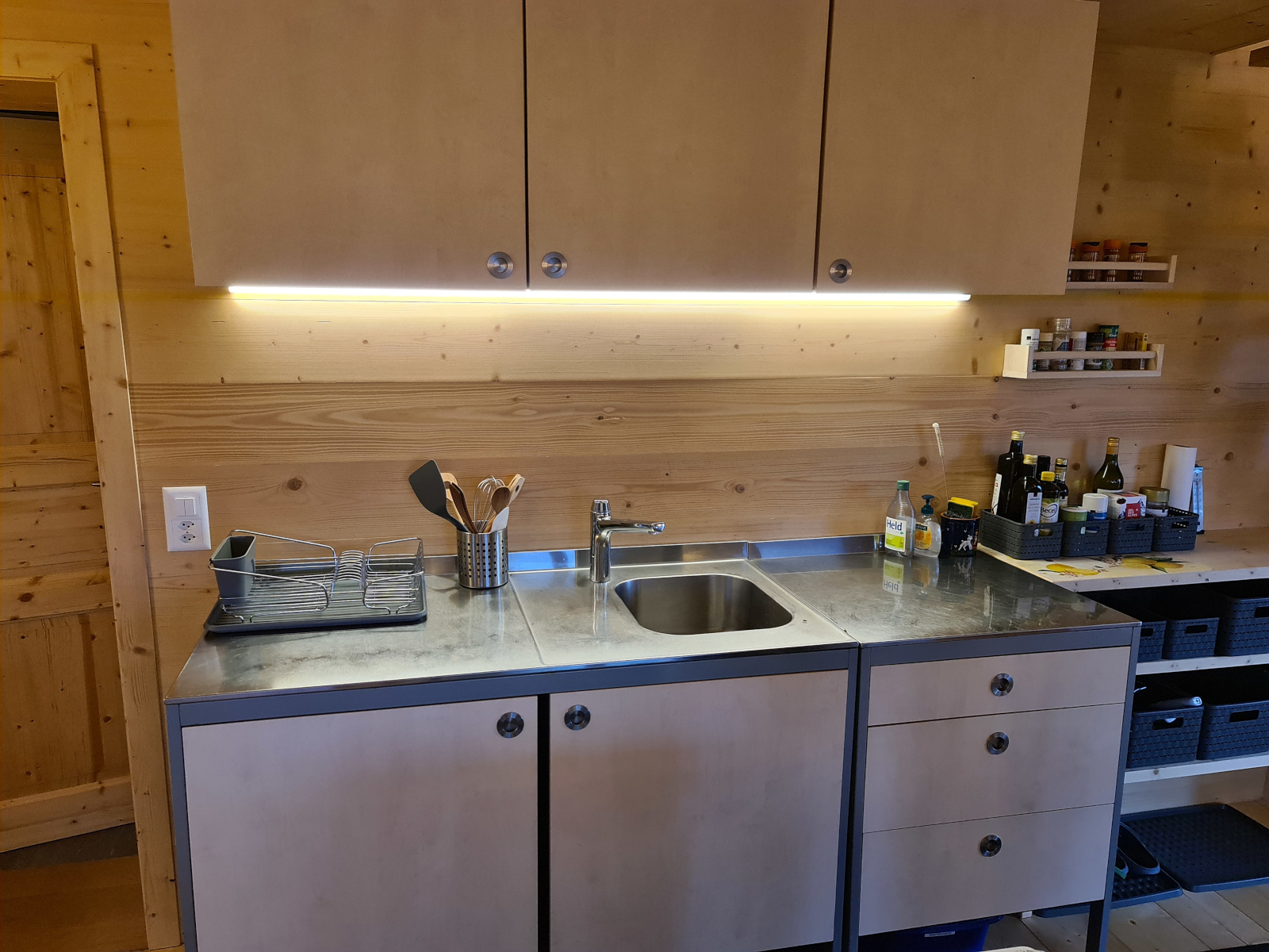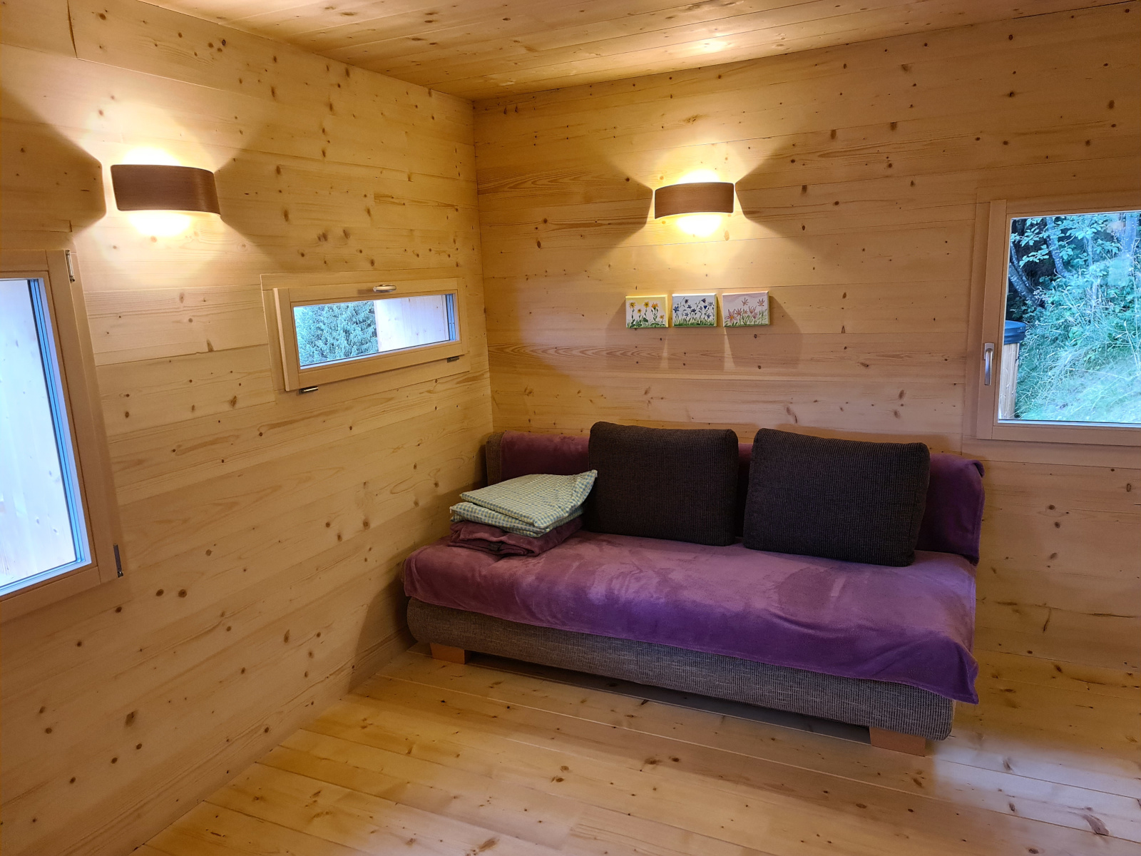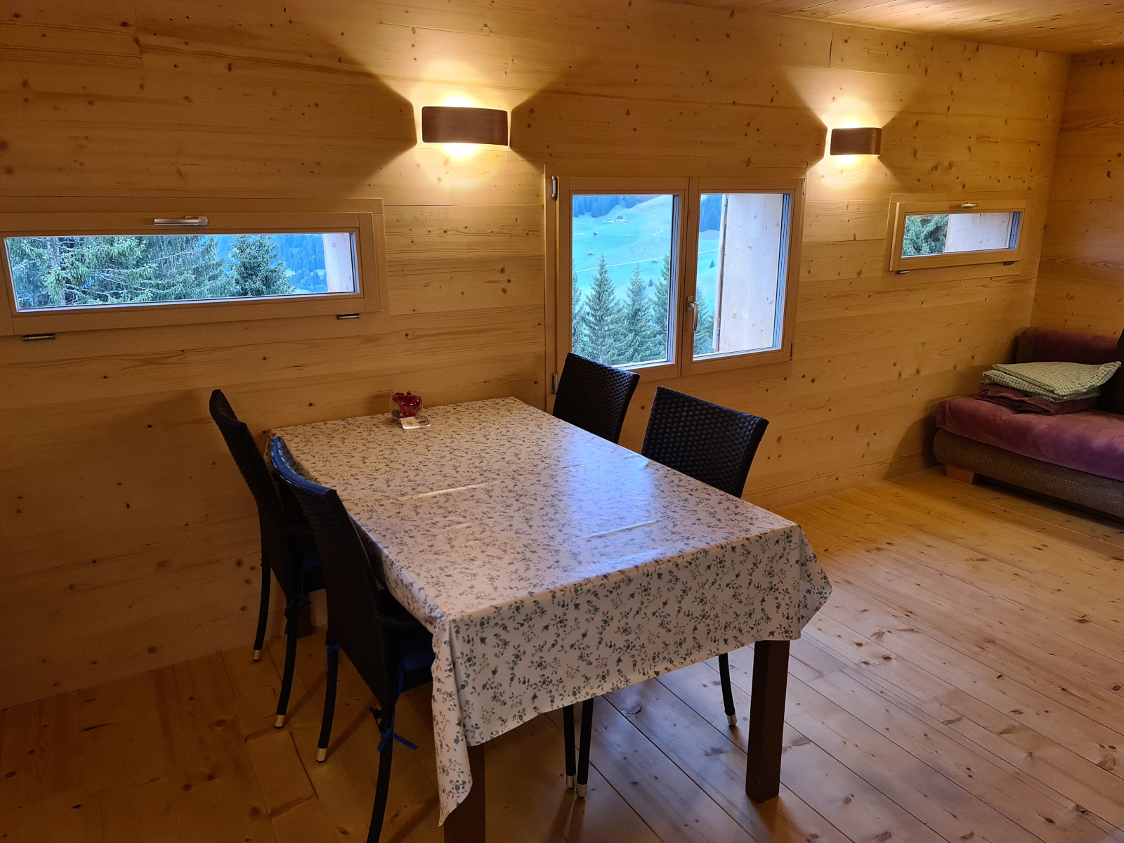 Ein offener Wohnraum mit Küchen-/Ess-/Wohnbereich. Im Wohnzimmer befindet sich in der Mitte der Ofen und die Kochinsel, ein Esstisch mit 4-6 Stühlen, ein Bettsofa, ein Gestell. WLAN in der ganzen Wohnung (kostenlos) verfügbar. Die PV-Anlage liefert Strom für die Beleuchtung sowie für das Aufladen von Notebooks und Mobilephones oder E-Bikes. Für den richtigen Komfort sorgt ein vollautomatischer Pelletofen und ein Batteriesystem mit Solarboiler für Warmwasser. Küche: