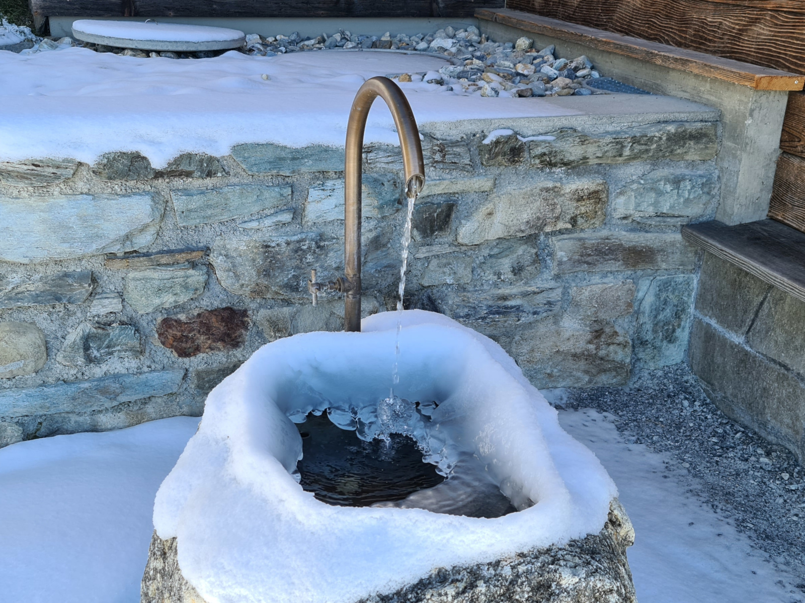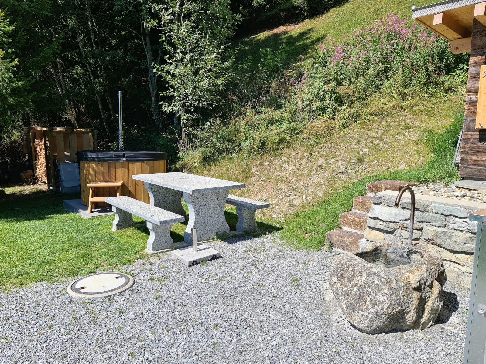 Brunnen/Solar-Aussendusche für warme Sommertage vorhanden, sowie Badefass/HotPot für das Wellnessgefühl.