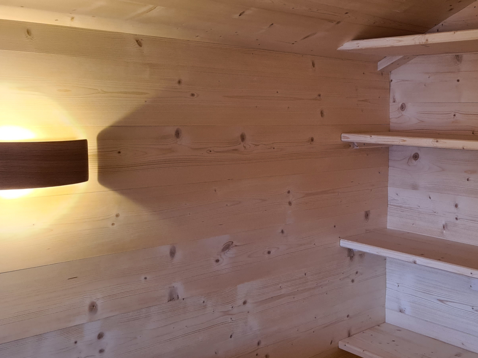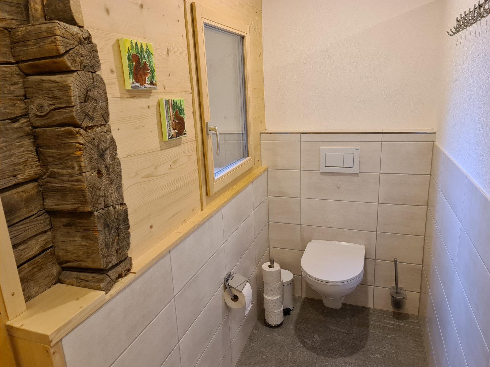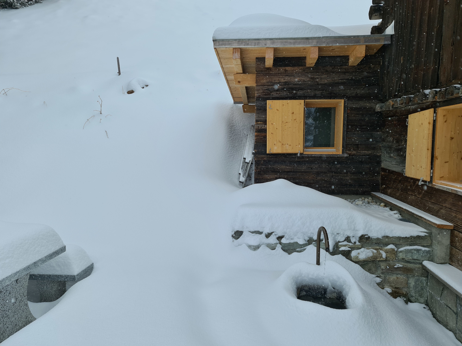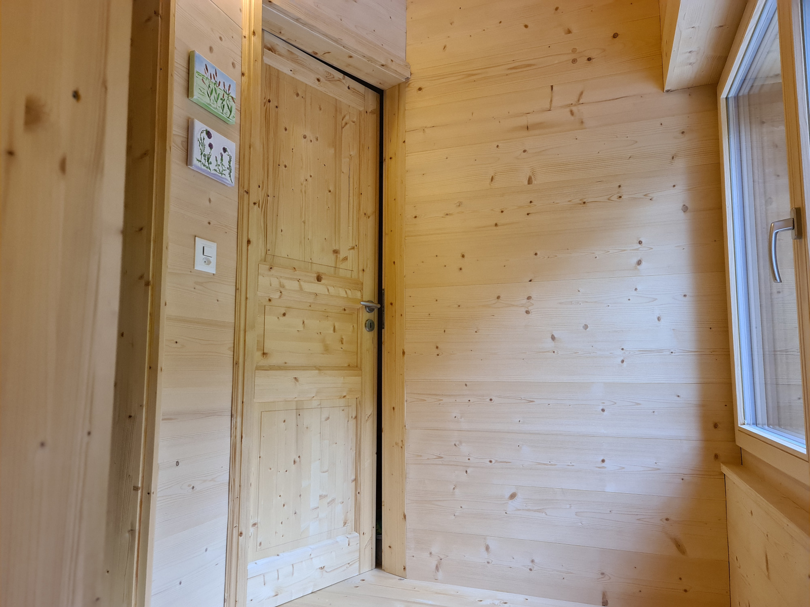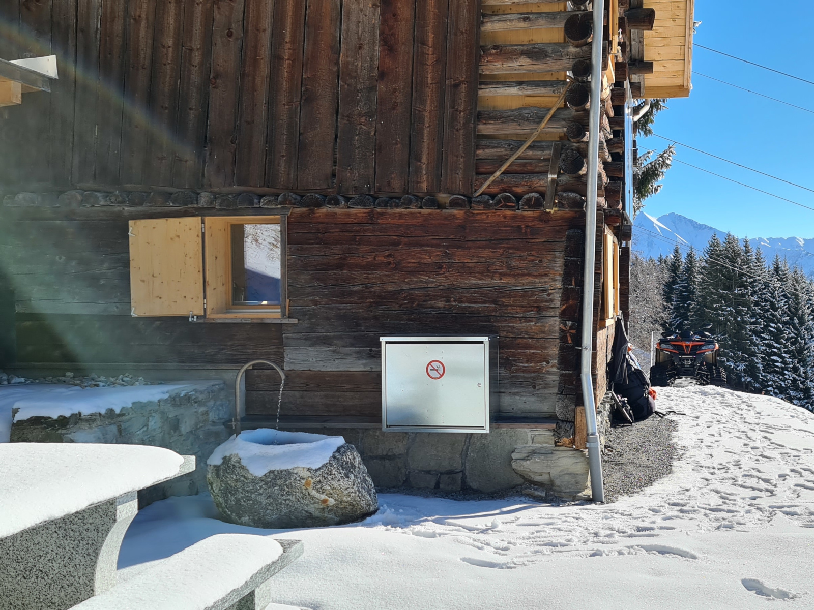 Raclette-Ofen sowie ein Fondue Caquelon. Küchenwäsche ist vorhanden und im Preis inbegriffen. Kompost für Grünabfälle vorhanden. Mit den Ressourcen von Wasser, Gas, Holz und Strom muss sorgfältig umgegangen werden. Autarke Maiensäss mit eigener Quelle und einem abflusslosen Schmutzwasserbehälter. Badezimmer: