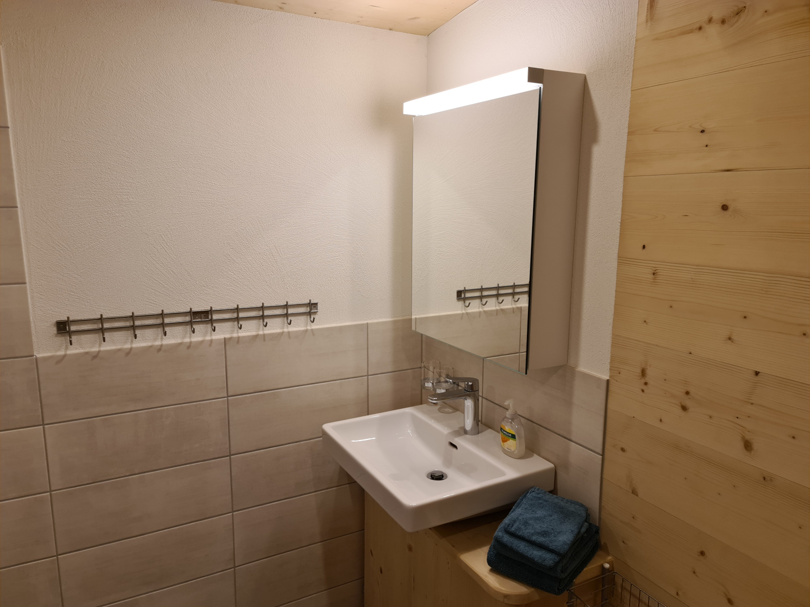 Das Badezimmer verfügt über ein WC, ein Lavabo mit Spiegelschrank, und eine Dusche. Frotteewäsche muss selbst mitgebracht werden. Bemerkung: Kein Haartrockner (braucht zu viel Strom) Draussen:
