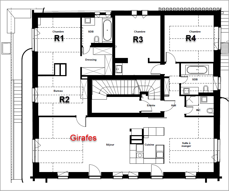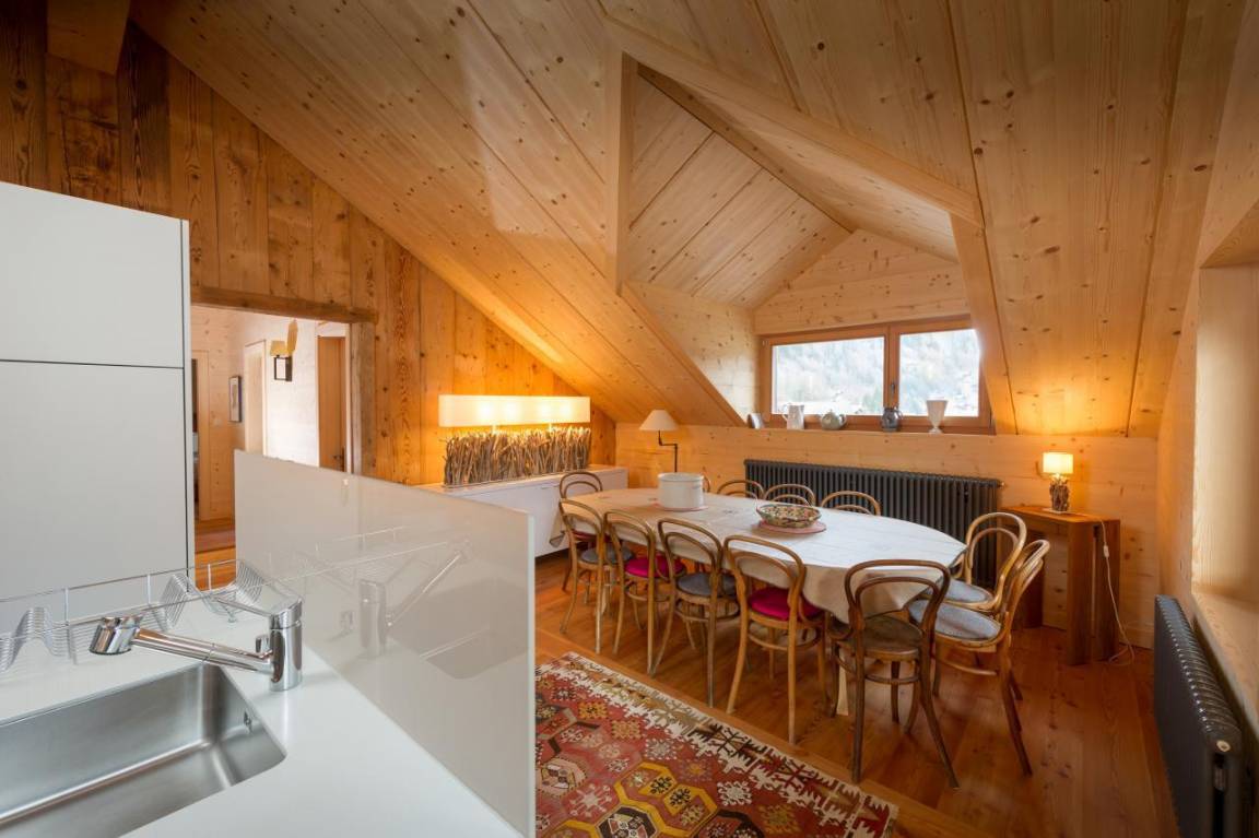 Les Girafes, im zweiten Stock mit dem Loft im dritten Stock, besteht aus: einem Wohnzimmer, einem Esszimmer und einer voll ausgestatteten Luxusküche (mit Gasherd), die sich unter dem Dach befindet.4 Schlafzimmer und ein Büro:1 Elternschlafzimmer + Badezimmer + Ankleidezimmer1 Büro mit Einzelbett2 Gästezimmer (2 Betten pro Zimmer) + 2 Bäder1 sehr großes Superior-Zimmer (2 Betten) + Badezimmer.Zwei Parkplätze, davon einer überdacht, ein privater Keller mit Skifächern und Skischuhtrockner. Verschiedene Lagermöglichkeiten in einem externen Wein- und Gemüsekeller, der von der überdachten Garage aus zugänglich ist.Gemeinsam mit den anderen Wohnungen; Waschküche mit einer Waschmaschine und einem Trockner pro Wohnung.Eine Sauna kann, falls verfügbar, für 300 CHF pro Woche gemietet werden.