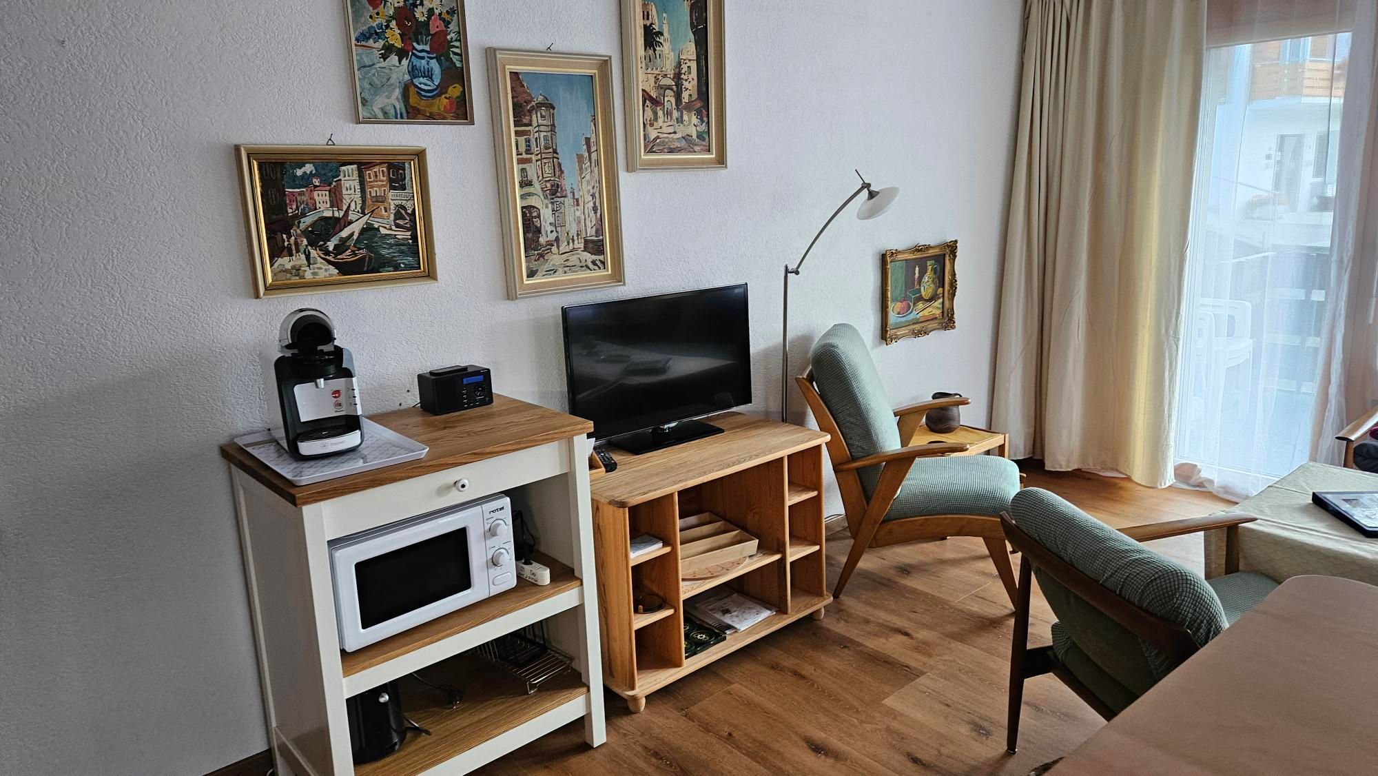 Wohnraum mit offener Küche, Essecke, Polstergruppe, SAT-TV und Radio, Mikrowelle,