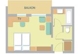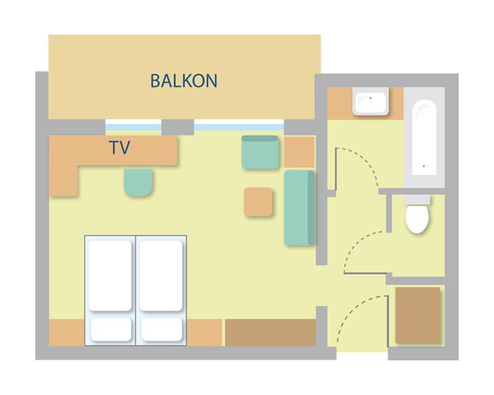 Komfortables Doppelzimmer ca. 30 qm gross, mit Bad und WC getrennt, Balkon Sitzecke, TV, Radio, Telefon, Safe, W-Lan. Für 2 - 3 Personen.