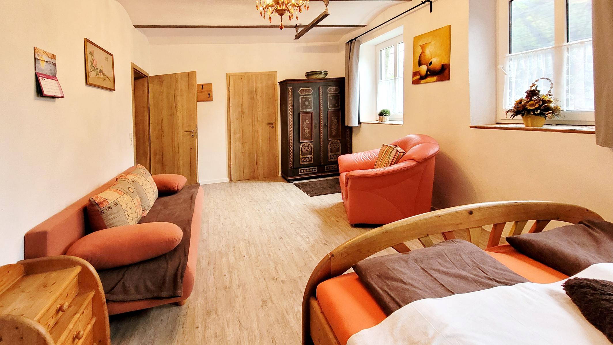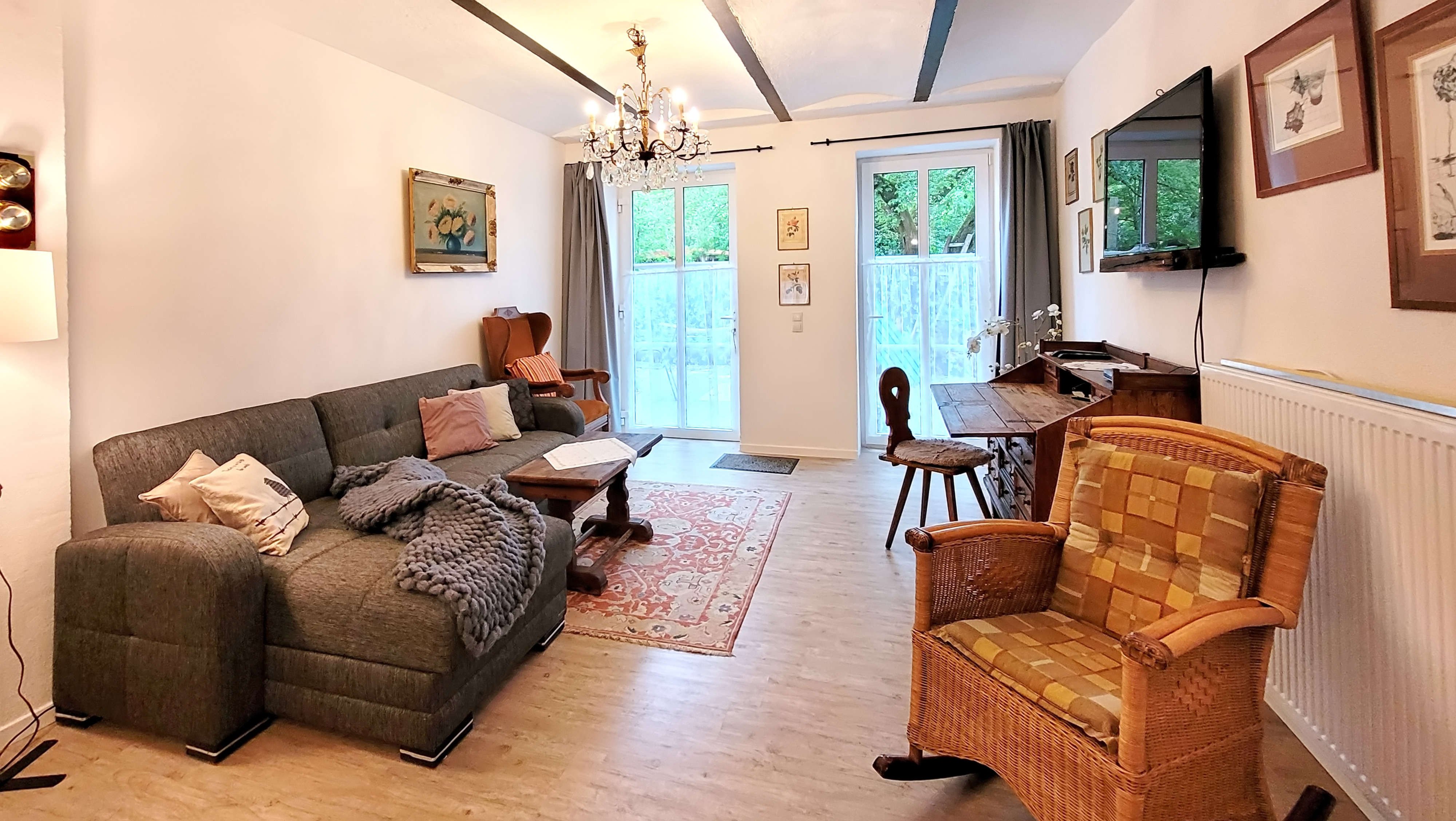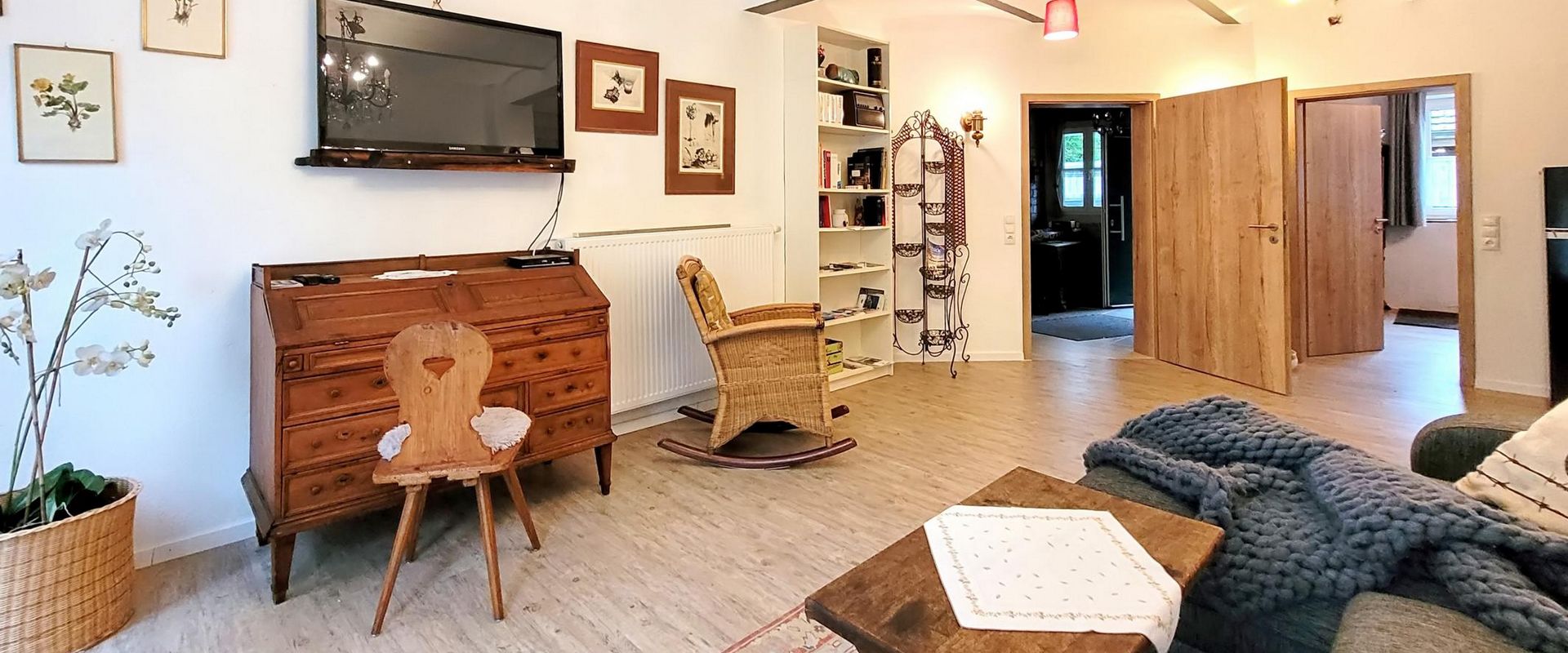 Unsere 2024 neu eingerichtete Ferienwohnung im ländlichen Stil bietet 100 m² Wohnfläche im Parterre für 1-4 Personen. Sie umfasst eine Wohnküche mit TV, Leseecke, voll ausgestatteter Küchenzeile mit Spülmaschine, Kaffeemaschine, Toaster und Wasserkocher. Das Wohnzimmer hat einen Zugang zur Terrasse mit Gartenmöbeln. Es gibt ein Schlafzimmer mit Boxspringbett, ein Schlafzimmer mit Doppelbett und ein Badezimmer mit Dusche und WC. Bettwäsche, Handtücher, WLAN und Parkplatz sind inklusive.
