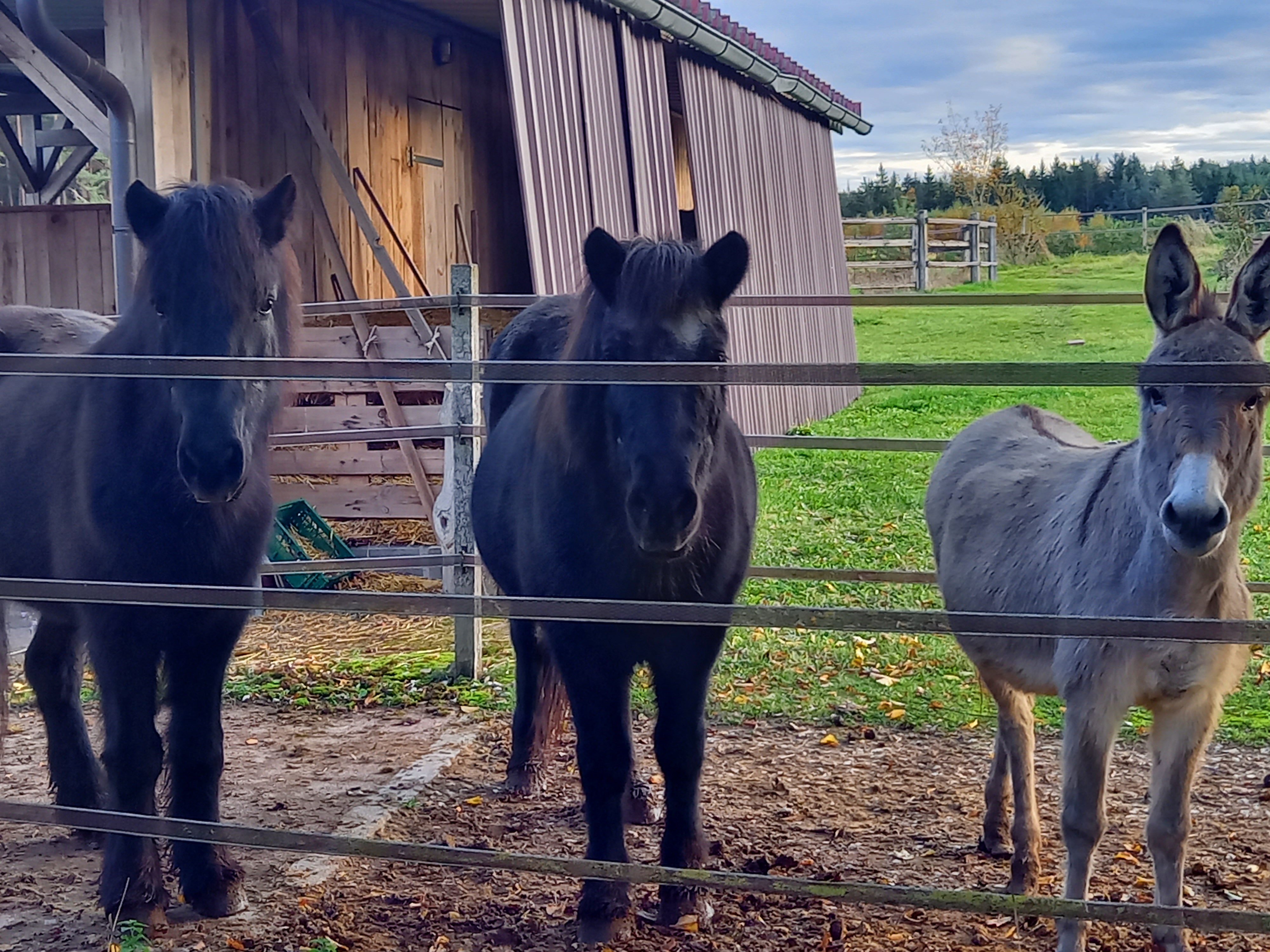In unmittelbarer Nachbarschaft befindet sich eine Weide mit Pferden, Esel und Ziegen.
