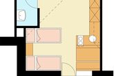 Dieses Studio ist ausgestattet mit zwei Einzelbetten, einem Tisch mit Stühlen, Küche mit Kühlschrank und Gefrierfach, Kochplatten, Mikrowelle mit Grill, Kaffeemaschine, Wasserkocher, Koch- und Tafelgeschirr, Fön, Safe, Hand- und Badetücher, Sat-TV, gratis W-Lan.Dusche und WC getrennt. Überdachter Balkon mit Gartenmöbel und Sonnenschirm.