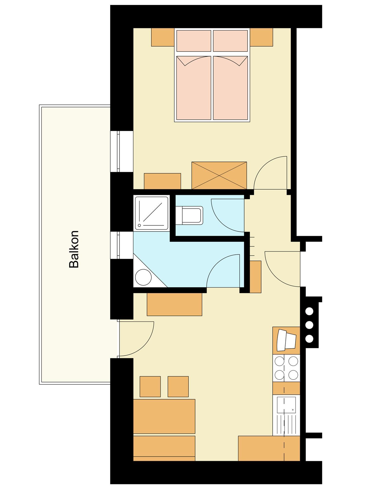 In der Wohnküche befindet sich eine Sitzecke, Kühlschrank mit Gefrierfach, Geschirrspüler, E-Herd mit Backrohr, Kaffeemaschine, Wasserkocher, Toaster, Koch- und Tafelgeschirr, Mikrowelle, Sat-TV, Fön, Safe, Hand- und Badetücher, gratis W-Lan. Im Schlafzimmer ist ein Doppelbett und es kann ein Zusatzbett für 1 weitere Person aufgestellt werden. Dusche und WC getrennt. Großer überdachter Balkon mit Gartenmöbel und Sonnenschirm.