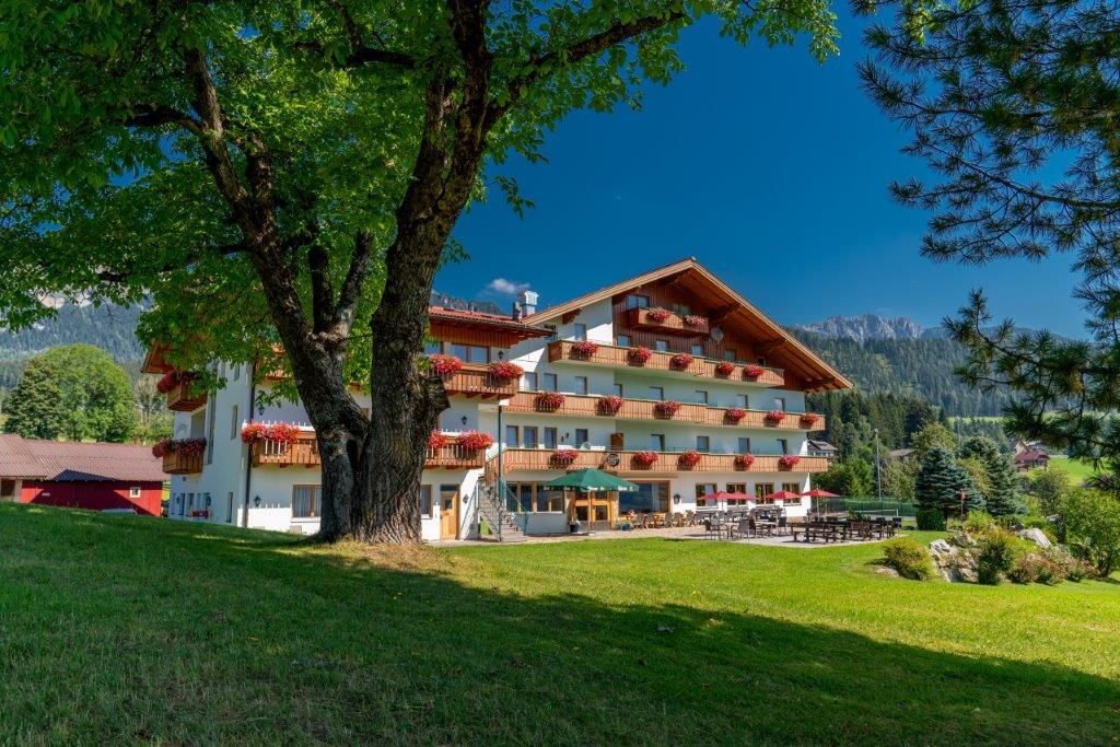 Unser Landhotel Kielhuberhof liegt im südlichen Teil der Ramsau, inmitten der eigenen grünen Wiesen: eine traumhaft ruhige und sonnige Lage am Fuße des Dachsteins mit freiem Panoramablick auf die Planai und die Niederen Tauern. Die vielen Sport- und Freizeitmöglichkeiten wie langlaufen, wandern oder Ski fahren laden zu einem einzigartigen Urlaub in die Ramsau ein! Der Skibus in die familienfreundlichen Skigebiete Ramsau und Ski amadé hält direkt beim Hotel Kielhuberhof. Der Kielhuberhof bietet Ihnen gemütliche Einzel- und Doppelzimmer, ein ebenerdig begehbares, barrierefreies Doppelzimmer mit Zugang über eine eigene Haustüre, geräumige Familienzimmer sowie Appartements und Ferienwohnungen für bis zu 6 Personen. Auch größere Gruppen sind bei uns im Hotel Kielhuberhof gerne willkommen. Alle Zimmer und Ferienwohnungen sind im modernen Landhaus-Stil eingerichtet und verfügen ab der Kategorie 25m² über neue große Wohlfühl-Badezimmer und über einen herrlichen Balkon mit Aussicht auf die umliegende Bergwelt. In den geräumigen Familienzimmern für 2 - 5 Personen finden Sie einen Vorraum mit Garderobe und eine kleine Küchenzeile mit bequemer Essecke. Gerne bieten wir Ihnen auch 1 barrierefreies Zimmer mit einem speziell auf die Bedürfnisse von Rollstuhlfahrern abgestimmten Badezimmer an. Für Ihr leibliches Wohl sorgen wir mit unserem reichhaltigen Frühstücksbuffet mit Produkten heimischer Bauern und dem köstlichen 3- oder 4-Gang Wahlmenü mit vegetarischer Alternative, Salat- und Dessertbuffet. Im Sommer laden wir einmal wöchentlich zu einem gemütlichen Grillabend ein. Das Hotel Kielhuberhof bietet Ihnen eine Freizeithalle mit Tischtennis, Tischfußball und Billard, einen 400 m² großen Natur-Schwimmteich, eine Liegewiese, 2 Tennisplätze und einen Sportplatz für Fußball, Volleyball und Badminton. Nach einem aktiven Tag mit Wandern oder Langlaufen, entspannen Sie im neu gestalteten Wellnessbereich des Landhotels Kielhuberhof. Der Panorama-Wellnessbereich erstreckt sich über 2 Etagen und bietet eine urige Blockholz-Sauna-Hütte. Relaxen Sie auch in der Bio-Sauna, dem Kräuterdampfbad, der Infrarotkabine und im Ruheraum mit Blick auf das Dachstein-Massiv. Auf Anfrage organisieren wir für Sie entspannende Wohlfühl-Massagen. Von der Sonnenterrasse genießen Sie bei einem hausgemachten Apfelstrudel einen herrlichen Ausblick auf die Naturkulisse der Dachstein-Tauern-Region. In der gemütlichen Stube mit offenem Kamin verbringen Sie gediegene Stunden mit einem spannenden Buch oder bei einem Glas guten Österreichischen Weins. Im Sommer lädt Sie die idyllische Umgebung der Ramsau am Dachstein zu gemütlichen Spaziergängen, aktivem Nordic-Walking und Wanderungen auf die urigen Almen der Region ein. Für Kinder bieten Hochseilgärten, Freizeitparks und Naturlehrpfade spannende Erlebnisse. Den Winter in der Ramsau verbringen Sie auf den herrlich präparierten Pisten der Skigebiete Ramsau und Planai, auf den traumhaft gespurten Langlaufloipen, auf den Winterwanderwegen zu Fuß oder im Pferdeschlitten, oder ganz gemütlich in einer der umliegenden Hütten. Familie Tritscher freut sich schon sehr, Sie im Landhotel Kielhuberhof in Ramsau am Dachstein zu begrüßen und zu bewirten!