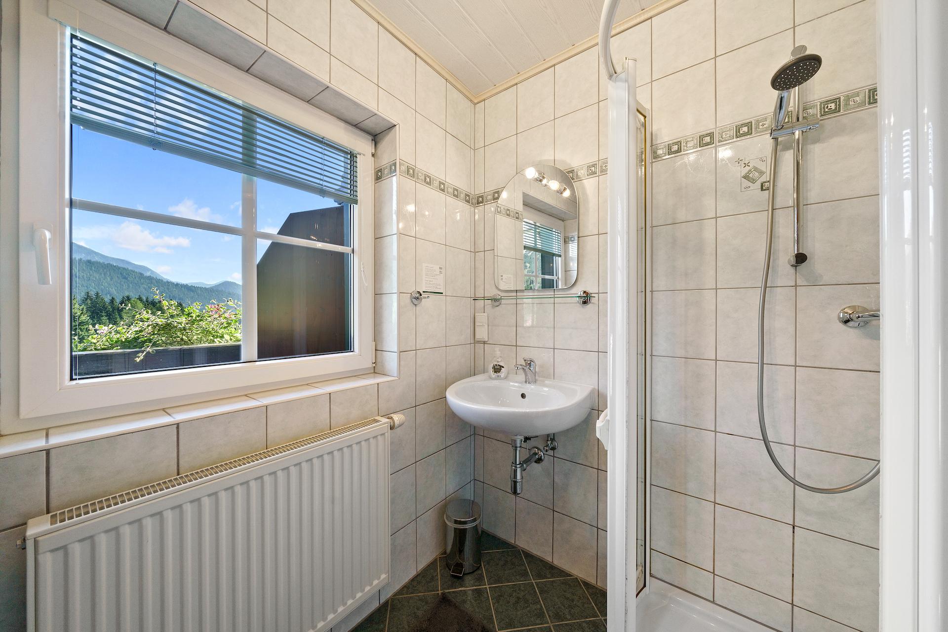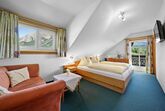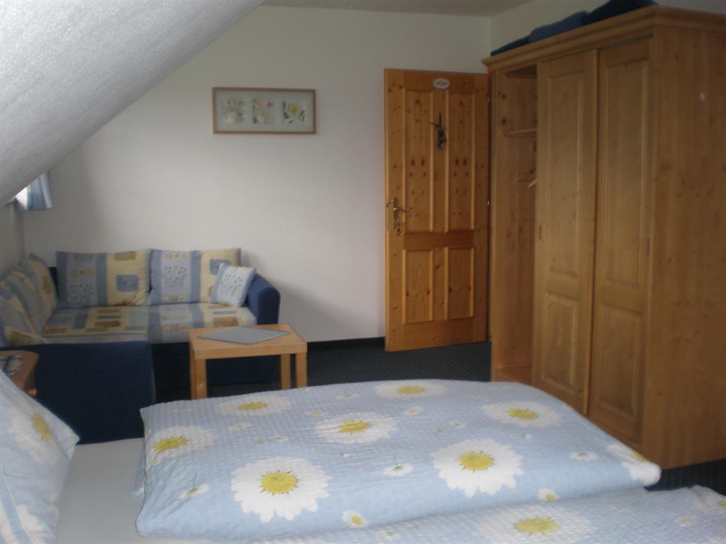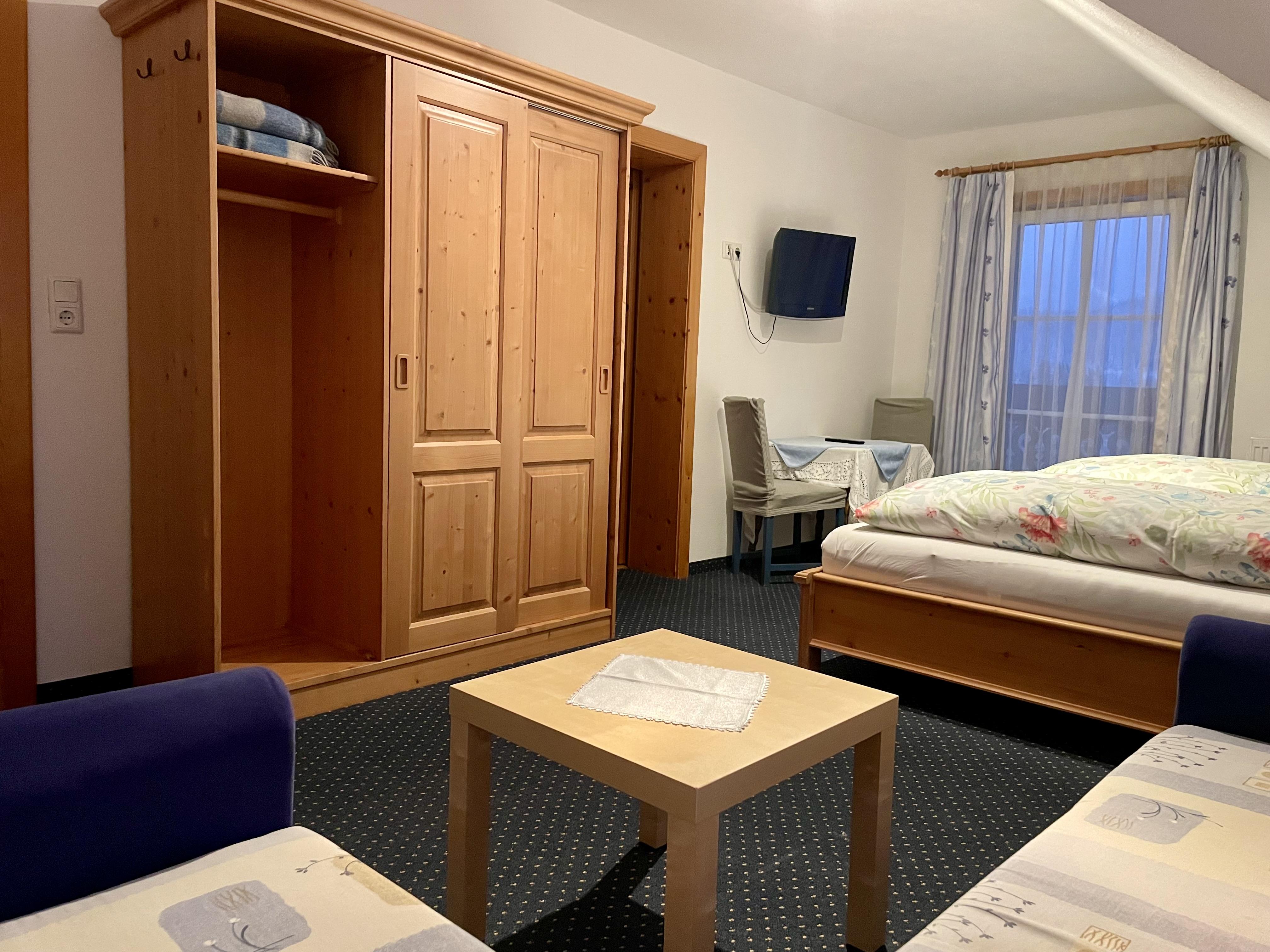 Geräumiges Doppelzimmer mit Dusche, WC, Balkon, Sat-TV, W-Lan, Kühlschrank und Wasserkocher.