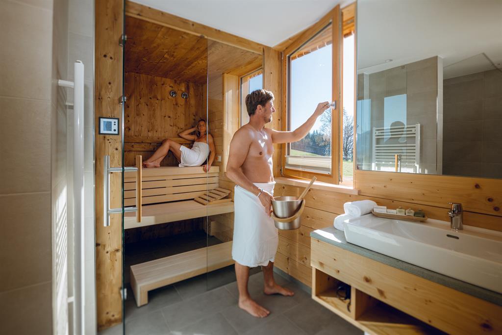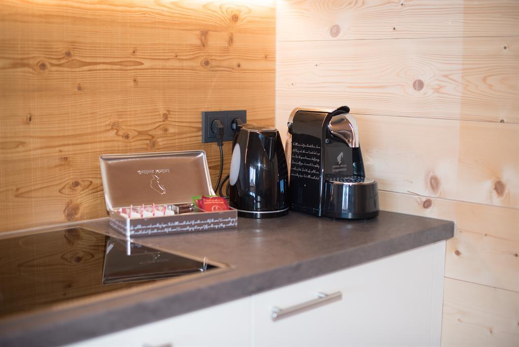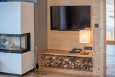 64 m² Wohnfläche für 2 - 4 Personen, ein Schlafzimmer mit Doppelbett, ein Wohnraum mit Essecke und ausziehbarer Couch für 1 - 2 Personen, ein Badezimmer mit Dusche, WC und privater 4 m² Sauna, Radio, Kosmetikspiegel, Haartrockner, ein zusätzliches Badezimmer mit WC, Dusche und Waschbecken, Küchenzeile mit Elektro-Herd, Backrohr mit Mikrowelle, Kapsel-Kaffeemaschine, Wasserkocher, Geschirrspüler und Kühlschrank, Kamin, französischer Balkon oder Balkon, Bademantel, Schlapfen, Saunahandtücher, Flat-HD-SAT-TV mit Radio, free Wi-Fi, Safe, Telefon.