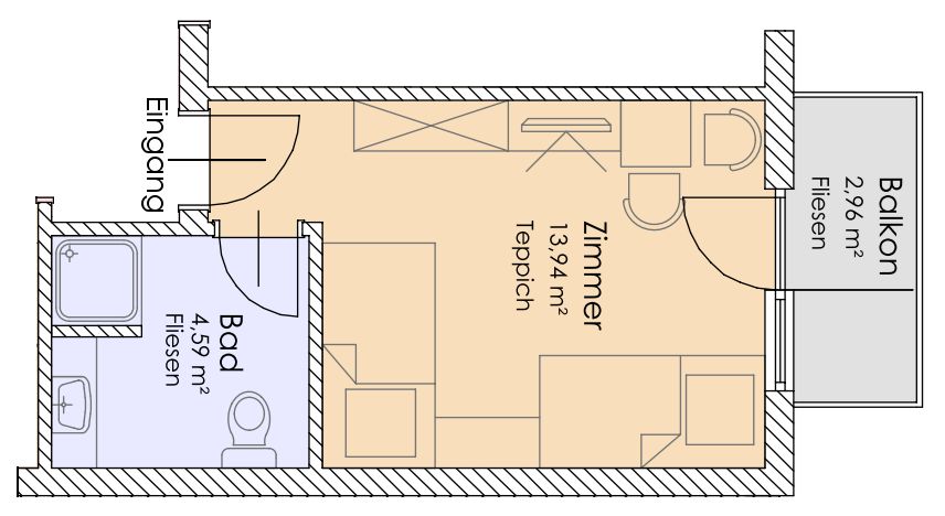 Doppelzimmer mit getrennten Betten für 2 Personen, Dusche, WC, SAT-TV,