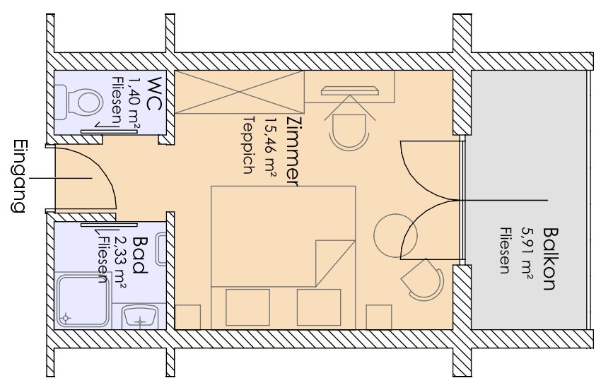 Doppelzimmer mit Balkon, Dusche und WC getrennt,Sat-TV, Telefon, Safe, Föhn, Bademantel. Zimmer mit Teppich oder Holzboden.