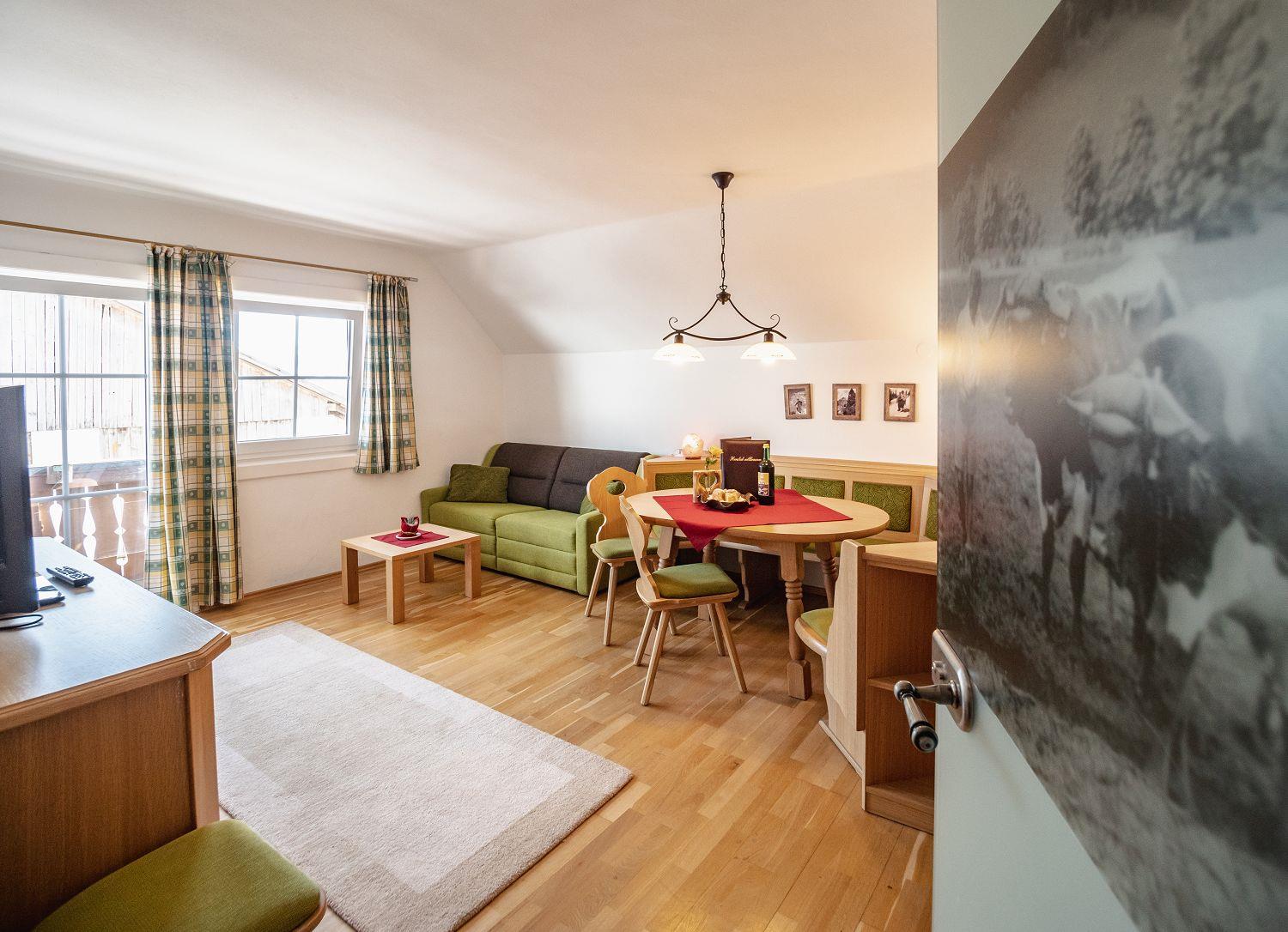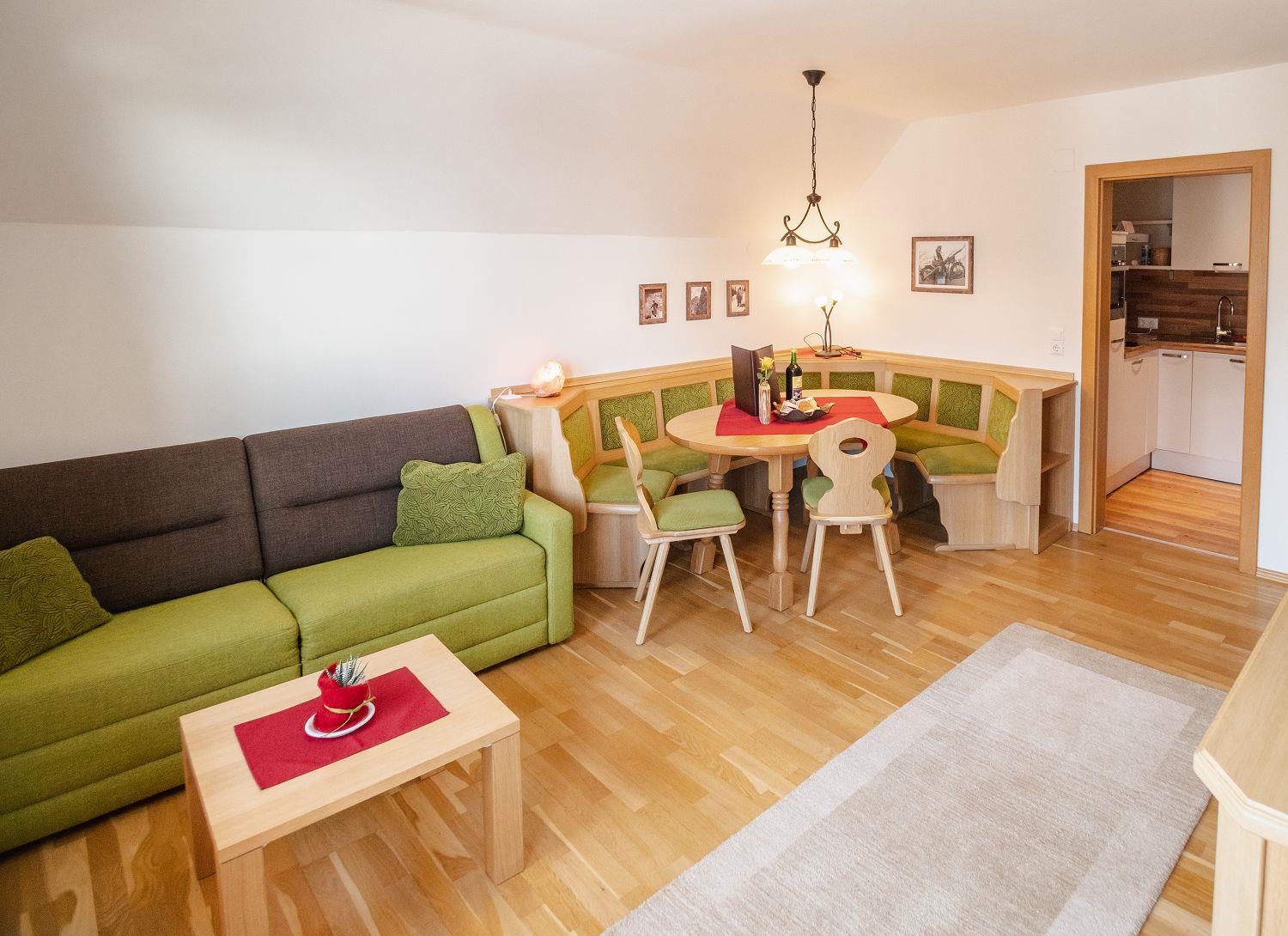 Eine im Landhaus Stil eingerichtete Ferienwohnung mit 45m². Dieses Appartement ist ideal für 2 – 4 Personen und bietet Ihnen jeglichen Komfort den Sie in Ihrem Urlaub wünschen. Das Holz-Loden Schlafzimmer mit Balkon und Badezimmer lädt für kuschelige Stunden ein. Im Wohnraum mit Sitzecke und gemütlicher Couch (Schlafmöglichkeit für 2 Personen) sowie einer voll ausgestatteten Küche können Sie bei einer heißen Tasse Tee verweilen.