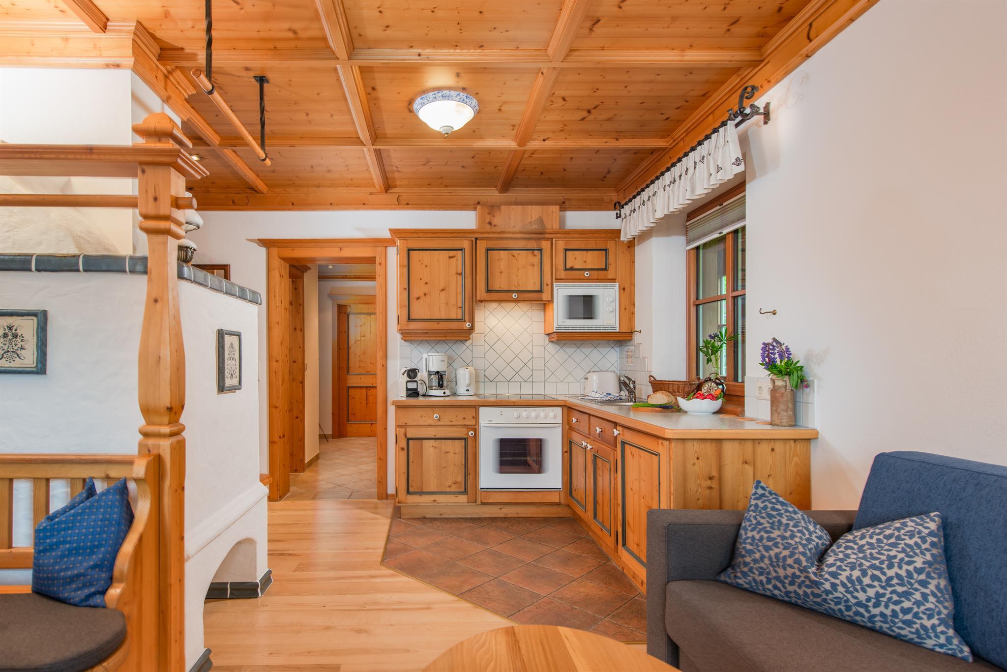 Das Appartement ist ausgestattet mit 2 Schlafzimmer, 1 Wohnzimmer mit Kachelofen, TV, Geschirrspüler mit Küche, Mikrowelle, E-Herd, Kühlschrank, 2 Bad/Dusche, 2 WC, Vorraum, Balkon und eigener privater Sauna