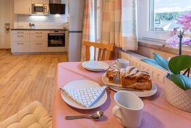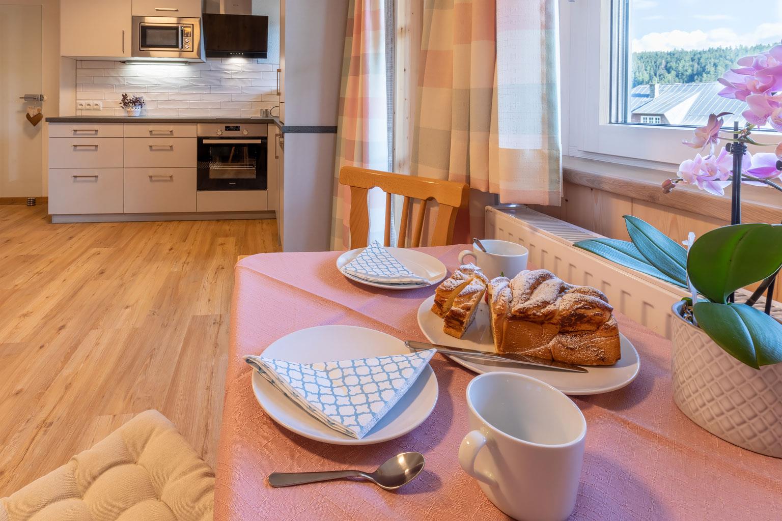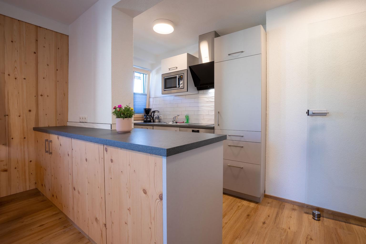 Zudem bieten wir Ihnen komplett ausgestattete Komfort-Ferienwohnungen mit jeweils einem großen Schlafzimmer, einer Wohnküche mit gemütlicher Sitzecke sowie einem sehr geräumigen Badezimmer mit Dusche/WC. Auf Wunsch besorgen wir Ihnen gerne täglich frisches Gebäck oder können sie sich auch mit einem Frühstück verwöhnen lassen ohne auf einen geräumigen Wohnraum verzichten zu müssen. Unser Highlight sind unsere neuwertigen Appartements im 1. OG, welche wir liebevoll mit viel Holz und Licht gestaltet haben.