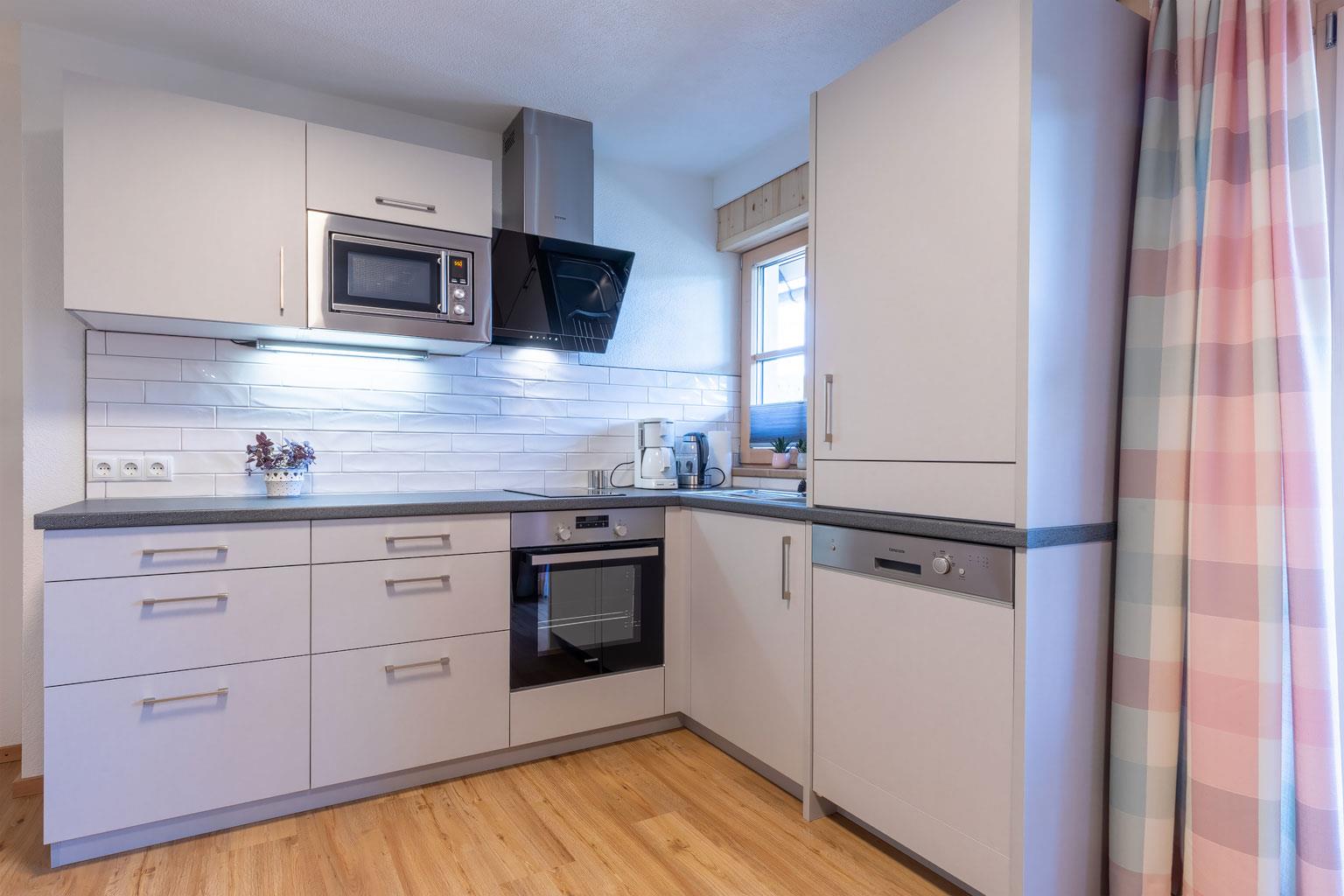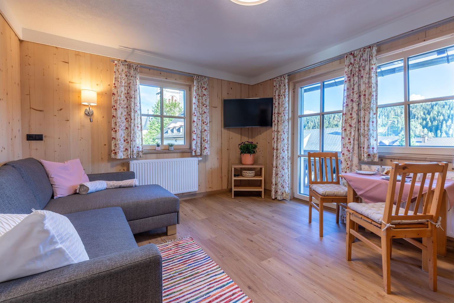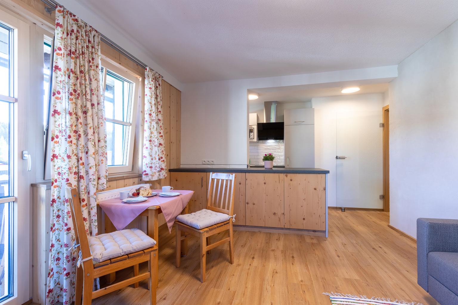 Unser Appartement II Enzian befindet sich im 1. OG und ist Richtung Süden/Westen ausgerichtet. Das Appartement ist nach der Renovierung 2021 eine sonnige, gemütliche Oase zum Ausspannen. Viel Holz und eine liebevolle Einrichtung laden zum Entspannen und genießen ein. Ein Doppelzimmer mit Holzboden und Holzmöbel, ein großzügiges Bad mit Dusche, separatem WC, geräumiger Vorraum runden das Highlight - die Wohnküche Richtung Süden mit Balkon ab. Die Wohnküche wurde mit einer toll ausgestatteten Küche, mit Esstisch sowie einem gemütlichem Sofa mit Fernsehecke gestaltet. Der helle, freundliche Raum lädt bei jedem Wetter zum Genießen ein – bei Sonnenschein auch mal am Balkon.