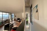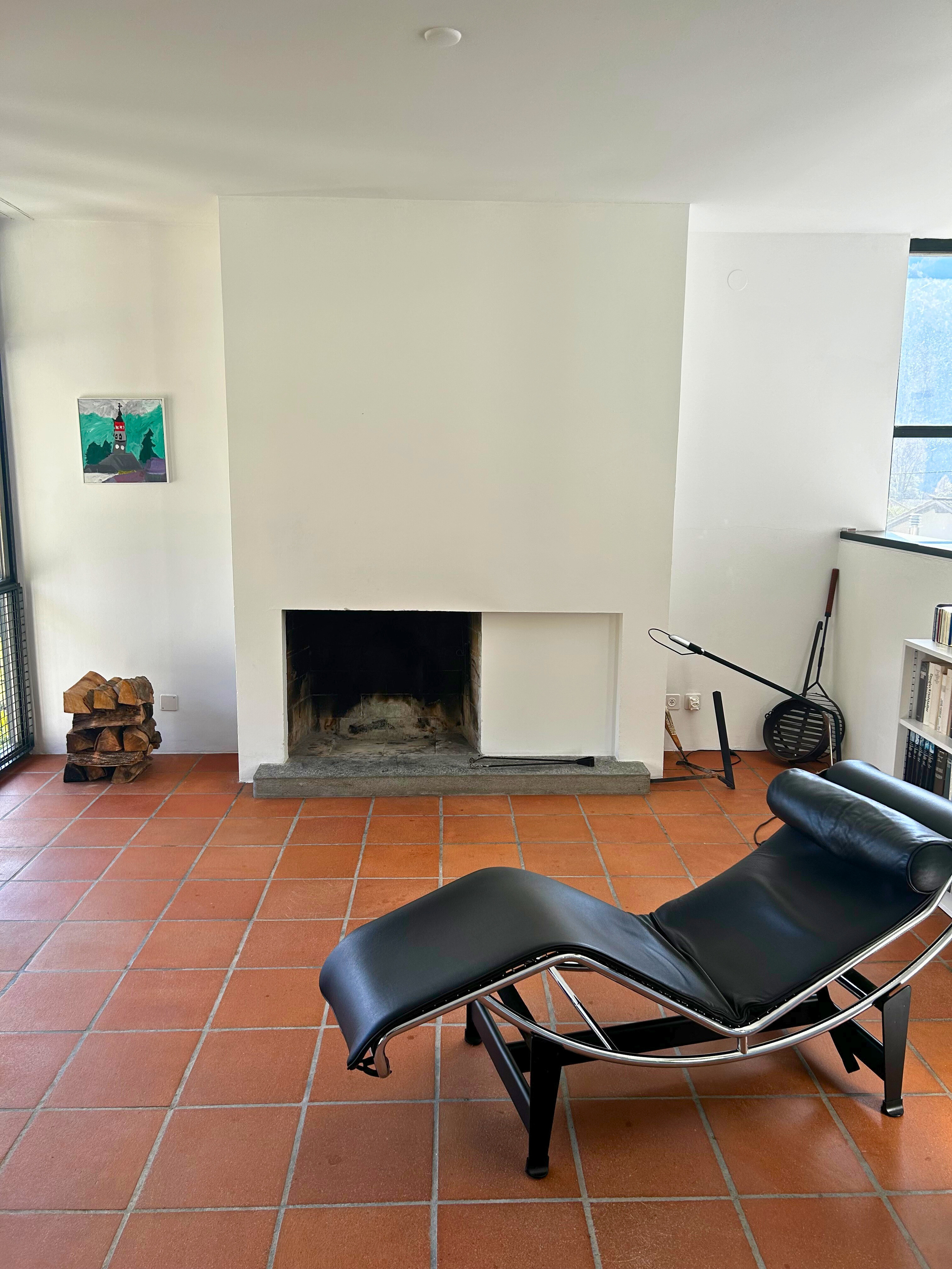 In der ersten Ebene angekommen, weitet sich der Blick. Das lichtdurchflutete, mit Möbeln und Drucken bekannter Design-Ikonen ausgestattete Wohnzimmer öffnet sich über eine wandfüllende Fensterfront zum Garten hin. Die Bruchsteinmauer der Terrasse reicht bis in Wohnzimmer hinein. So entsteht ein kunstvoller wie stimmungsvoller Dialog zwischen Innen und Außen, der durch großartige Aussichten auf Verscio und die Bergwelt gekrönt wird. An kühlen Tagen lädt die Chaise Longue von Le Corbusier zu entspannten Lesestunden vor dem Kamin ein. Eine erlesene Buchauswahl haben Sie dabei unmittelbar zur Hand.