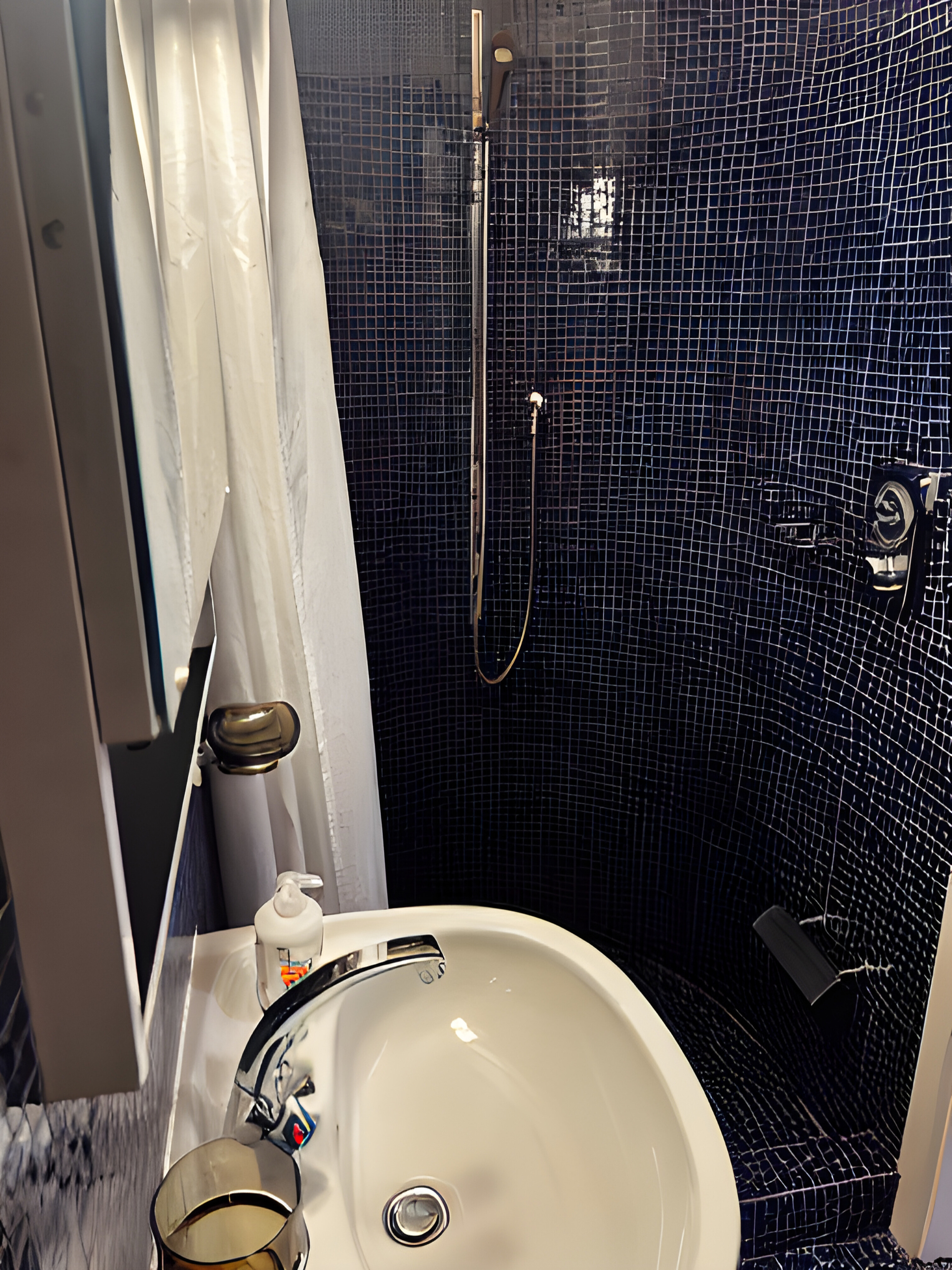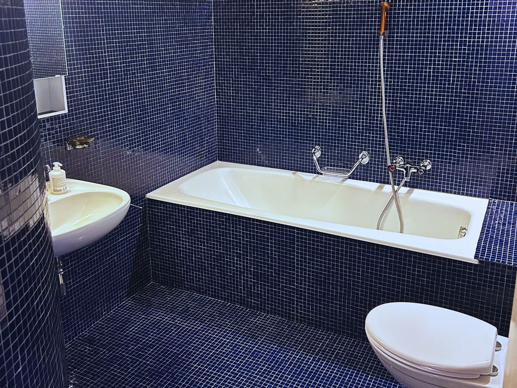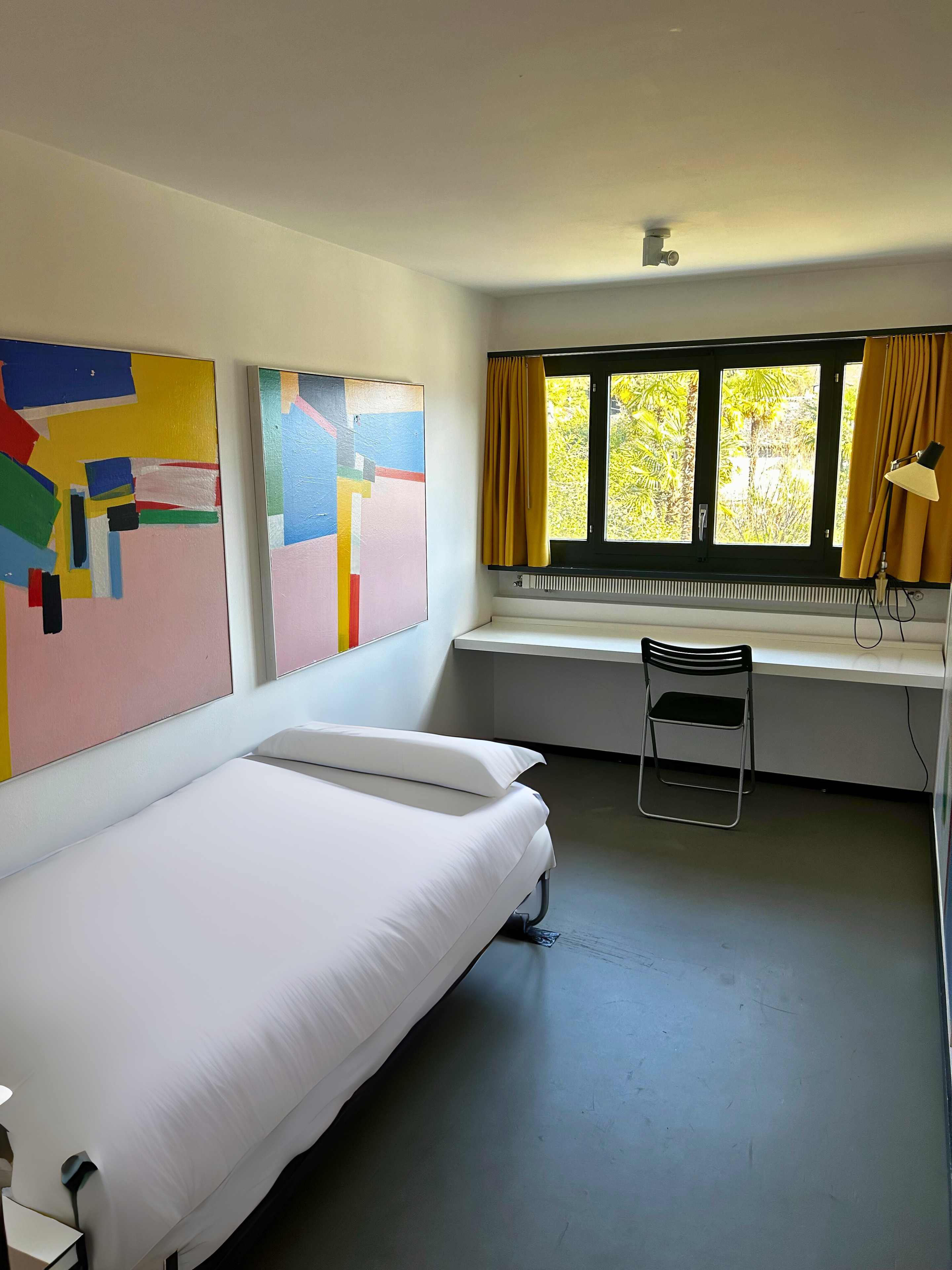 Alle im Haus verwendeten Farben entsprechen dem originalen Farbkonzept. So präsentieren sich die Trennwände der Schlafzimmer sowie die Einbauschränke in einem satten, glänzenden Gelb. Das großzügige Badezimmer leuchtet strahlend blau.