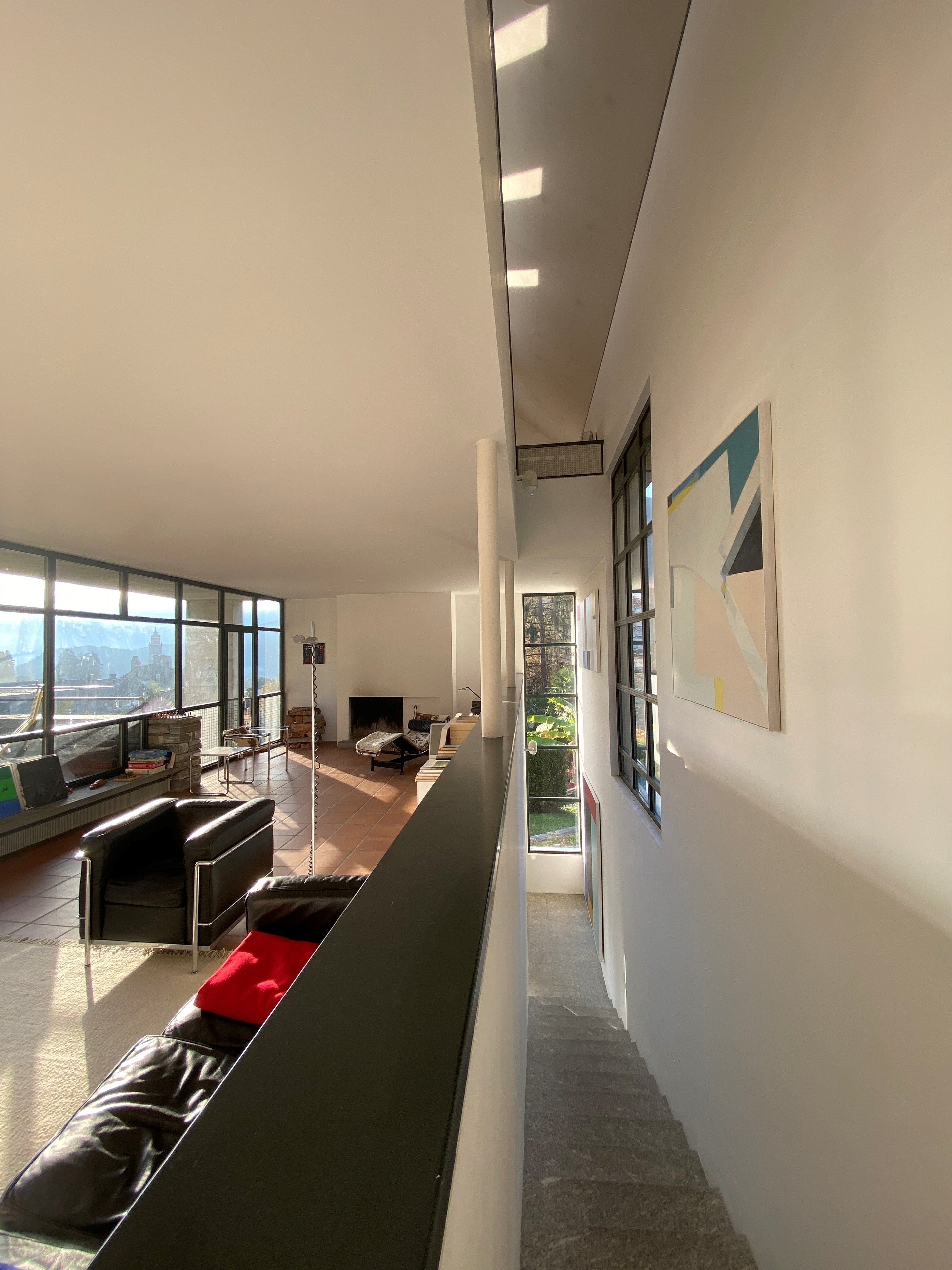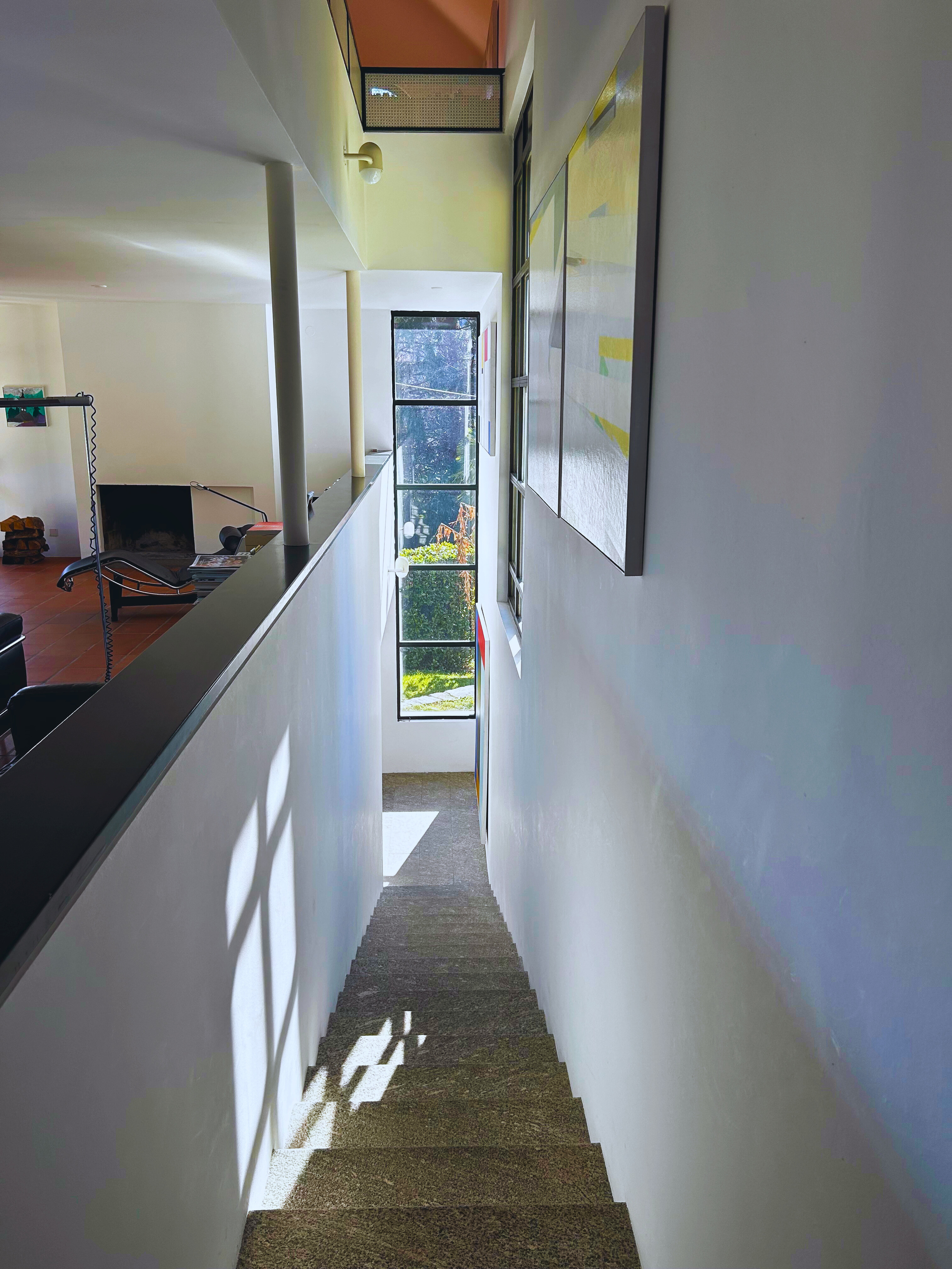 Daher ist auch die Villa Cavalli äußerst ästhetisch in die Umgebung eingebettet. Das 1976 erbaute Meisterwerk schmiegt sich an einen ehemaligen Rebberg und liegt in herrlicher Stille nur 100 Meter vom Dorfkern entfernt. Der aus dem Zentrum herausführende, von einer pittoresken Steinmauer gesäumte Fußweg Caraa du Vanign scheint direkt in das Haus hineinzulaufen und setzt sich im Inneren als Promenade architecturale mit einer lichtvollen Granittreppe fort, deren Luftraum bis ins Dach reicht.