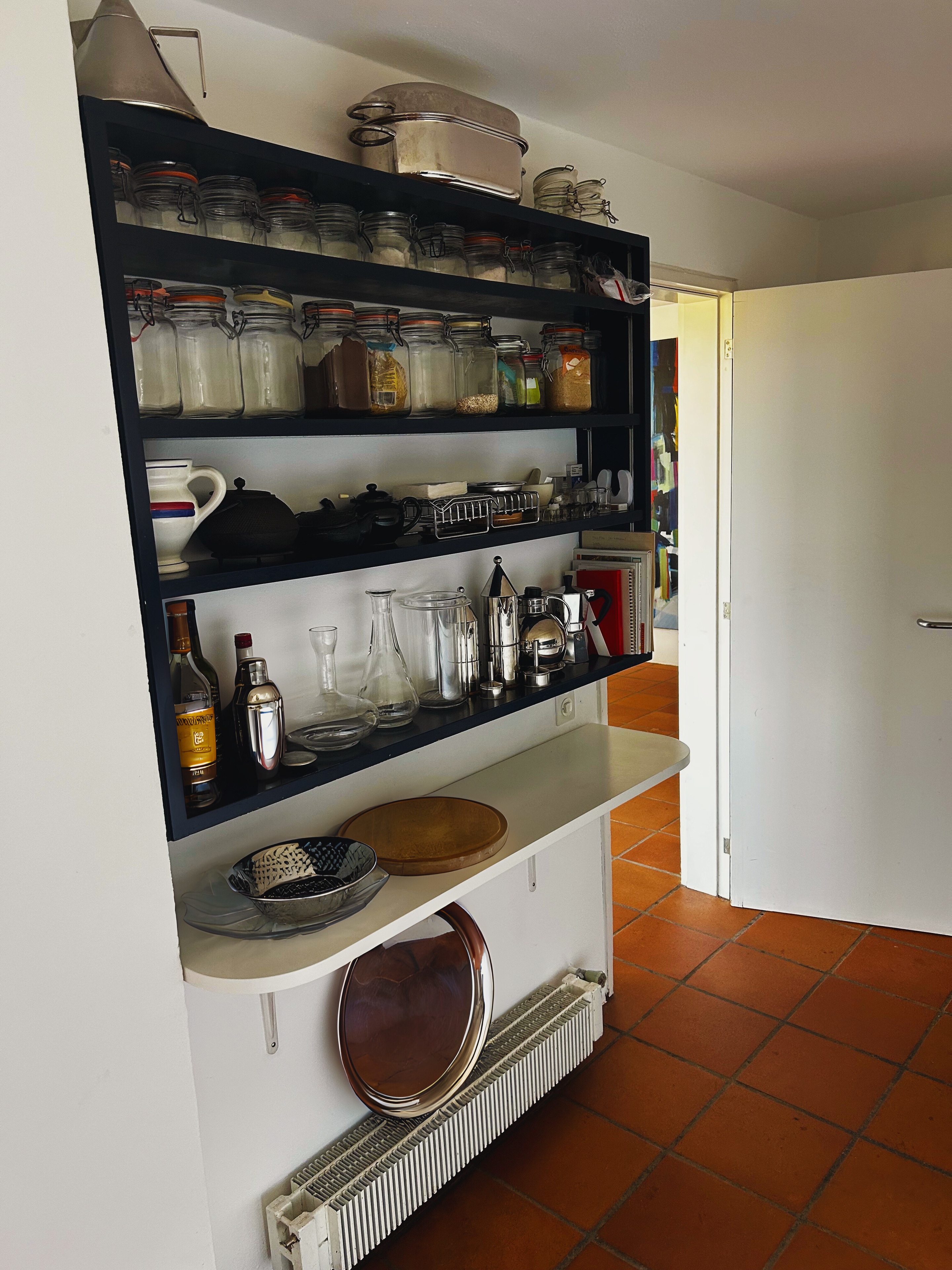 Genau wie die Küche. Fenster- und Türrahmen sowie die Stirnseiten einzelner Möbel sind in einem dunklen Moosgrün gehalten.