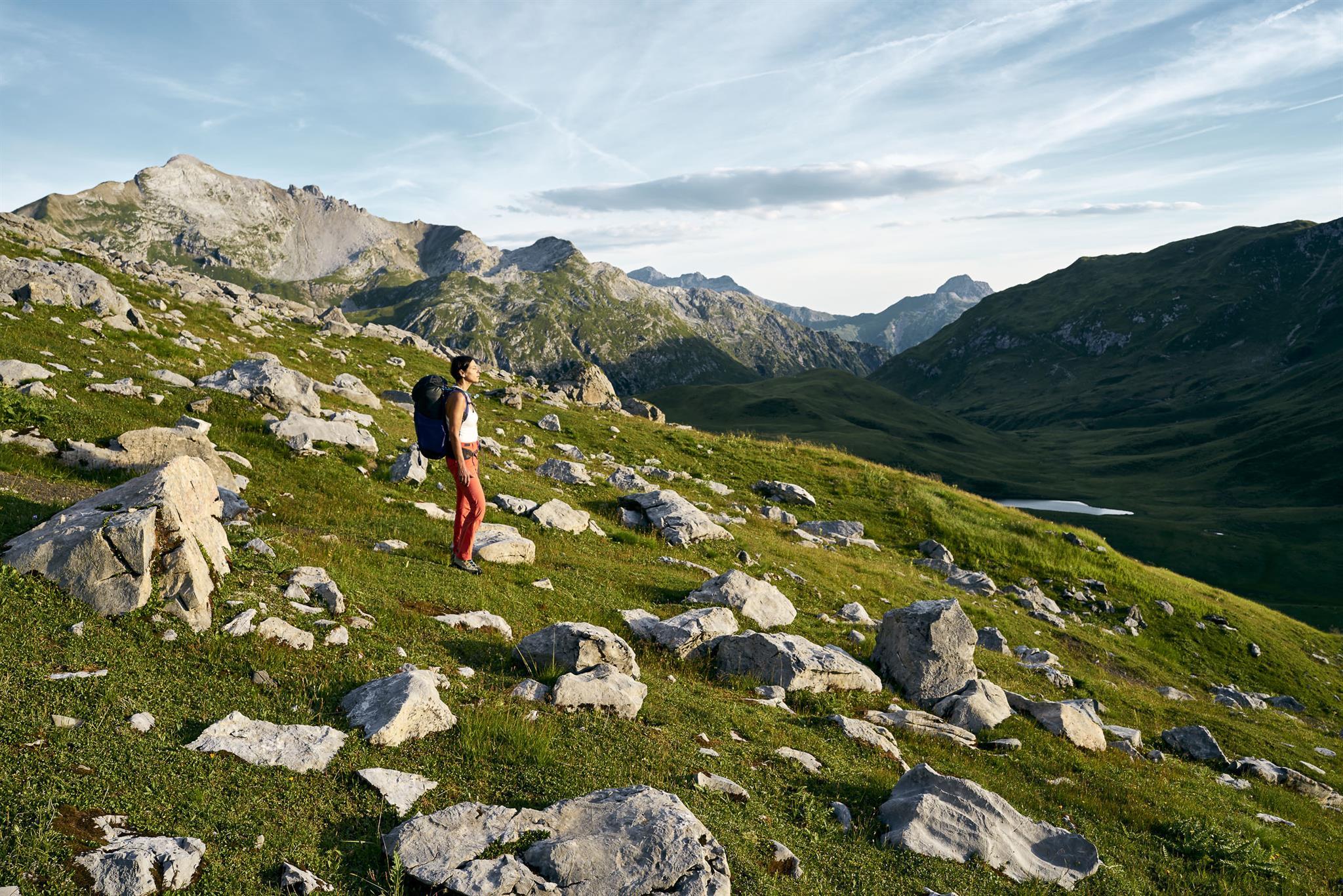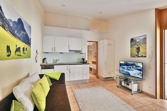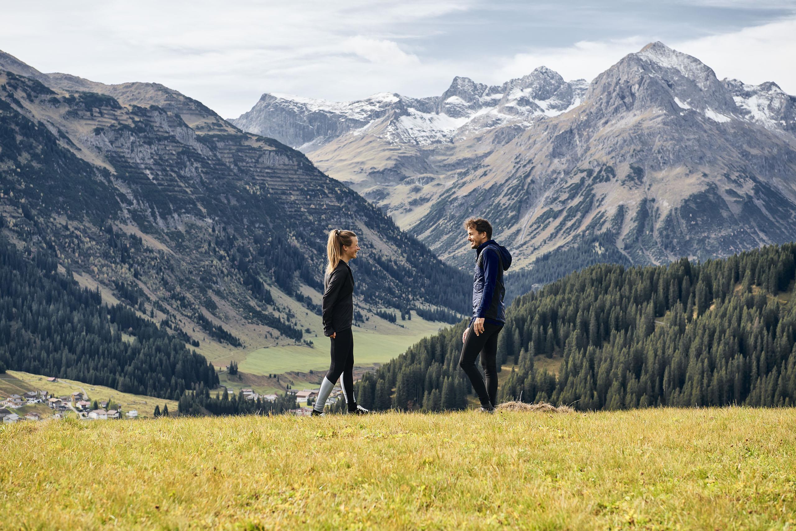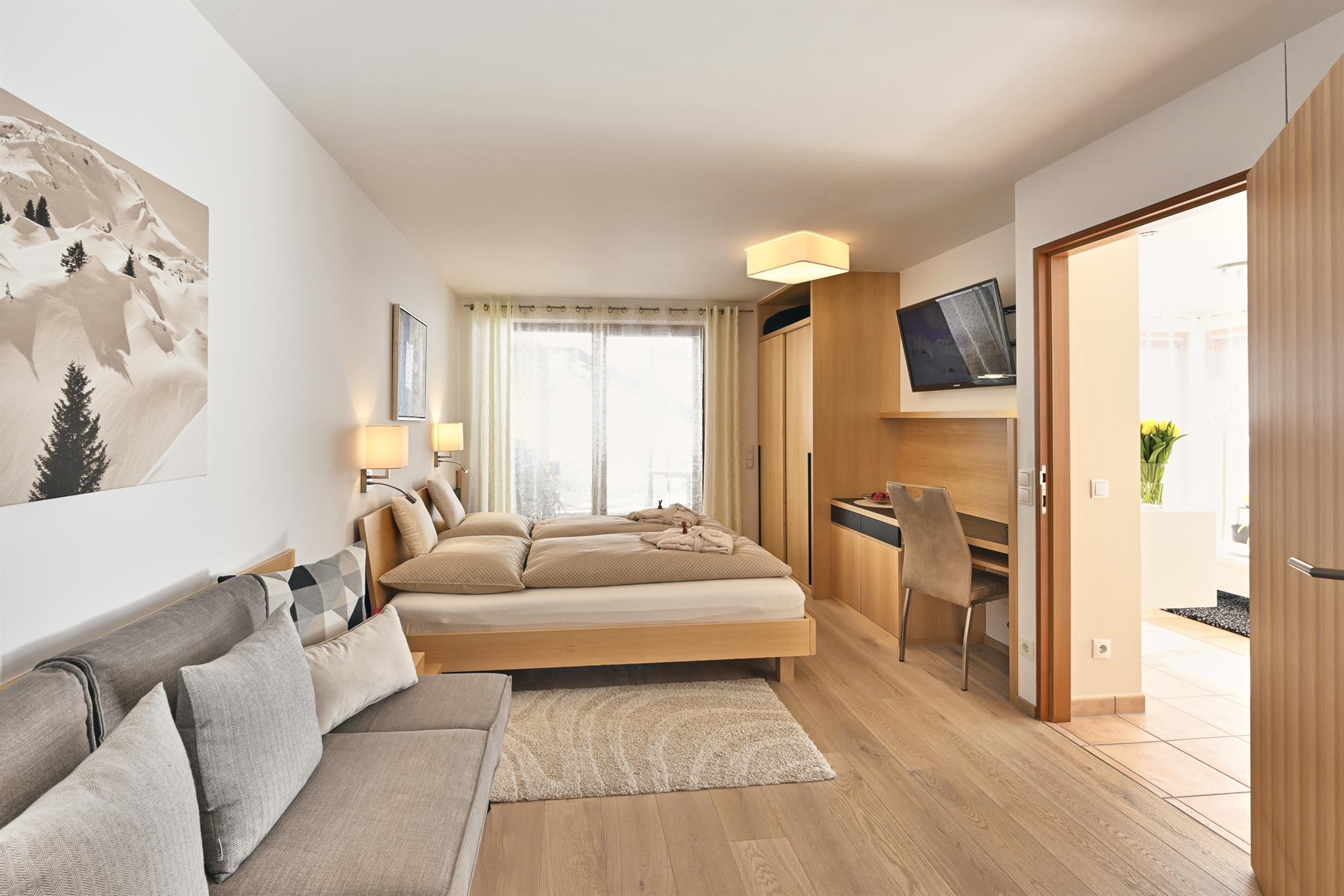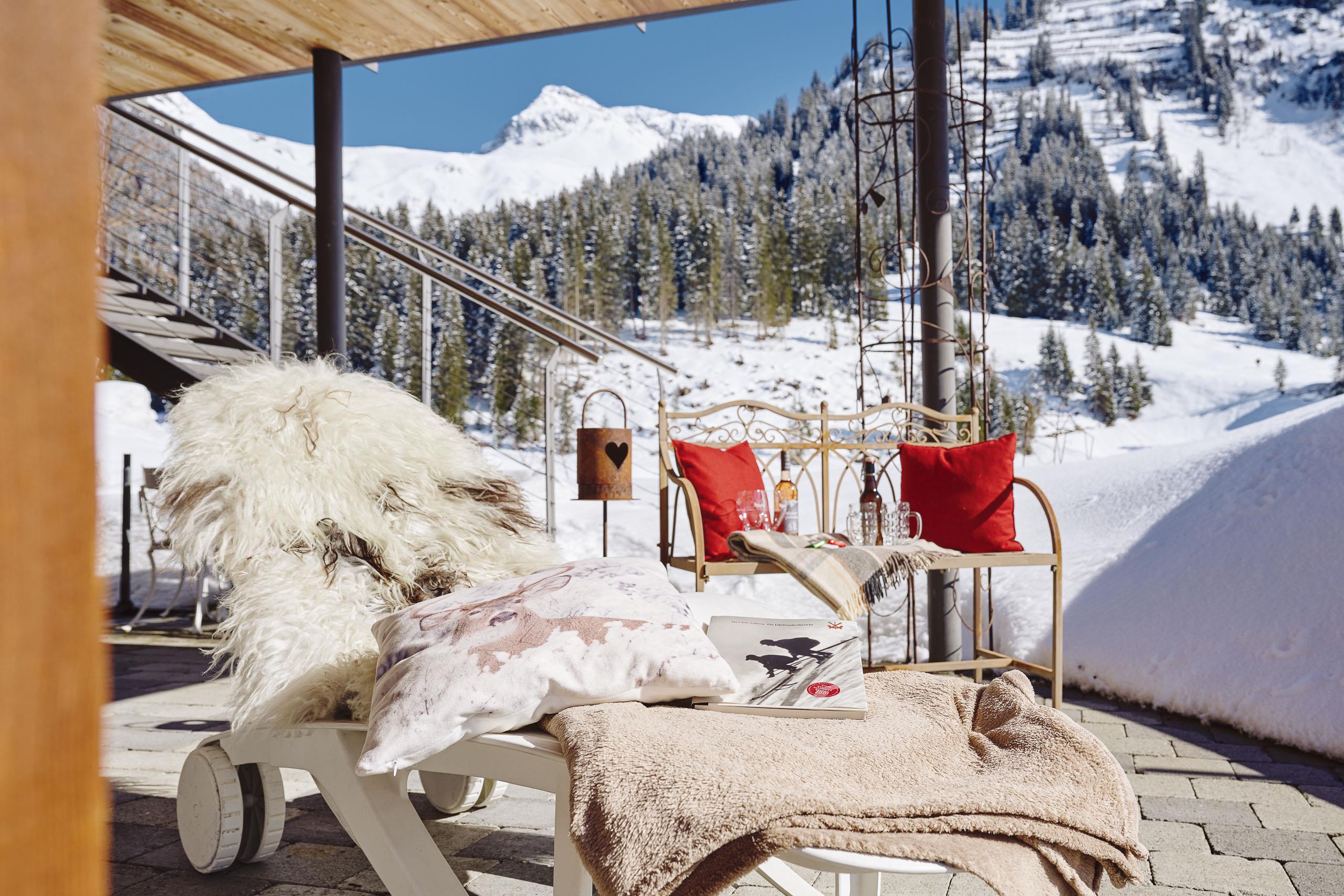 Zwei Glasschiebetüren bieten einen herrlichen Blick auf die Berge und ermöglichen den Zugang zum großen Balkon. Genießen Sie den herrlichen, unverbauten Blick auf Lech, den Omesberg und das Kriegerhorn.