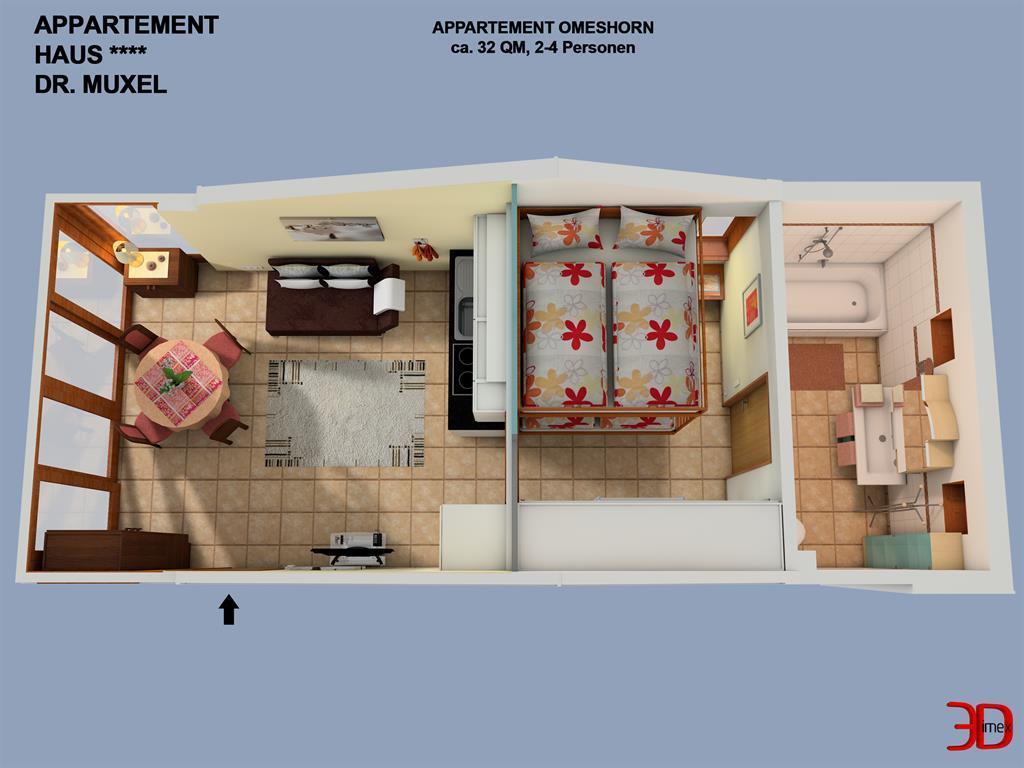 32 m2 Wohnfläche; bis zu 4 Personen (2 Erwachsene + 2 Kinder bis zum Alter von max. 10 Jahren; Kinder ab 10 Jahren oder 3. Erwachsener auf Anfrage)