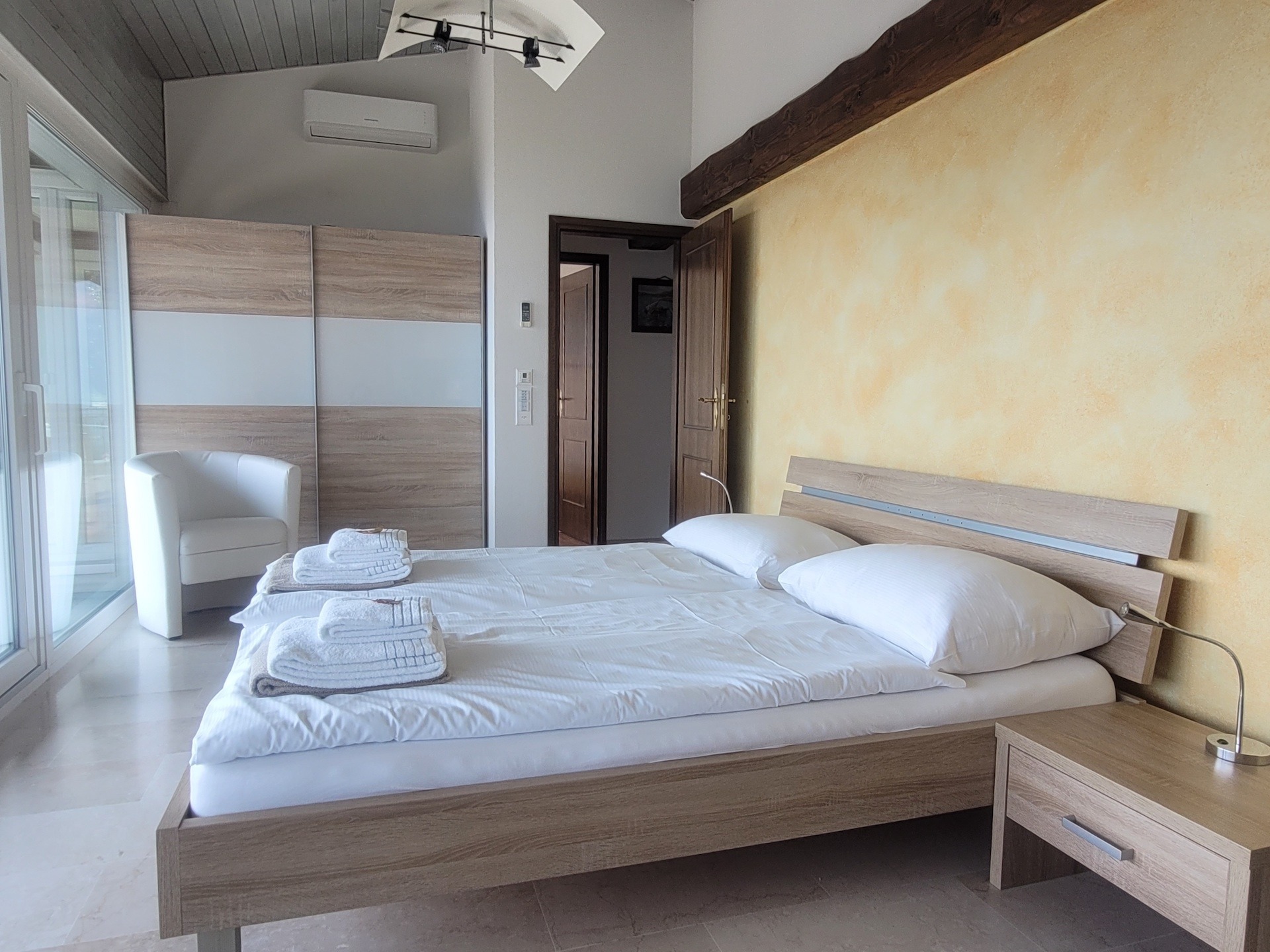 Sie möchten sich zurückziehen? Über eine charmante Wendeltreppe gelangen Sie vom Wohnbereich in die erste Etage. Hier stehen ein Badezimmer mit Dusche sowie zwei Schlafzimmer mit Seeblick zu Ihrer Verfügung: Ein kleineres Zimmer mit zwei Einzelbetten sowie ein größeres Zimmer, das neben einem Kingsize-Doppelbett auch den Komfort eines Kamins und einer Klimaanlage bietet. Beide Schlafzimmer haben einen direkten Zugang zum Balkon.