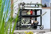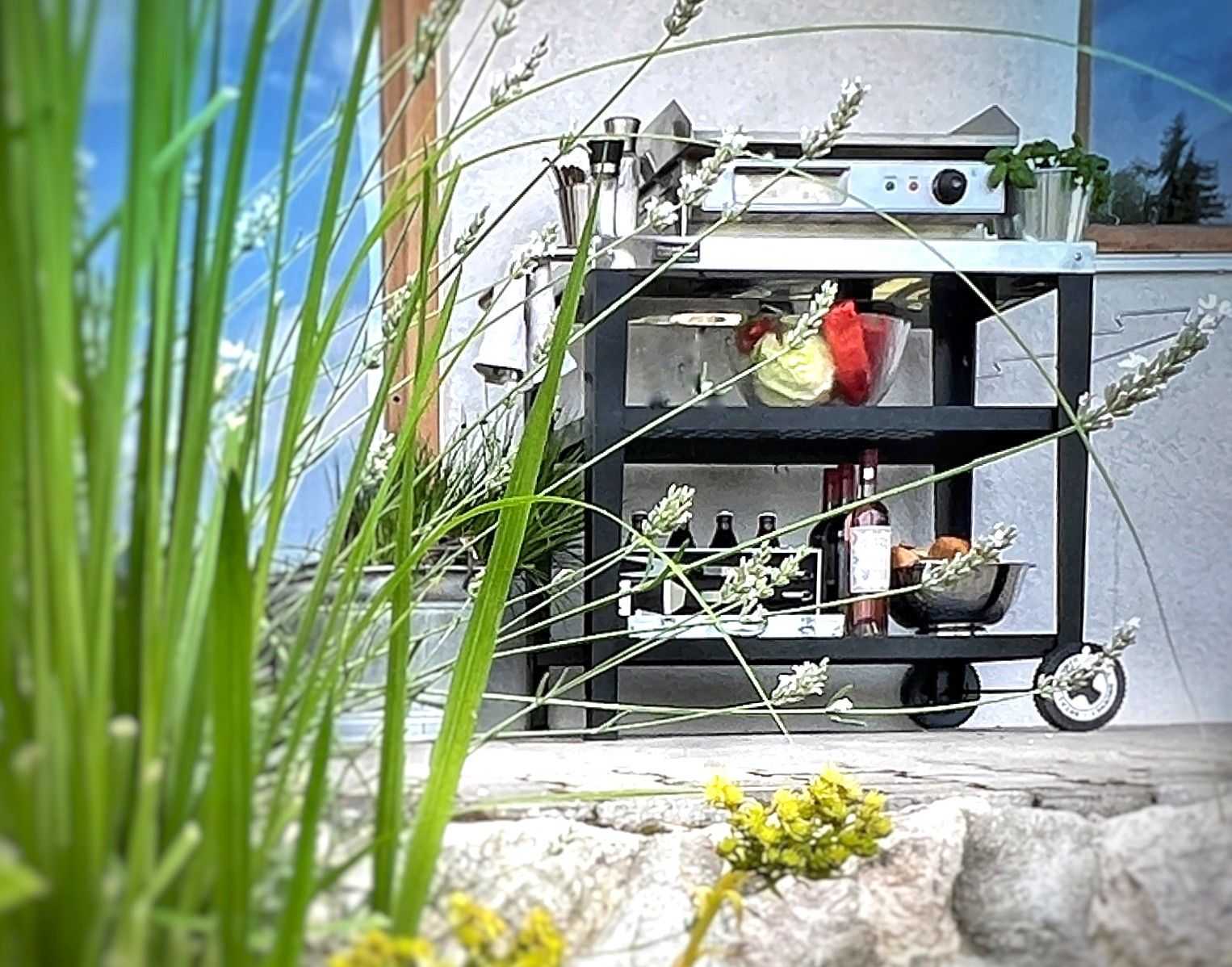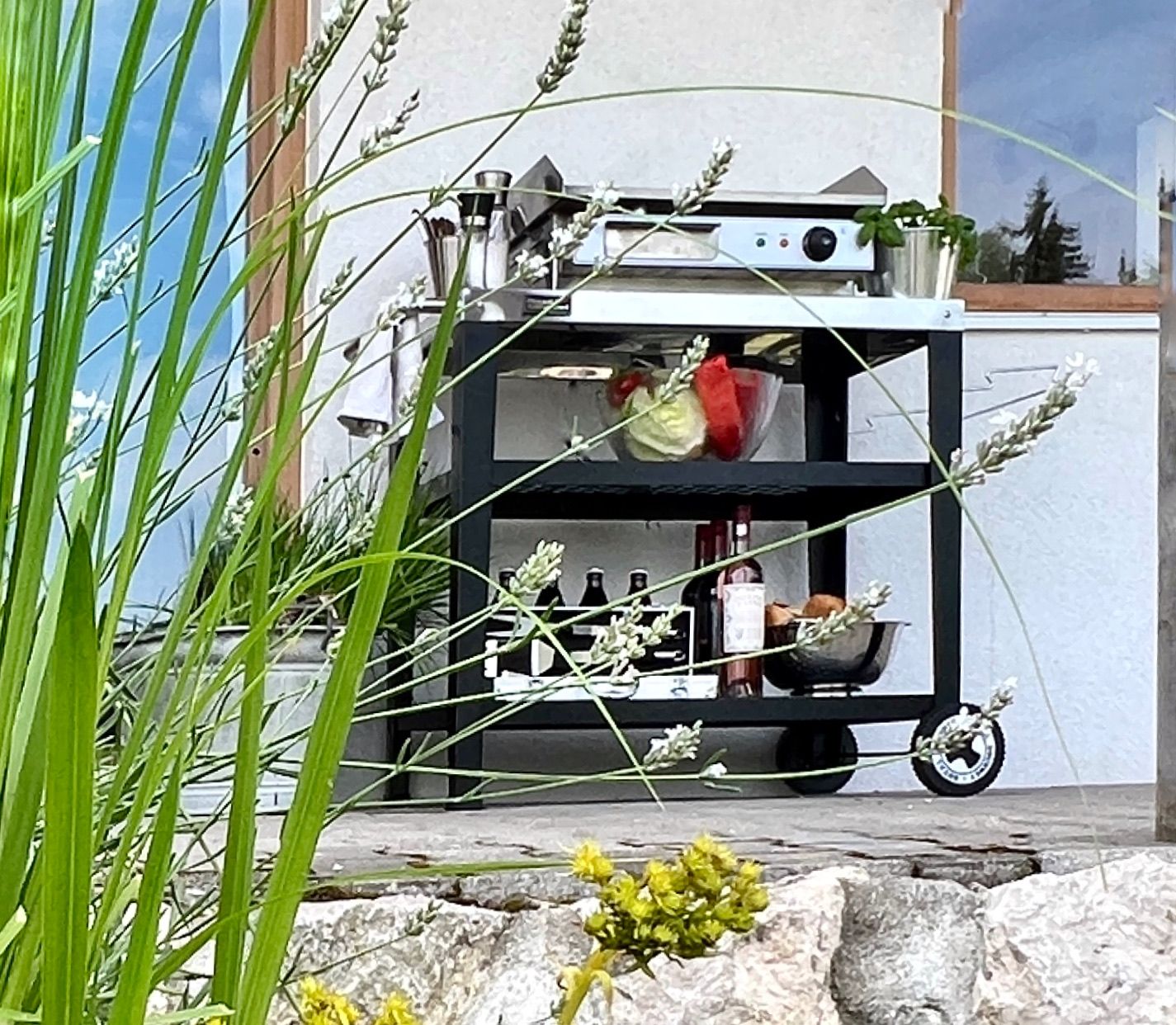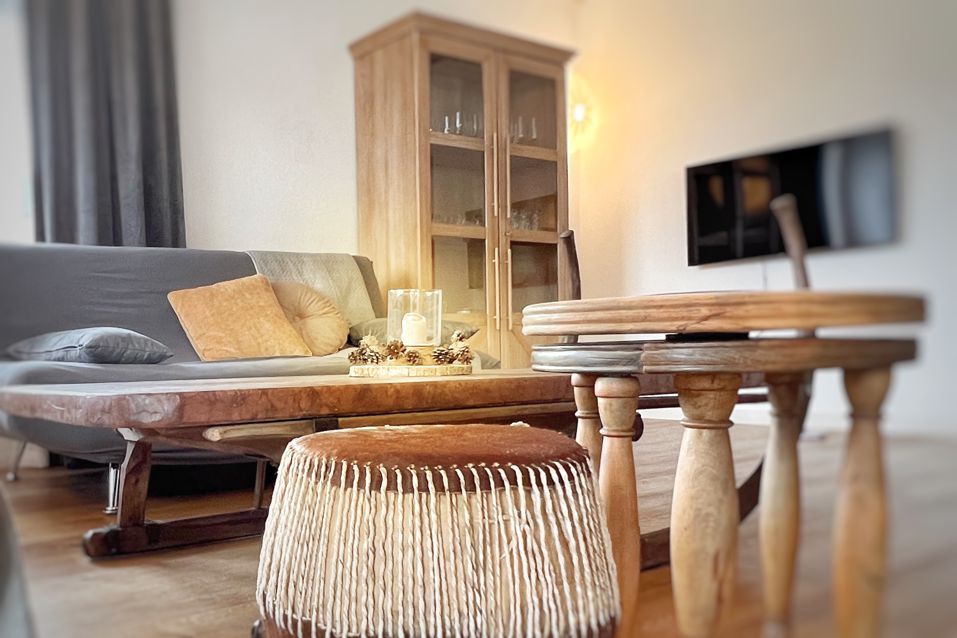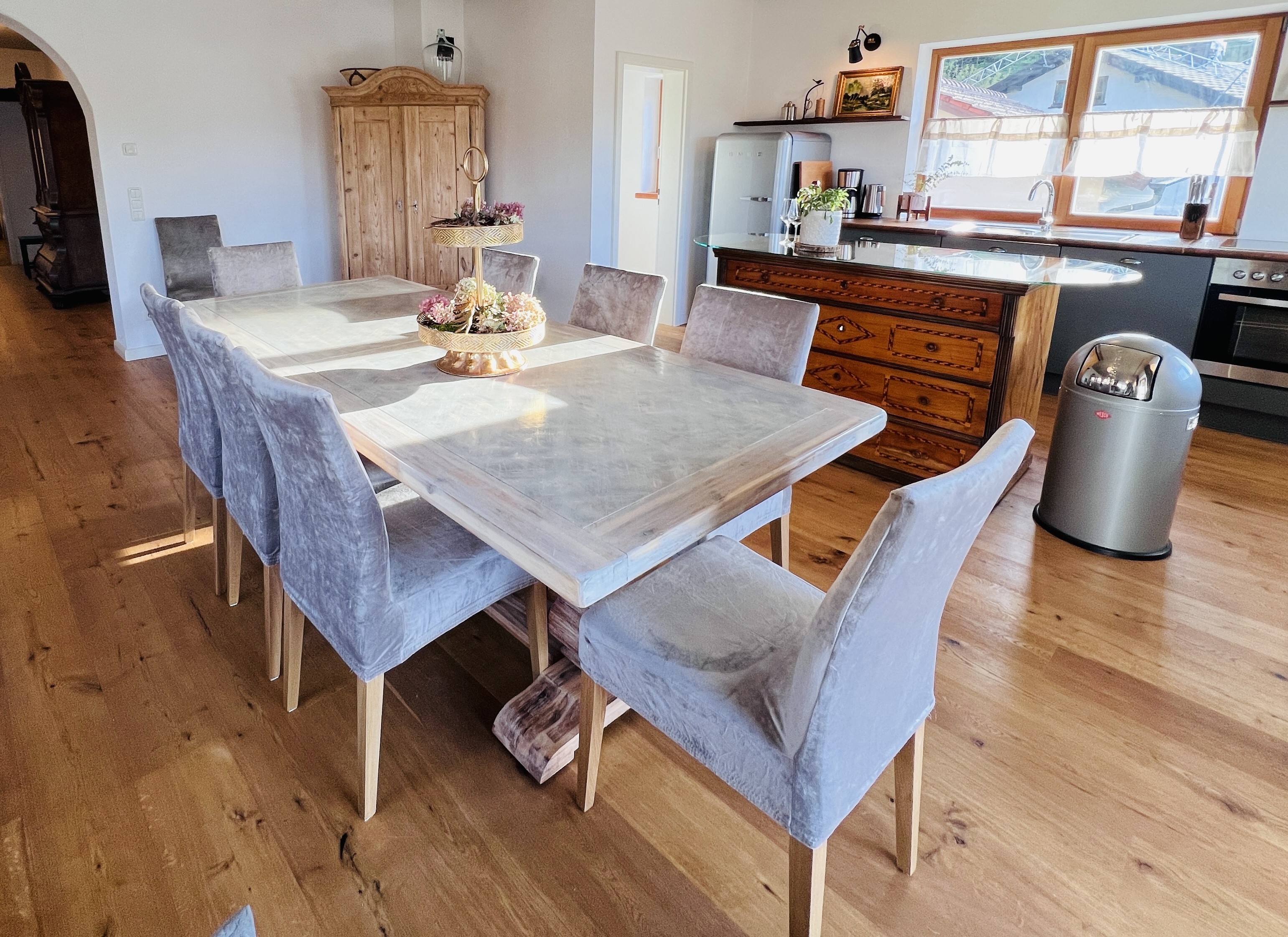 Der Wohnbereich, mit seinem großzügigen Tisch mit 10  Polsterstühlen  (2,50 x 0,95) im Zentrum, lädt zum geselligen Miteinander ein. Dort angrenzend befindet sich die moderne, gut ausgestattete Küchenzeile. Sie ist mit Geschirrspülmaschine, Backofen, Ceranfeld, Toaster, Wasserkocher und Kaffeeautomat ausgestattet. Ein antike Kommode  wurde  als Küchenblock umgestaltet und ergänzt nun als Kontrapunkt die moderne Küche. Im Wohnbereich laden zwei große Sofas zum Verweilen ein. Bei Bedarf können diese auch als Schlafplätze genützt werden.