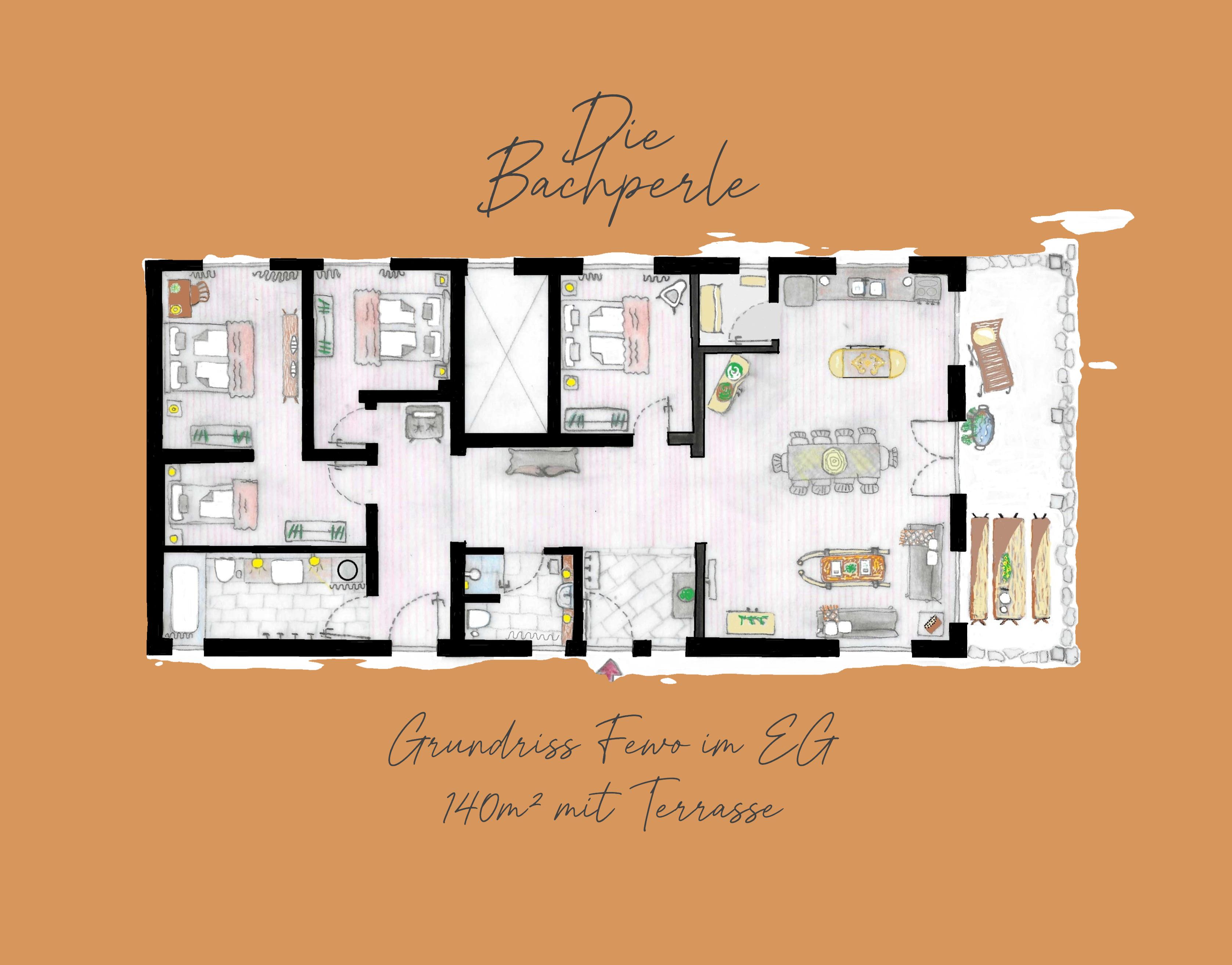Die Fewo Bachperle mit Terrasse erstreckt sich auf das gesamten Erdgeschoss und ist für bis zu 9 Personen buchbar. im gleichen Ferienhaus  im Obergeschoss befindet sich eine zweite Fewo Bachperle mit Balkon, die für  bis zu 10 Personen  extra zu buchen ist. So finden bis zu 19 Personen bequem im Ferienhaus Bachperle Platz.  Jede Fewo hat einen eigenen Eingang, sodass sich das Ferienhaus ideal für gemeinsam reisende Familien oder Freunde eignet, die trotzdem Wert auf eine eigene Privatsphäre legen.