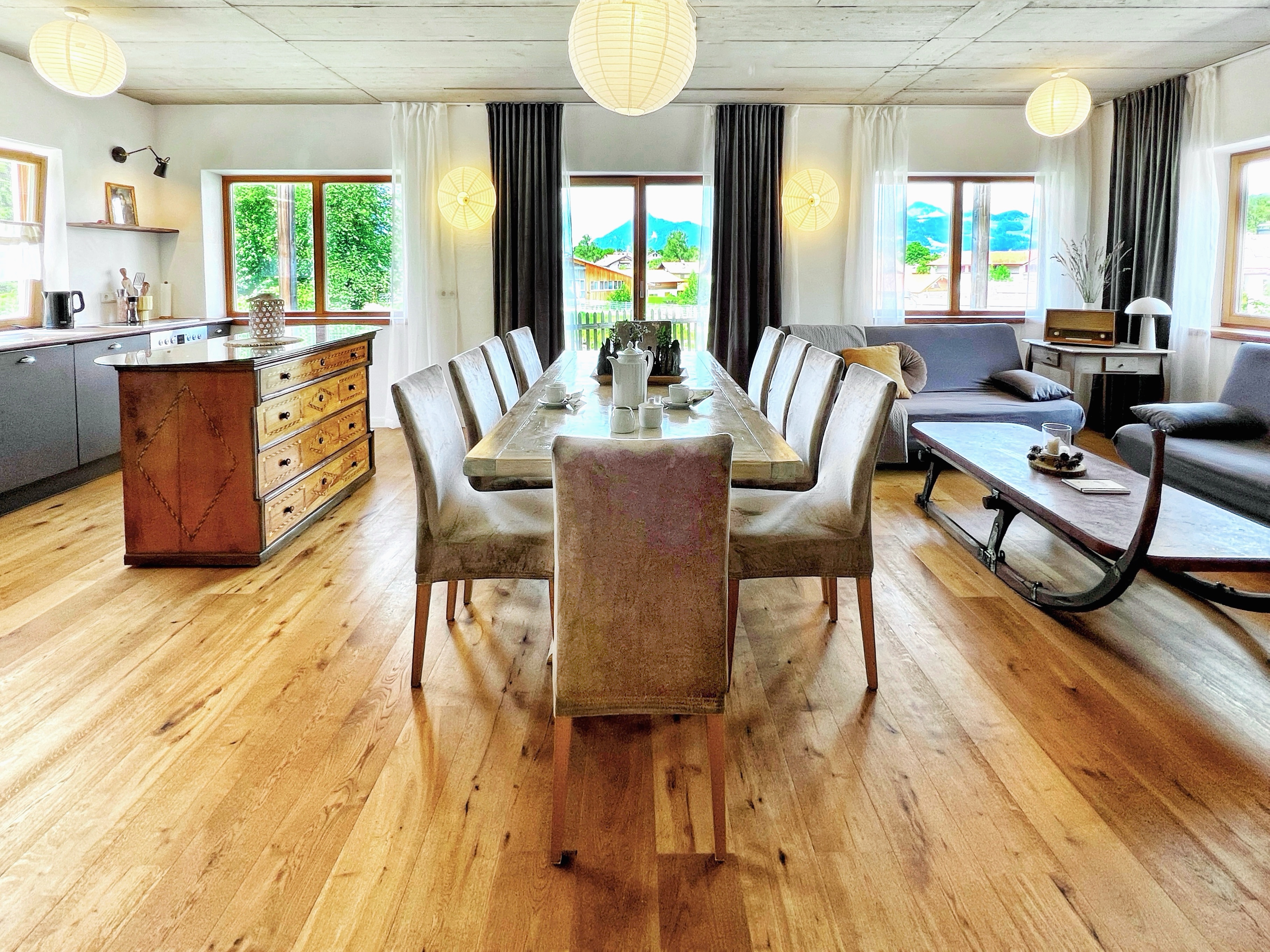 Wir haben eine großzügige Wohnung, die durch ihre zentrale und gleichzeitig naturnahe Lage als Top-Angebot für Alltag und Freizeit in allen Bereichen punktet.  Planen Sie einen Skiurlaub mit Freunden oder Wanderurlaub mit der befreundeten Familie oder mit den Großeltern – hier in den Bergen und am Wasser, in unserem liebevollen Alpen-Domizil, findet ein jeder Abstand vom hektischen Alltag. Im Winter auf die Skipisten oder die Loipe starten oder daheim mit Bergblick entspannen.  Das Ferienhaus hat zwei  Ferienwohnungen mit separatem Eingang. Eine Ferienwohnung mit  150m²  mit großem Balkon mit Panoramablick befindet sich im Obergeschossun d eine  Ferienwohnung mit 140m²  mit Terasse und Bachblick befindet sich im Erdgeschoss.