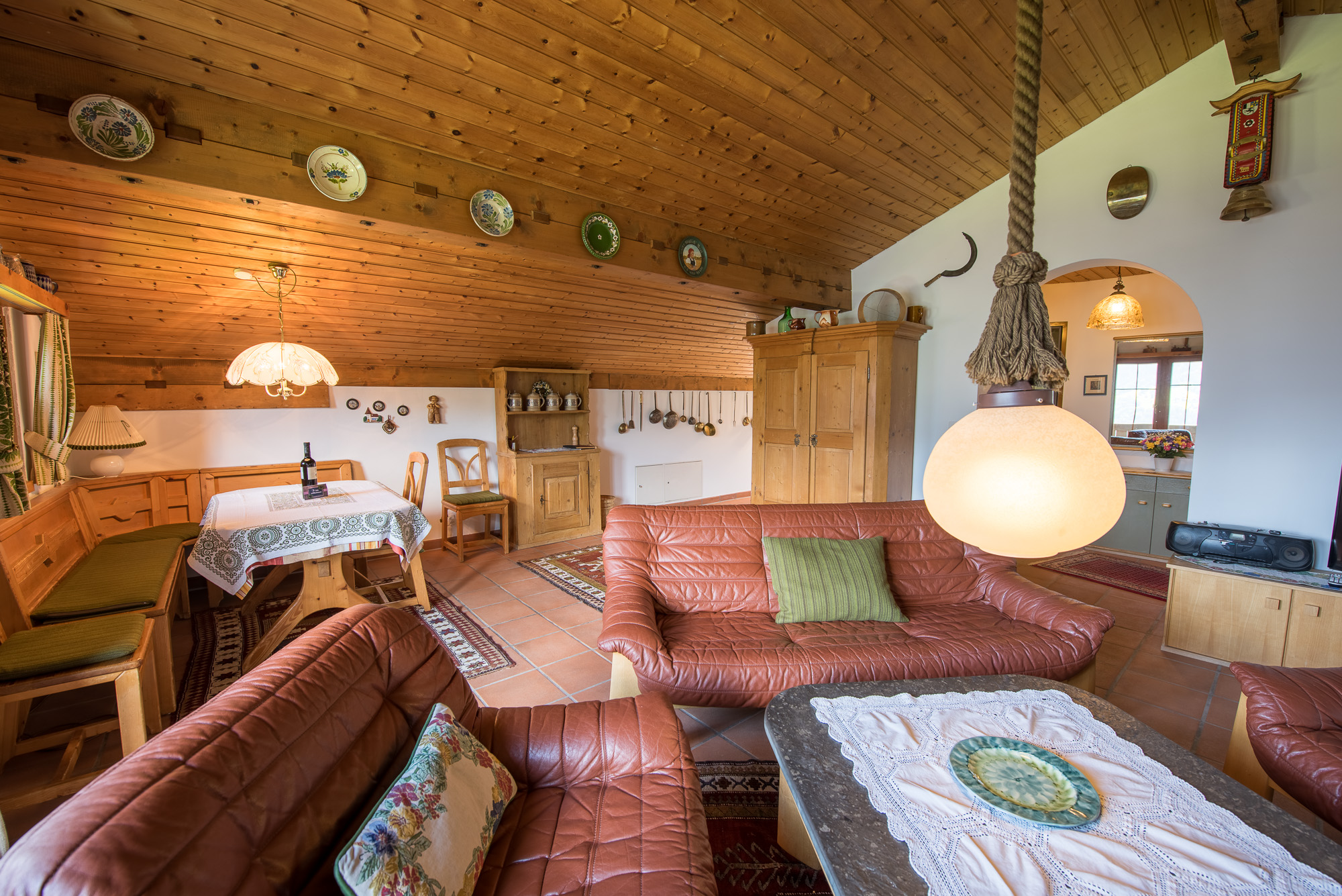 Wohn-/ Esszimmer mit Lederpolstergruppe, Essecke und Cheminée.